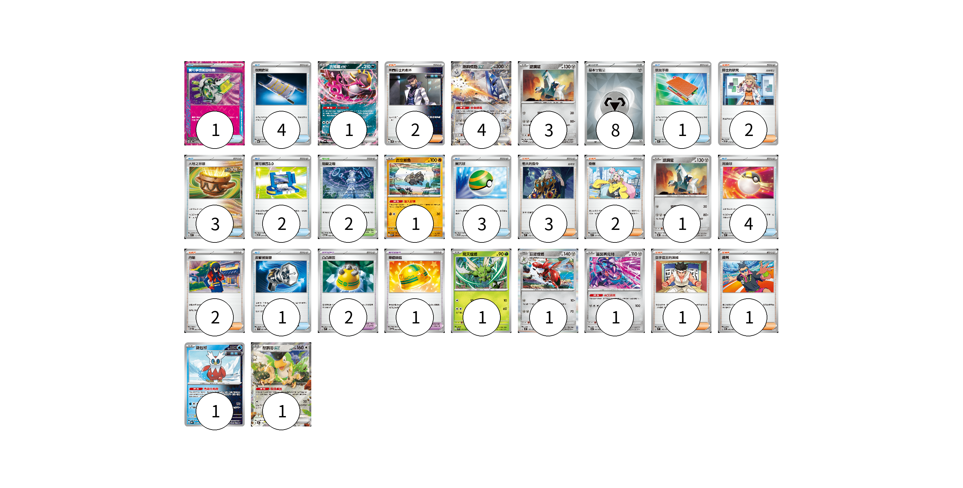 牌組構築方案 以此牌組為基礎新構築牌組 顯示卡面 顯示列表 寶可夢卡(15) 1 4 3 1 1 1 1 1 1 1 寶可夢道具(3) 2 1 物品卡(19) 1 4 1 3 2 3 4 1 支援者卡(13) 2 2 3 2 2 1 1 競技場卡(2) 2 能量卡(8) 8 寶可夢卡(15) 卡牌名稱 張數 卡牌名稱 張數 吉雉雞ex SV6a 038/064 01 鋁鋼橋龍ex SV7a 037/064 04 鋁鋼龍 SV7 072/102 03 古空棘魚 SV5K 034/071 01 鋁鋼龍 SV8a 112/187 01 飛天螳螂 SV5M 001/071 01 巨鉗螳螂 SV4a 129/190 01 蓋諾賽克特 SV6a 040/064 01 鐵包袱 SV8a 047/187 01 怒鸚哥ex SV4a 154/190 01 寶可夢道具(3) 卡牌名稱 張數 卡牌名稱 張數 凸凸頭盔 SVM 141/175 02 幸運頭盔 SV5a 060/066 01 物品卡(19) 卡牌名稱 張數 卡牌名稱 張數 寶可夢旋風回收機 SV6 093/101 01 夜間擔架 SV6a 056/064 04 朋友手冊 SV1S 069/078 01 大地之容器 SVK 012/042 03 寶可裝置3.0 SVTL 014/021 02 巢穴球 SVTG 012/019 03 高級球 SVK 018/042 04 反擊捕捉器 SV4M 059/066 01 支援者卡(13) 卡牌名稱 張數 卡牌名稱 張數 弗圖博士的劇本 SV4M 065/066 02 博士的研究 SVTS 019/022 02 老大的指令 SVM 172/175 03 奇樹 SVK 031/042 02 丹瑜 SV6 097/101 02 空手道王的演練 SVM 143/175 01 裁判 SV9a 062/063 01 競技場卡(2) 卡牌名稱 張數 卡牌名稱 張數 阻礙之塔 SV6 100/101 02 能量卡(8) 卡牌名稱 張數 卡牌名稱 張數 基本【鋼】能量 SVK MET 08 以此牌組為基礎新構築牌組 牌組編碼 jKmXFU-ktcCvq-jsvsGs copy 列印牌組單 牌組編碼已複製 分享至SNS