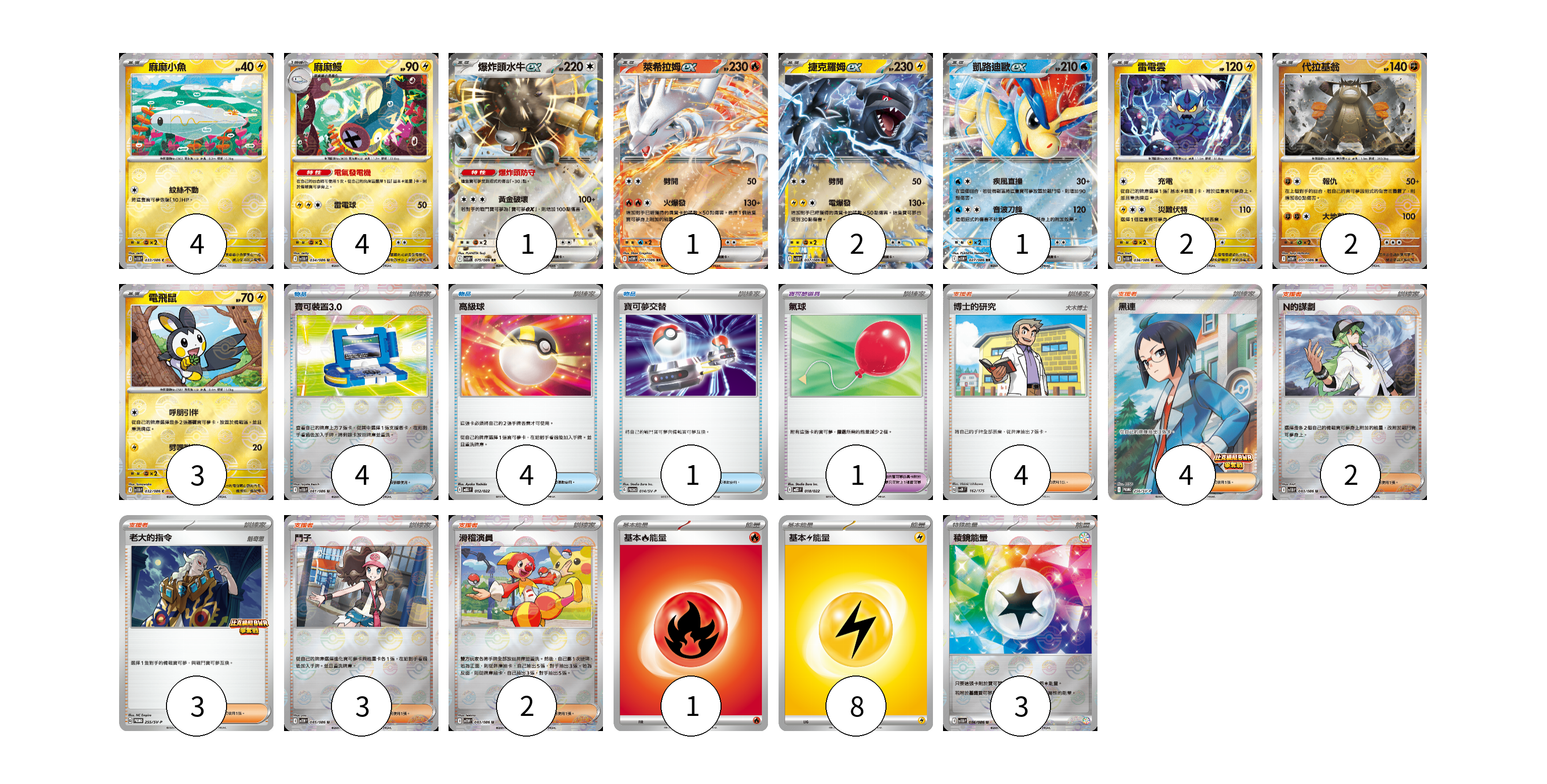 牌組構築方案 以此牌組為基礎新構築牌組 顯示卡面 顯示列表 寶可夢卡(20) 4 4 1 1 2 1 2 2 3 寶可夢道具(1) 1 物品卡(9) 4 4 1 支援者卡(18) 4 4 2 3 3 2 能量卡(12) 1 8 3 寶可夢卡(20) 卡牌名稱 張數 卡牌名稱 張數 麻麻小魚 SV11B 033/086 04 麻麻鰻 SV11B 034/086 04 爆炸頭水牛ex SV11W 075/086 01 萊希拉姆ex SV11W 017/086 01 捷克羅姆ex SV11B 037/086 02 凱路迪歐ex SV11W 027/086 01 雷電雲 SV11B 036/086 02 代拉基翁 SV11W 051/086 02 電飛鼠 SV11B 032/086 03 寶可夢道具(1) 卡牌名稱 張數 卡牌名稱 張數 氣球 MBD 018/022 01 物品卡(9) 卡牌名稱 張數 卡牌名稱 張數 寶可裝置3.0 SV11B 081/086 04 高級球 MBG 012/022 04 寶可夢交替 SV-P 014/SV-P 01 支援者卡(18) 卡牌名稱 張數 卡牌名稱 張數 博士的研究 SVM 162/175 04 黑連 SV-P 256/SV-P 04 N的謀劃 SV11B 083/086 02 老大的指令 SV-P 255/SV-P 03 鬥子 SV11W 085/086 03 滑稽演員 SV11W 083/086 02 能量卡(12) 卡牌名稱 張數 卡牌名稱 張數 基本火能量 sv-p FIR 01 基本雷能量 sv-p LIG 08 稜鏡能量 SV11B 086/086 03 以此牌組為基礎新構築牌組 牌組編碼 jNxdmj-tWOkpE-GfLBSK copy 列印牌組單 牌組編碼已複製 分享至SNS