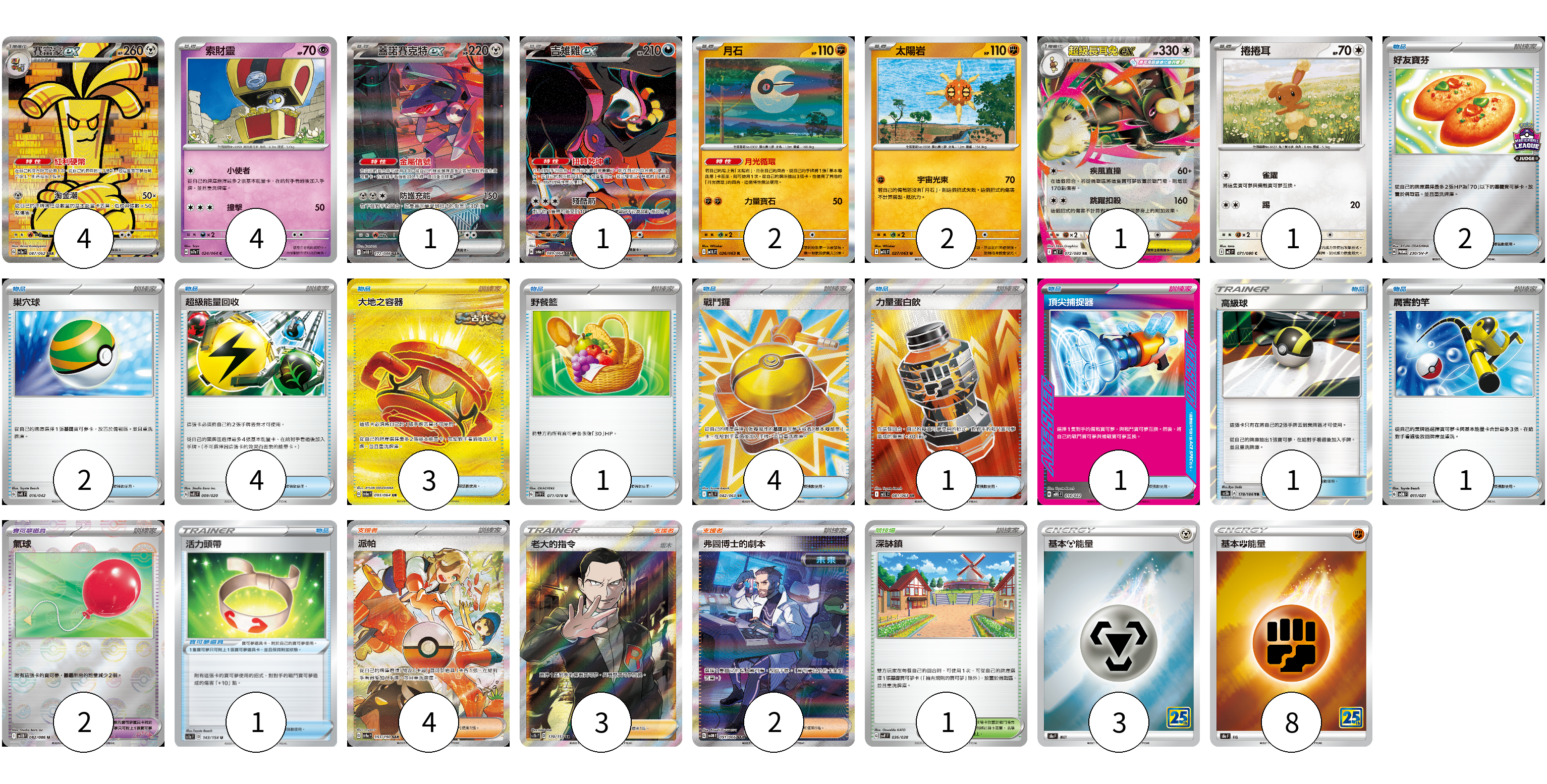 牌組構築方案 以此牌組為基礎新構築牌組 顯示卡面 顯示列表 寶可夢卡(16) 4 4 1 1 2 2 1 1 寶可夢道具(3) 2 1 物品卡(20) 2 2 4 3 1 4 1 1 1 1 支援者卡(9) 4 3 2 競技場卡(1) 1 能量卡(11) 3 8 寶可夢卡(16) 卡牌名稱 張數 卡牌名稱 張數 賽富豪ex SV3a 087/062 04 索財靈 SV7a 024/064 04 蓋諾賽克特ex SV11B 172/086 01 吉雉雞ex SV6a 089/064 01 月石 M1L 026/063 02 太陽岩 M1L 027/063 02 超級長耳兔ex M2 072/080 01 捲捲耳 M2 071/080 01 寶可夢道具(3) 卡牌名稱 張數 卡牌名稱 張數 氣球 SV11B 082/086 02 活力頭帶 SC1a 143/154 01 物品卡(20) 卡牌名稱 張數 卡牌名稱 張數 好友寶芬 SV-P 230/SV-P 02 巢穴球 SVK 016/042 02 超級能量回收 SVEL 009/020 04 大地之容器 SV6a 093/064 03 野餐籃 SV1V 071/078 01 戰鬥鑼 M1L 082/063 04 力量蛋白飲 M1L 081/063 01 頂尖捕捉器 MBG 014/022 01 高級球 AS5b 178/186 01 厲害釣竿 SVOM 011/021 01 支援者卡(9) 卡牌名稱 張數 卡牌名稱 張數 派帕 SV4a 353/190 04 老大的指令(坂木) SC1b 170/153 03 弗圖博士的劇本 SV4M 091/066 02 競技場卡(1) 卡牌名稱 張數 卡牌名稱 張數 深缽鎮 SVF 036/038 01 能量卡(11) 卡牌名稱 張數 卡牌名稱 張數 基本鋼能量 S8a MET 03 基本鬥能量 S8a FIG 08 以此牌組為基礎新構築牌組 牌組編碼 jPamNi-sHgVUj-hhkNwn copy 列印牌組單 牌組編碼已複製 分享至SNS
