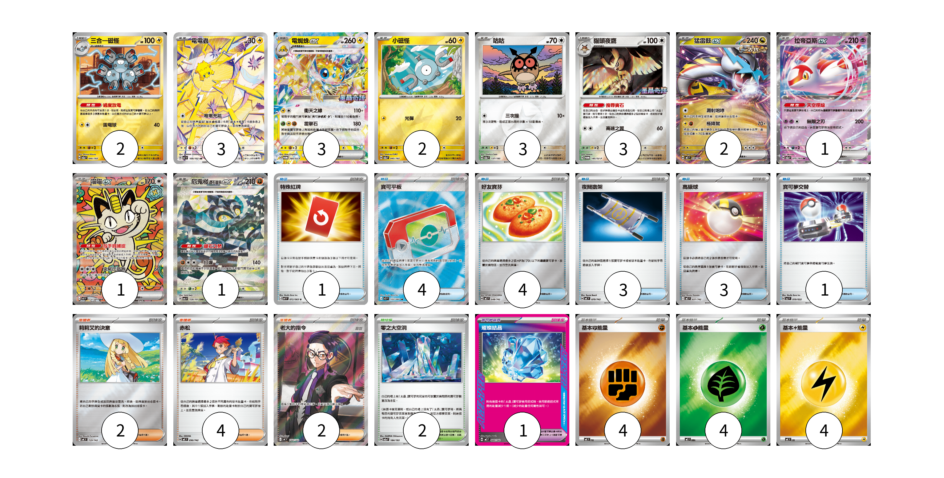 牌組構築方案 以此牌組為基礎新構築牌組 顯示卡面 顯示列表 寶可夢卡(21) 2 3 3 2 3 3 2 1 1 1 寶可夢道具(1) 1 物品卡(16) 1 4 4 3 3 1 支援者卡(8) 2 4 2 競技場卡(2) 2 能量卡(12) 4 4 4 寶可夢卡(21) 卡牌名稱 張數 卡牌名稱 張數 三合一磁怪 M2a 046/193 02 電電蟲 SV7 108/102 03 電蜘蛛ex SV-P 144/SV-P 03 小磁怪 M2a 045/193 02 咕咕 M2a 137/193 03 貓頭夜鷹 SV-P 145/SV-P 03 猛雷鼓ex MC 554/742 02 拉帝亞斯ex M2a 075/193 01 喵喵ex M3 114/080 01 厄鬼椪 礎石面具ex SV6 128/101 01 寶可夢道具(1) 卡牌名稱 張數 卡牌名稱 張數 璀璨結晶 MC 680/742 01 物品卡(16) 卡牌名稱 張數 卡牌名稱 張數 特殊紅牌 M4 072/083 01 寶可平板 M3 103/080 04 好友寶芬 MC 648/742 04 夜間擔架 MC 670/742 03 高級球 MC 651/742 03 寶可夢交替 MJ 019/022 01 支援者卡(8) 卡牌名稱 張數 卡牌名稱 張數 莉莉艾的決意 MC 729/742 02 赤松 MC 696/742 04 老大的指令(烏羽) MC 760/742 02 競技場卡(2) 卡牌名稱 張數 卡牌名稱 張數 零之大空洞 M2a 184/193 02 能量卡(12) 卡牌名稱 張數 卡牌名稱 張數 基本【鬥】能量 MC FIG 04 基本【草】能量 MC GRA 04 基本【雷】能量 MC LIG 04 以此牌組為基礎新構築牌組 牌組編碼 jPhWKi-RwgBGT-wvyUCv copy 列印牌組單 牌組編碼已複製 分享至SNS