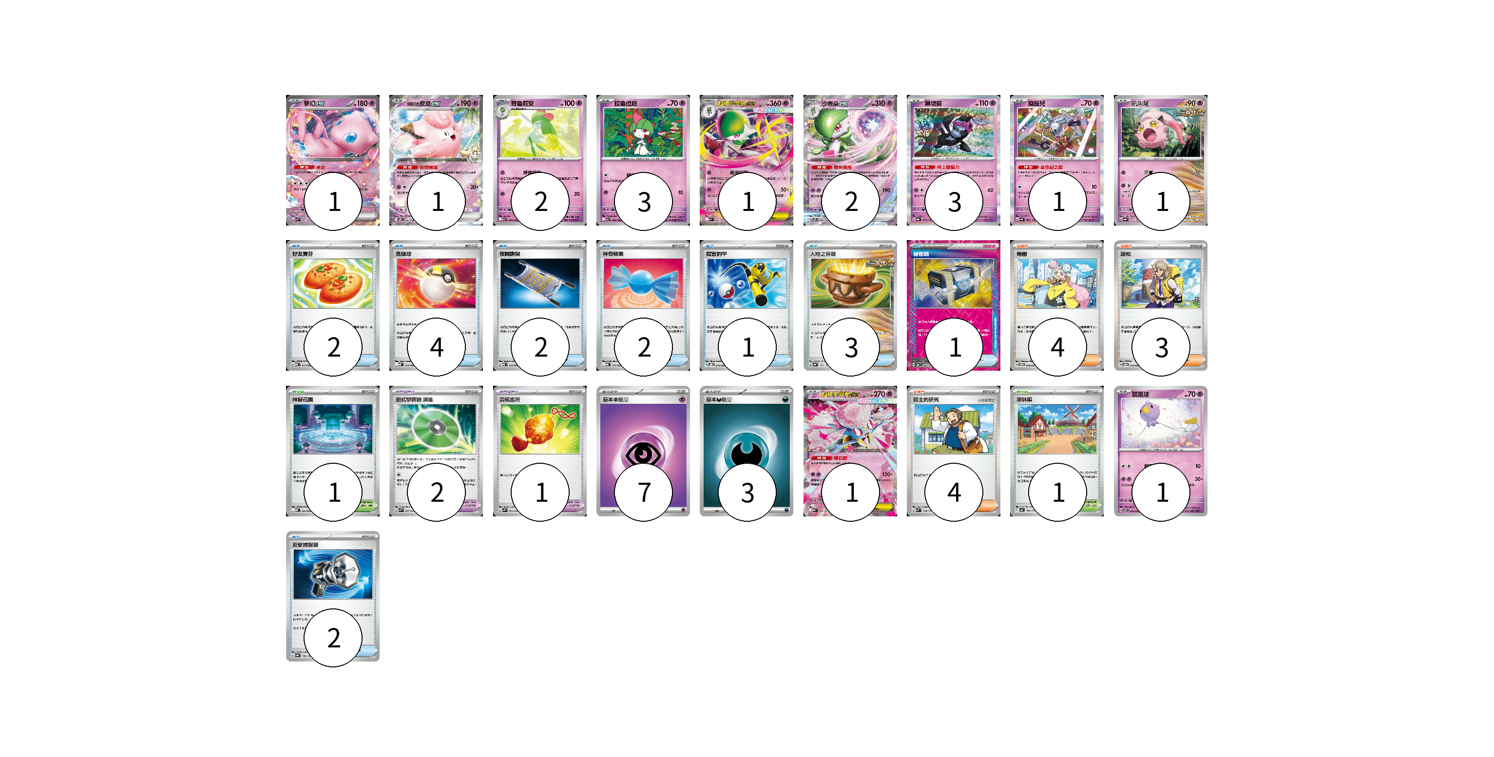 牌組構築方案 以此牌組為基礎新構築牌組 顯示卡面 顯示列表 寶可夢卡(17) 1 1 2 3 1 2 3 1 1 1 1 寶可夢道具(3) 2 1 物品卡(17) 2 4 2 2 1 3 1 2 支援者卡(11) 4 3 4 競技場卡(2) 1 1 能量卡(10) 7 3 寶可夢卡(17) 卡牌名稱 張數 卡牌名稱 張數 夢幻ex SVK 001/042 01 莉莉艾的皮皮ex SV9 033/100 01 奇魯莉安 M1S 041/063 02 拉魯拉絲 M1S 040/063 03 超級沙奈朵ex M1S 042/063 01 沙奈朵ex SVTS 004/022 02 願增猿 SV8a 075/187 03 鑰圈兒 SV4a 087/190 01 吼叫尾 SV8a 071/187 01 超級蒂安希ex MBD 006/022 01 飄飄球 SVTS 005/022 01 寶可夢道具(3) 卡牌名稱 張數 卡牌名稱 張數 招式學習器 演進 SVK 025/042 02 勇氣護符 SVK 024/042 01 物品卡(17) 卡牌名稱 張數 卡牌名稱 張數 好友寶芬 MBD 013/022 02 高級球 MBD 014/022 04 夜間擔架 MBD 016/022 02 神奇糖果 MBG 013/022 02 厲害釣竿 SVOD 010/020 01 大地之容器 SV8a 143/187 03 秘密箱 SV6 092/101 01 反擊捕捉器 SV8a 139/187 02 支援者卡(11) 卡牌名稱 張數 卡牌名稱 張數 奇樹 SVOM 018/021 04 派帕 SVOD 018/020 03 博士的研究 SVM 164/175 04 競技場卡(2) 卡牌名稱 張數 卡牌名稱 張數 神秘花園 MBD 022/022 01 深缽鎮 SV4a 185/190 01 能量卡(10) 卡牌名稱 張數 卡牌名稱 張數 基本超能量 sv-p PSY 07 基本惡能量 sv-p DAR 03 以此牌組為基礎新構築牌組 牌組編碼 jPwuFw-huZDzA-lxBIjX copy 列印牌組單 牌組編碼已複製 分享至SNS