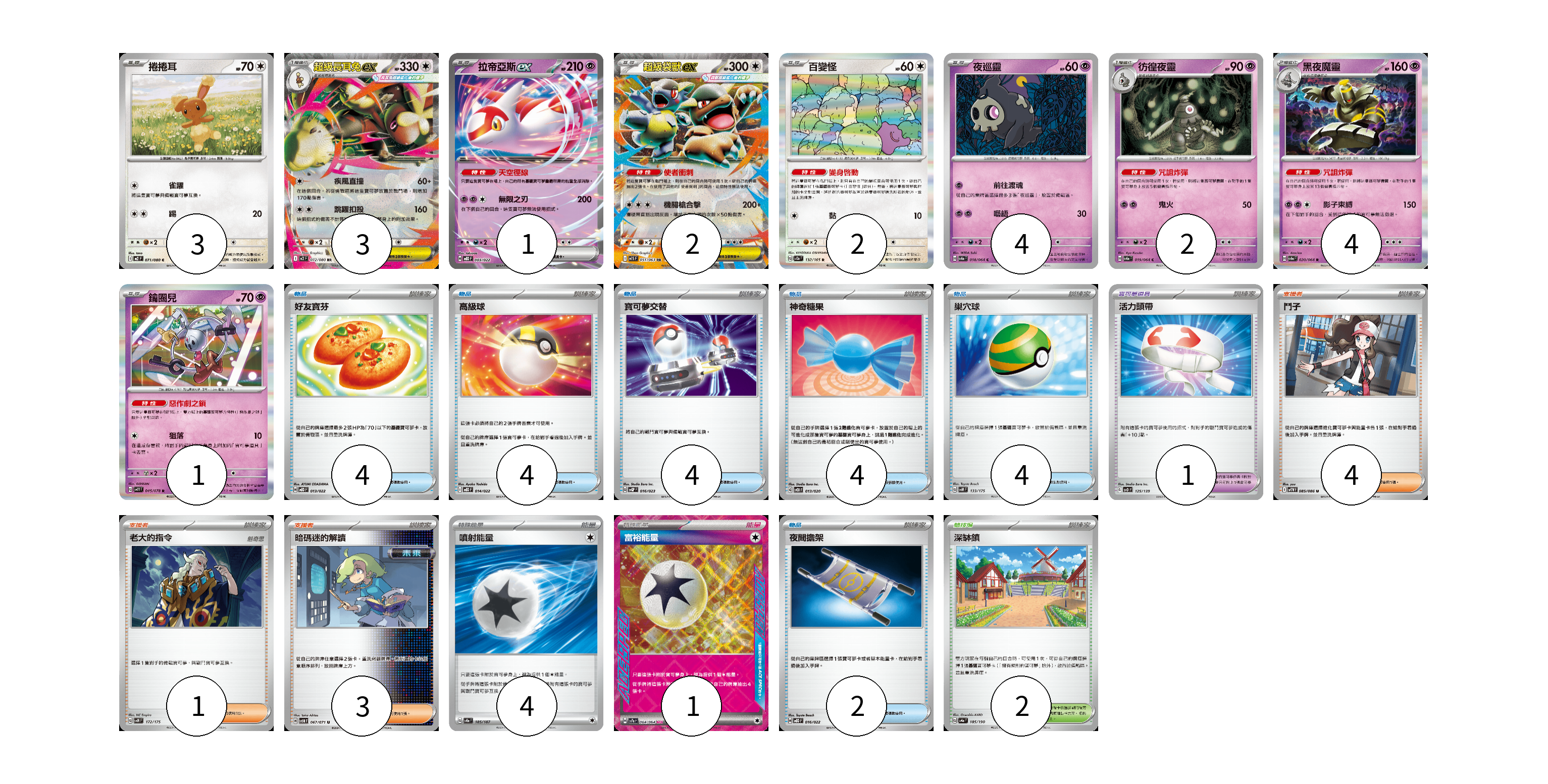 牌組構築方案 以此牌組為基礎新構築牌組 顯示卡面 顯示列表 寶可夢卡(22) 3 3 1 2 2 4 2 4 1 寶可夢道具(1) 1 物品卡(22) 4 4 4 4 4 2 支援者卡(8) 4 1 3 競技場卡(2) 2 能量卡(5) 4 1 寶可夢卡(22) 卡牌名稱 張數 卡牌名稱 張數 捲捲耳 M2 071/080 03 超級長耳兔ex M2 072/080 03 拉帝亞斯ex MBD 003/022 01 超級袋獸ex M1S 051/063 02 百變怪 SV2a 132/165 02 夜巡靈 SV6a 018/064 04 彷徨夜靈 SV6a 019/064 02 黑夜魔靈 SV6a 020/064 04 鑰圈兒 SV1V 045/078 01 寶可夢道具(1) 卡牌名稱 張數 卡牌名稱 張數 活力頭帶 SVD 125/139 01 物品卡(22) 卡牌名稱 張數 卡牌名稱 張數 好友寶芬 MBD 013/022 04 高級球 MBD 014/022 04 寶可夢交替 SVQP 016/023 04 神奇糖果 SVOD 013/020 04 巢穴球 SVM 133/175 04 夜間擔架 MBD 016/022 02 支援者卡(8) 卡牌名稱 張數 卡牌名稱 張數 鬥子 SV11W 085/086 04 老大的指令 SVM 172/175 01 暗碼迷的解讀 SV5M 067/071 03 競技場卡(2) 卡牌名稱 張數 卡牌名稱 張數 深缽鎮 SV4a 185/190 02 能量卡(5) 卡牌名稱 張數 卡牌名稱 張數 噴射能量 SV8a 185/187 04 富裕能量 SV7a 064/064 01 以此牌組為基礎新構築牌組 牌組編碼 jShqtj-YasyBZ-wubrZv copy 列印牌組單 牌組編碼已複製 分享至SNS