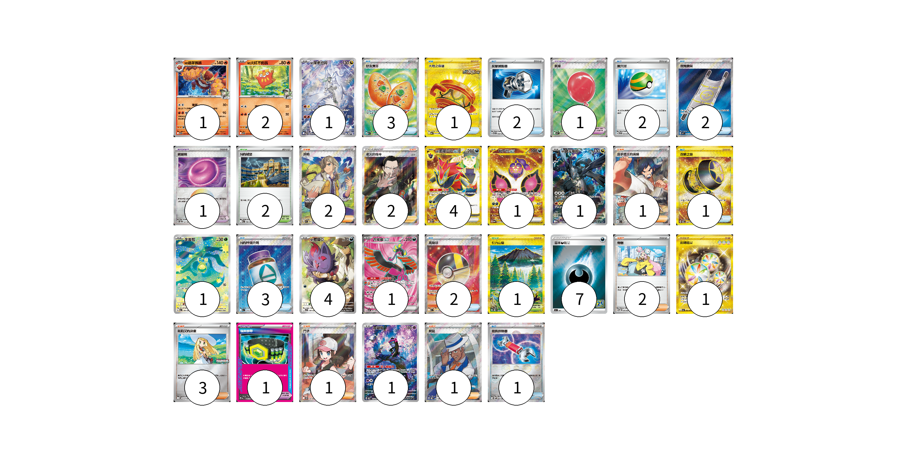 牌組構築方案 以此牌組為基礎新構築牌組 顯示卡面 顯示列表 寶可夢卡(17) 1 2 1 4 1 1 1 4 1 1 寶可夢道具(3) 1 1 1 物品卡(17) 3 1 2 2 2 1 3 2 1 支援者卡(12) 2 2 1 2 3 1 1 競技場卡(3) 2 1 能量卡(8) 7 1 寶可夢卡(17) 卡牌名稱 張數 卡牌名稱 張數 N的達摩狒狒 SV9 016/100 01 N的火紅不倒翁 SV9 015/100 02 N的萊希拉姆 SV9 109/100 01 N的索羅亞克ex SV9 131/100 04 桃歹郎ex SV6a 092/064 01 N的捷克羅姆 M2a 210/193 01 含羞苞 M2a 196/193 01 N的索羅亞 SV9 108/100 04 吉雉雞ex SV6a 081/064 01 願增猿 SV6 107/101 01 寶可夢道具(3) 卡牌名稱 張數 卡牌名稱 張數 氣球 M1L 084/063 01 鎖鏈糬 SV8a 154/187 01 極限腰帶 MC 691/742 01 物品卡(17) 卡牌名稱 張數 卡牌名稱 張數 好友寶芬 M1S 081/063 03 大地之容器 SV6a 093/064 01 反擊捕捉器 SVTS 009/022 02 巢穴球 SVTR 013/021 02 夜間擔架 M1L 083/063 02 改造之錘 SV6 132/101 01 N的PP提升劑 M2a 214/193 03 高級球 M2a 216/193 02 道具拆除器 SV11W 080/086 01 支援者卡(12) 卡牌名稱 張數 卡牌名稱 張數 派帕 SV1V 099/078 02 老大的指令(坂木) SC1b 170/153 02 空手道王的演練 M2a 220/193 01 奇樹 SVOD 016/020 02 莉莉艾的決意 M-P 011/M-P 03 鬥子 SV11W 166/086 01 席藍 SV8 127/106 01 競技場卡(3) 卡牌名稱 張數 卡牌名稱 張數 N的城堡 M2a 181/193 02 引力山岳 SV8 138/106 01 能量卡(8) 卡牌名稱 張數 卡牌名稱 張數 基本惡能量 S8a DAR 07 反轉能量 SV3a 092/062 01 以此牌組為基礎新構築牌組 牌組編碼 jUCQtR-ksgLls-iGsbUc copy 列印牌組單 牌組編碼已複製 分享至SNS