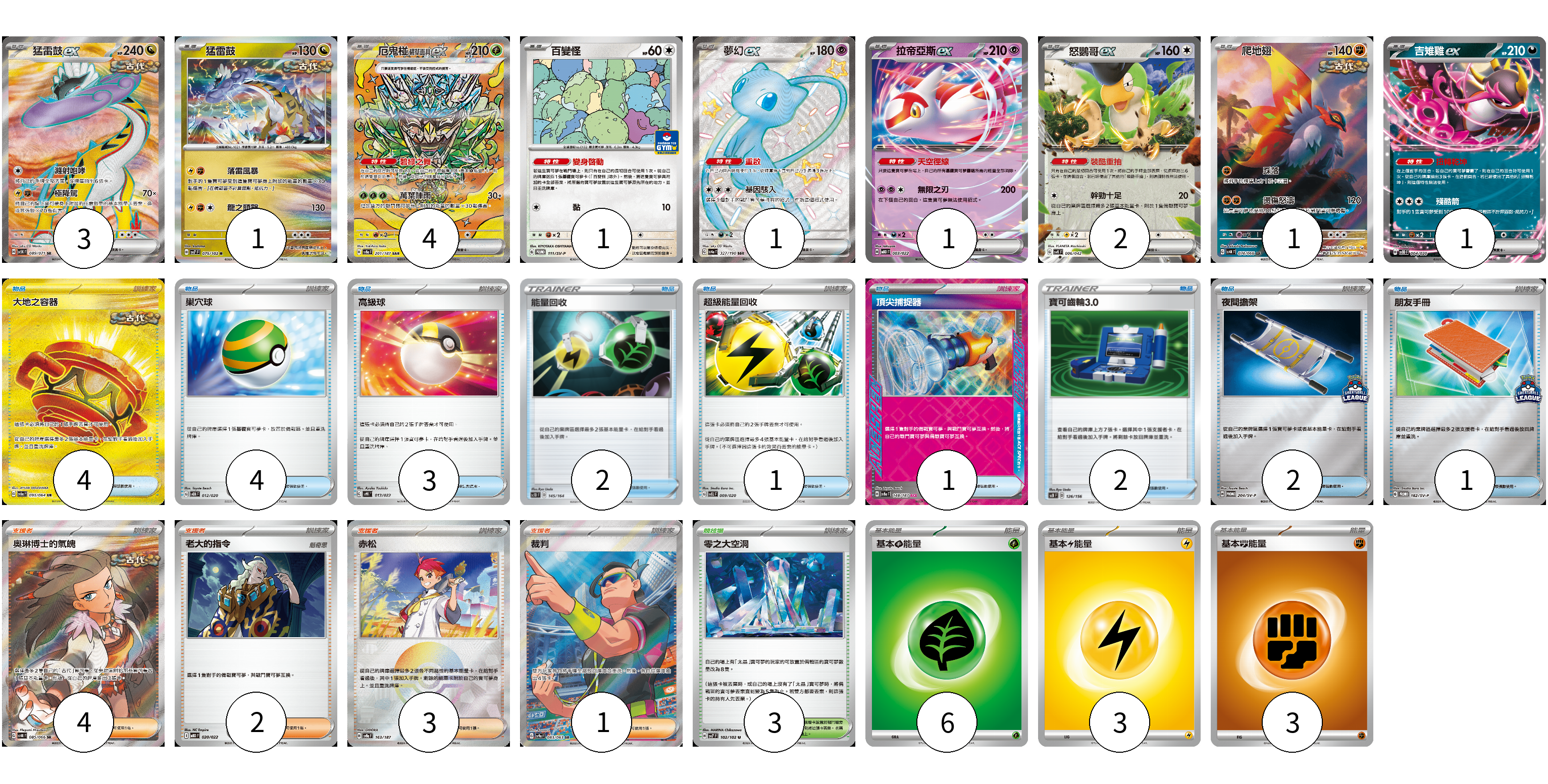 牌組構築方案 以此牌組為基礎新構築牌組 顯示卡面 顯示列表 寶可夢卡(15) 3 1 4 1 1 1 2 1 1 物品卡(20) 4 4 3 2 1 1 2 2 1 支援者卡(10) 4 2 3 1 競技場卡(3) 3 能量卡(12) 6 3 3 寶可夢卡(15) 卡牌名稱 張數 卡牌名稱 張數 猛雷鼓ex SV5K 089/071 03 猛雷鼓 SV7 075/102 01 厄鬼椪 碧草面具ex SV8a 201/187 04 百變怪 SV-P 111/SV-P 01 夢幻ex SV4a 327/190 01 拉帝亞斯ex MBD 003/022 01 怒鸚哥ex SVK 006/042 02 爬地翅 SV4K 074/066 01 吉雉雞ex SVOD 004/020 01 物品卡(20) 卡牌名稱 張數 卡牌名稱 張數 大地之容器 SV6a 093/064 04 巢穴球 SVEM 012/020 04 高級球 SVHK 013/022 03 能量回收 SC1D 145/164 02 超級能量回收 SVEL 009/020 01 頂尖捕捉器 SV8a 148/187 01 寶可齒輪3.0 SCB 126/156 02 夜間擔架 SV-P 204/SV-P 02 朋友手冊 SV-P 182/SV-P 01 支援者卡(10) 卡牌名稱 張數 卡牌名稱 張數 奧琳博士的氣魄 SV4K 085/066 04 老大的指令 MBD 020/022 02 赤松 SV8a 163/187 03 裁判 SV9a 083/063 01 競技場卡(3) 卡牌名稱 張數 卡牌名稱 張數 零之大空洞 SV7 102/102 03 能量卡(12) 卡牌名稱 張數 卡牌名稱 張數 基本草能量 sv-p GRA 06 基本雷能量 sv-p LIG 03 基本【鬥】能量 SVAM FIG 03 以此牌組為基礎新構築牌組 牌組編碼 jWRvcn-gjfndC-aITYYl copy 列印牌組單 牌組編碼已複製 分享至SNS