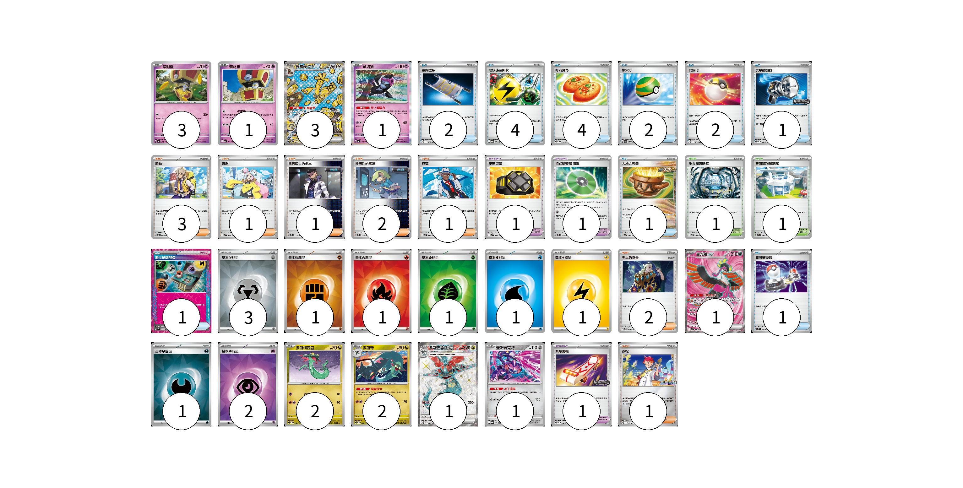 牌組構築方案 以此牌組為基礎新構築牌組 顯示卡面 顯示列表 寶可夢卡(15) 3 1 3 1 1 2 2 1 1 寶可夢道具(3) 1 1 1 物品卡(18) 2 4 4 2 2 1 1 1 1 支援者卡(11) 3 1 1 2 1 2 1 競技場卡(2) 1 1 能量卡(11) 3 1 1 1 1 1 1 2 寶可夢卡(15) 卡牌名稱 張數 卡牌名稱 張數 索財靈 SV8a 073/187 03 索財靈 SV7a 024/064 01 賽富豪ex SV8a 220/187 03 願增猿 SV8a 075/187 01 吉雉雞ex SV6a 081/064 01 多龍梅西亞 SV6 079/101 02 多龍奇 SV6 080/101 02 多龍巴魯托ex SV6 120/101 01 蓋諾賽克特 SV6a 040/064 01 寶可夢道具(3) 卡牌名稱 張數 卡牌名稱 張數 硬硬束帶 SVM 139/175 01 招式學習器 演進 SV8a 160/187 01 緊急滑板 SV-P 140/SV-P 01 物品卡(18) 卡牌名稱 張數 卡牌名稱 張數 夜間擔架 SVOM 016/021 02 超級能量回收 SV8a 141/187 04 好友寶芬 SVOD 011/020 04 巢穴球 SVM 133/175 02 高級球 SVOD 012/020 02 反擊捕捉器 SV-P 136/SV-P 01 大地之容器 SV8a 143/187 01 能量輸送PRO SV7a 052/064 01 寶可夢交替 SVOD 014/020 01 支援者卡(11) 卡牌名稱 張數 卡牌名稱 張數 派帕 SVOD 018/020 03 奇樹 SVM 160/175 01 弗圖博士的劇本 SV8a 175/187 01 暗碼迷的解讀 SV8a 165/187 02 席藍 SV8 102/106 01 老大的指令 SVOD 019/020 02 赤松 SV-P 150/SV-P 01 競技場卡(2) 卡牌名稱 張數 卡牌名稱 張數 全金屬實驗室 SVTH 018/018 01 寶可夢聯盟總部 SV4a 186/190 01 能量卡(11) 卡牌名稱 張數 卡牌名稱 張數 基本【鋼】能量 SVOD MET 03 基本【鬥】能量 SVK FIG 01 基本【火】能量 SVK FIR 01 基本【草】能量 SVK GRA 01 基本【水】能量 SVD WAT 01 基本【雷】能量 SVD LIG 01 基本【惡】能量 SVOM DAR 01 基本【超】能量 SVOD PSY 02 以此牌組為基礎新構築牌組 牌組編碼 jWnaYx-RgkRqf-gKyZTb copy 列印牌組單 牌組編碼已複製 分享至SNS