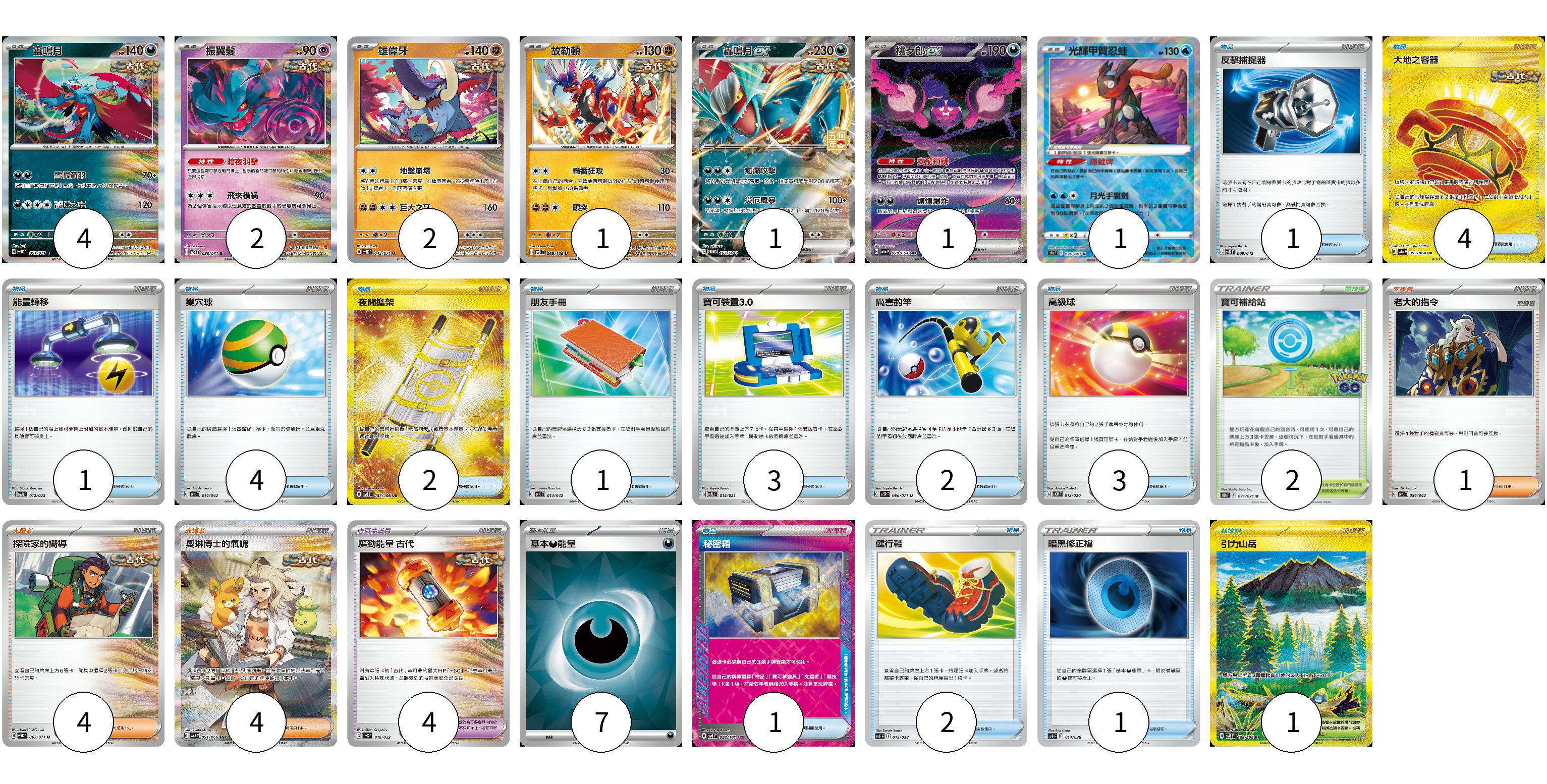 牌組構築方案 以此牌組為基礎新構築牌組 顯示卡面 顯示列表 寶可夢卡(12) 4 2 2 1 1 1 1 寶可夢道具(4) 4 物品卡(25) 1 4 1 4 2 1 3 2 3 1 2 1 支援者卡(9) 1 4 4 競技場卡(3) 2 1 能量卡(7) 7 寶可夢卡(12) 卡牌名稱 張數 卡牌名稱 張數 轟鳴月 SV5K 051/071 04 振翼髮 SV5K 033/071 02 雄偉牙 SV5K 042/071 02 故勒頓 SV8 069/106 01 轟鳴月ex SV-P 167/SV-P 01 桃歹郎ex SV6a 090/064 01 光輝甲賀忍蛙 S9a 026/067 01 寶可夢道具(4) 卡牌名稱 張數 卡牌名稱 張數 驅勁能量 古代 SVHK 016/022 04 物品卡(25) 卡牌名稱 張數 卡牌名稱 張數 反擊捕捉器 SVK 009/042 01 大地之容器 SV6a 093/064 04 能量轉移 SVAM 012/023 01 巢穴球 SVK 016/042 04 夜間擔架 SV8 137/106 02 朋友手冊 SVK 014/042 01 寶可裝置3.0 SVAL 015/021 03 厲害釣竿 SV2P 066/071 02 高級球 SVEM 013/020 03 秘密箱 SV6 092/101 01 健行鞋 SVF 015/038 02 暗黑修正檔 SVF 014/038 01 支援者卡(9) 卡牌名稱 張數 卡牌名稱 張數 老大的指令 SVK 036/042 01 探險家的嚮導 SV5K 067/071 04 奧琳博士的氣魄 SV4K 091/066 04 競技場卡(3) 卡牌名稱 張數 卡牌名稱 張數 寶可補給站 S10b 071/071 02 引力山岳 SV8 138/106 01 能量卡(7) 卡牌名稱 張數 卡牌名稱 張數 基本【惡】能量 SVK DAR 07 以此牌組為基礎新構築牌組 牌組編碼 jZnsmf-MYgOHE-vlpaXx copy 列印牌組單 牌組編碼已複製 分享至SNS