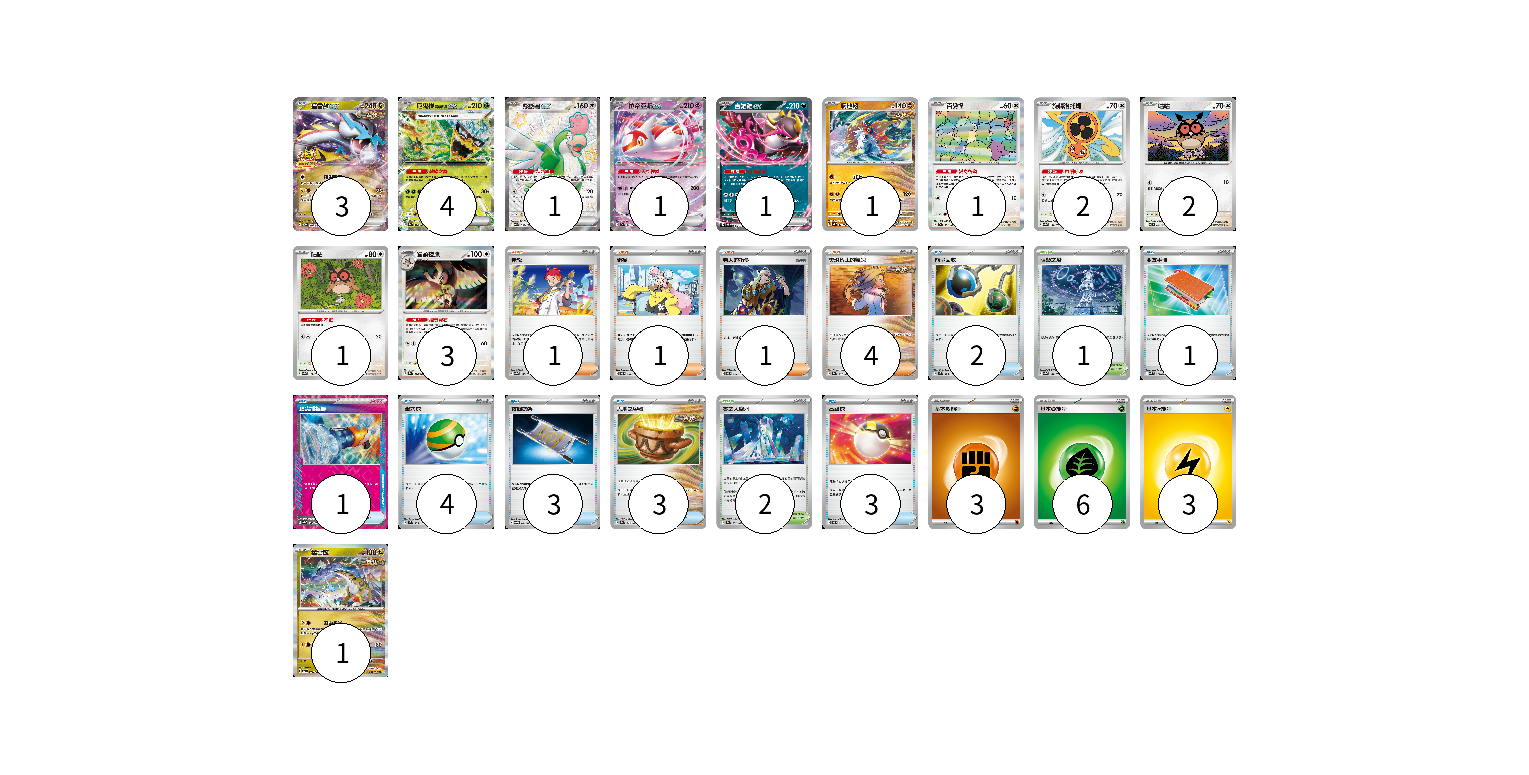 牌組構築方案 以此牌組為基礎新構築牌組 顯示卡面 顯示列表 寶可夢卡(21) 3 4 1 1 1 1 1 2 2 1 3 1 物品卡(17) 2 1 1 4 3 3 3 支援者卡(7) 1 1 1 4 競技場卡(3) 1 2 能量卡(12) 3 6 3 寶可夢卡(21) 卡牌名稱 張數 卡牌名稱 張數 猛雷鼓ex SV-P 081/SV-P 03 厄鬼椪 碧草面具ex SV8a 020/187 04 怒鸚哥ex SV4a 337/190 01 拉帝亞斯ex SV7a 019/064 01 吉雉雞ex SVOD 004/020 01 爬地翅 SV4K 041/066 01 百變怪 SV2a 132/165 01 旋轉洛托姆 SV8a 131/187 02 咕咕 SV7 076/102 02 咕咕 SV8a 127/187 01 貓頭夜鷹 SV8a 128/187 03 猛雷鼓 SV7 075/102 01 物品卡(17) 卡牌名稱 張數 卡牌名稱 張數 能量回收 SVM 125/175 02 朋友手冊 SVK 014/042 01 頂尖捕捉器 SV8a 148/187 01 巢穴球 SVM 133/175 04 夜間擔架 SVOM 016/021 03 大地之容器 SV8a 143/187 03 高級球 SVOD 012/020 03 支援者卡(7) 卡牌名稱 張數 卡牌名稱 張數 赤松 SV8a 163/187 01 奇樹 SVOD 016/020 01 老大的指令 SVOD 019/020 01 奧琳博士的氣魄 SV8a 167/187 04 競技場卡(3) 卡牌名稱 張數 卡牌名稱 張數 阻礙之塔 SV8a 181/187 01 零之大空洞 SV8a 182/187 02 能量卡(12) 卡牌名稱 張數 卡牌名稱 張數 基本鬥能量 sv-p FIG 03 基本草能量 sv-p GRA 06 基本雷能量 sv-p LIG 03 以此牌組為基礎新構築牌組 牌組編碼 jadUXD-NkqaUU-wSbsOE copy 列印牌組單 牌組編碼已複製 分享至SNS