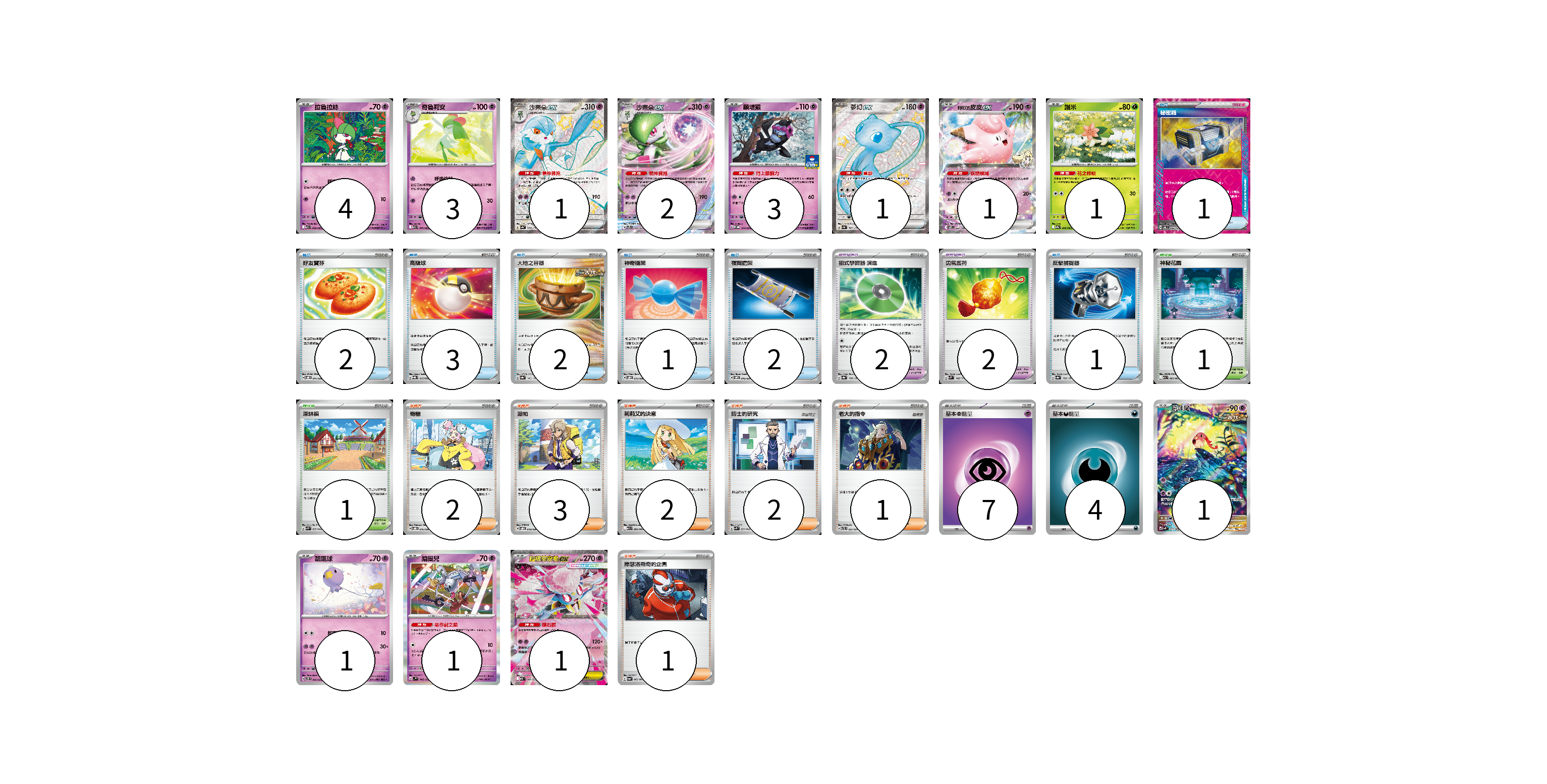 牌組構築方案 以此牌組為基礎新構築牌組 顯示卡面 顯示列表 寶可夢卡(20) 4 3 1 2 3 1 1 1 1 1 1 1 寶可夢道具(4) 2 2 物品卡(12) 1 2 3 2 1 2 1 支援者卡(11) 2 3 2 2 1 1 競技場卡(2) 1 1 能量卡(11) 7 4 寶可夢卡(20) 卡牌名稱 張數 卡牌名稱 張數 拉魯拉絲 M1S 040/063 04 奇魯莉安 M1S 041/063 03 沙奈朵ex SV4a 328/190 01 沙奈朵ex SVTS 004/022 02 願增猿 M-P 014/M-P 03 夢幻ex SV4a 327/190 01 莉莉艾的皮皮ex SV9 033/100 01 謝米 SV9a 006/063 01 吼叫尾 SV4K 071/066 01 飄飄球 SVTS 005/022 01 鑰圈兒 SV1V 045/078 01 超級蒂安希ex MBD 006/022 01 寶可夢道具(4) 卡牌名稱 張數 卡牌名稱 張數 招式學習器 演進 SV8a 160/187 02 勇氣護符 SVM 142/175 02 物品卡(12) 卡牌名稱 張數 卡牌名稱 張數 秘密箱 SV6 092/101 01 好友寶芬 SVOD 011/020 02 高級球 SVQL 015/022 03 大地之容器 SV8a 143/187 02 神奇糖果 SVOD 013/020 01 夜間擔架 SVOM 016/021 02 反擊捕捉器 SV8a 139/187 01 支援者卡(11) 卡牌名稱 張數 卡牌名稱 張數 奇樹 SVOD 016/020 02 派帕 SVOD 018/020 03 莉莉艾的決意 M1L 062/063 02 博士的研究 SVK 033/042 02 老大的指令 SVTL 021/021 01 庫瑟洛斯奇的企圖 SV6a 062/064 01 競技場卡(2) 卡牌名稱 張數 卡牌名稱 張數 神秘花園 M1S 063/063 01 深缽鎮 SVK 039/042 01 能量卡(11) 卡牌名稱 張數 卡牌名稱 張數 基本超能量 sv-p PSY 07 基本惡能量 sv-p DAR 04 以此牌組為基礎新構築牌組 牌組編碼 jbRkHY-rRQxWN-ldxAhC copy 列印牌組單 牌組編碼已複製 分享至SNS