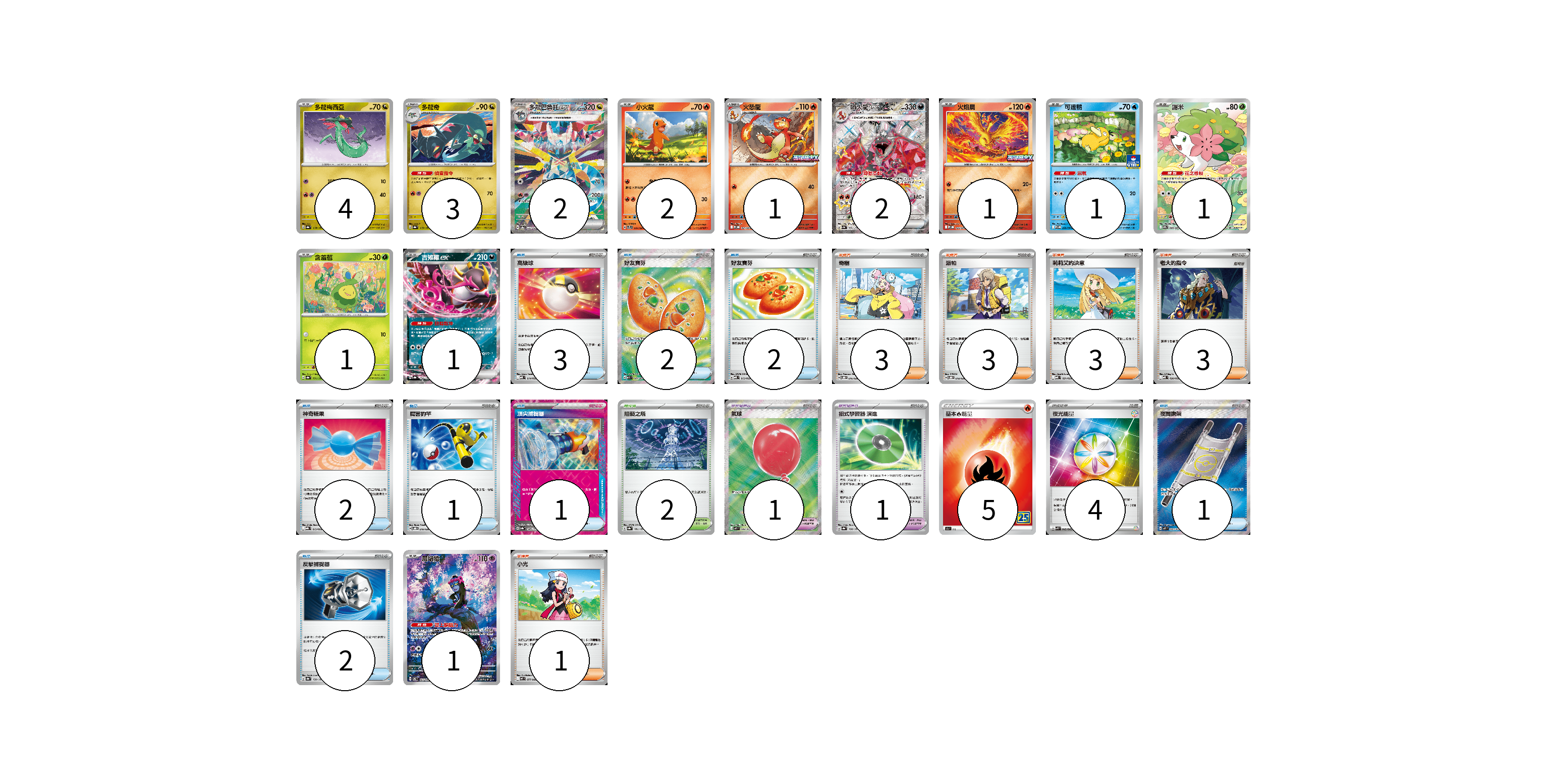 牌組構築方案 以此牌組為基礎新構築牌組 顯示卡面 顯示列表 寶可夢卡(20) 4 3 2 2 1 2 1 1 1 1 1 1 寶可夢道具(2) 1 1 物品卡(14) 3 2 2 2 1 1 1 2 支援者卡(13) 3 3 3 3 1 競技場卡(2) 2 能量卡(9) 5 4 寶可夢卡(20) 卡牌名稱 張數 卡牌名稱 張數 多龍梅西亞 SV8a 118/187 04 多龍奇 SV8a 119/187 03 多龍巴魯托ex SV8a 221/187 02 小火龍 SVTL 001/021 02 火恐龍 M-P 021/M-P 01 噴火龍ex SV4a 331/190 02 火焰鳥 M-P 022/M-P 01 可達鴨 SV-P 220/SV-P 01 謝米 SV9a 066/063 01 含羞苞 SV8a 001/187 01 吉雉雞ex SV8a 104/187 01 願增猿 SV6 107/101 01 寶可夢道具(2) 卡牌名稱 張數 卡牌名稱 張數 氣球 M1L 084/063 01 招式學習器 演進 SV8a 160/187 01 物品卡(14) 卡牌名稱 張數 卡牌名稱 張數 高級球 MBD 014/022 03 好友寶芬 M1S 081/063 02 好友寶芬 MBD 013/022 02 神奇糖果 MBG 013/022 02 厲害釣竿 SVOD 010/020 01 頂尖捕捉器 SV8a 148/187 01 夜間擔架 M1L 083/063 01 反擊捕捉器 SV8a 139/187 02 支援者卡(13) 卡牌名稱 張數 卡牌名稱 張數 奇樹 SVOD 016/020 03 派帕 SVOD 018/020 03 莉莉艾的決意 MBD 021/022 03 老大的指令 MBD 020/022 03 小光 M2 077/080 01 競技場卡(2) 卡牌名稱 張數 卡牌名稱 張數 阻礙之塔 SV8a 181/187 02 能量卡(9) 卡牌名稱 張數 卡牌名稱 張數 基本火能量 S8a FIR 05 夜光能量 SVK 042/042 04 以此牌組為基礎新構築牌組 牌組編碼 jcTqIL-VmijEi-ilBPsO copy 列印牌組單 牌組編碼已複製 分享至SNS
