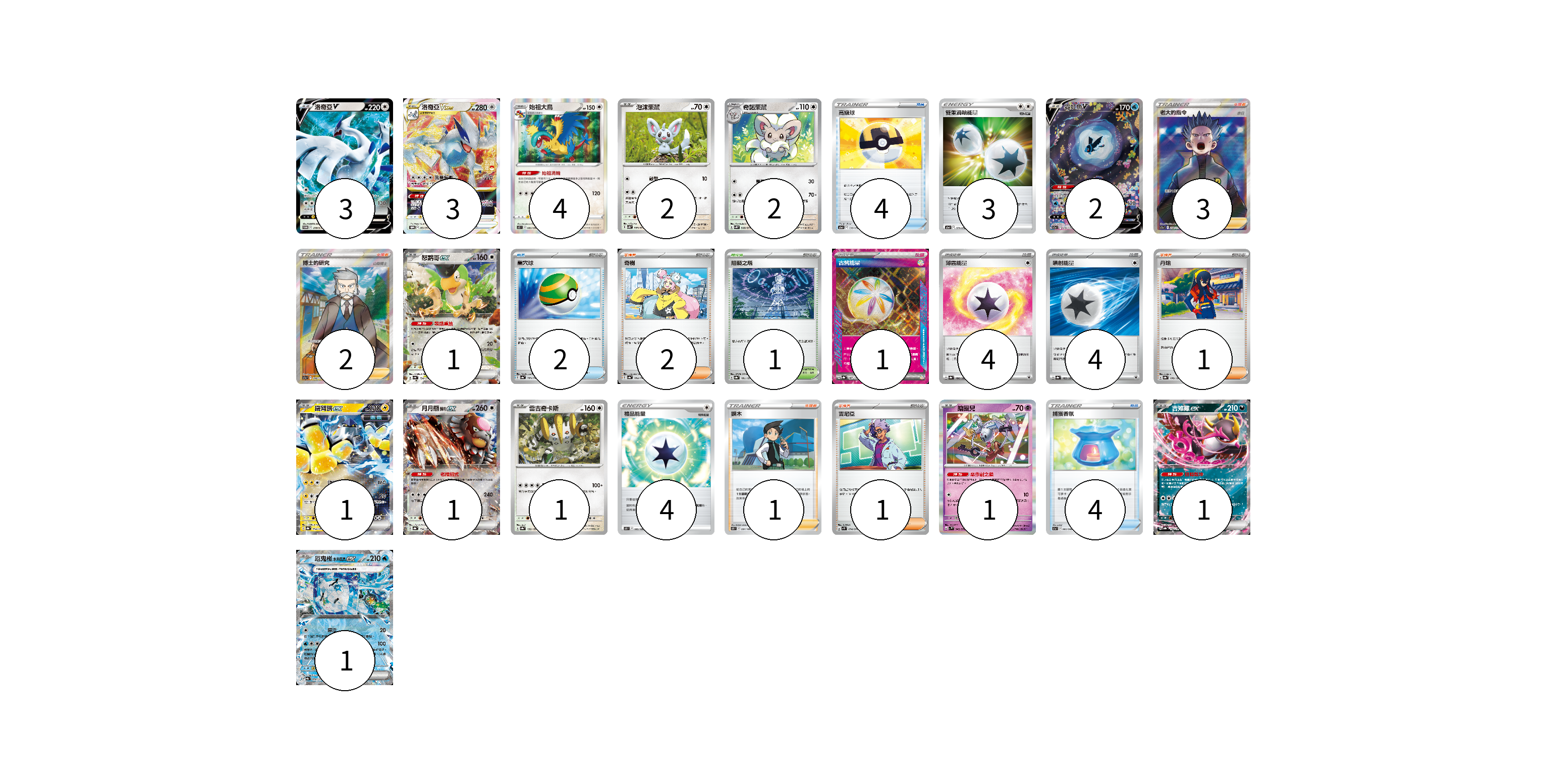 牌組構築方案 以此牌組為基礎新構築牌組 顯示卡面 顯示列表 寶可夢卡(23) 3 3 4 2 2 2 1 1 1 1 1 1 1 物品卡(10) 4 2 4 支援者卡(10) 3 2 2 1 1 1 競技場卡(1) 1 能量卡(16) 3 1 4 4 4 寶可夢卡(23) 卡牌名稱 張數 卡牌名稱 張數 洛奇亞V S-P 219/S-P 03 洛奇亞VSTAR SV-P 163/SV-P 03 始祖大鳥 S12 083/098 04 泡沫栗鼠 SV5K 059/071 02 奇諾栗鼠 SV5K 060/071 02 霓虹魚V S12a 216/172 02 怒鸚哥ex SV4a 154/190 01 鐵臂膀ex SV8a 054/187 01 月月熊 赫月ex SV8a 134/187 01 雷吉奇卡斯 SV8a 132/187 01 鑰圈兒 SV1V 045/078 01 吉雉雞ex SV8a 104/187 01 厄鬼椪 水井面具ex SV8a 050/187 01 物品卡(10) 卡牌名稱 張數 卡牌名稱 張數 高級球 S12a 138/172 04 巢穴球 SV4a 159/190 02 捕獲香氛 S11a 060/068 04 支援者卡(10) 卡牌名稱 張數 卡牌名稱 張數 老大的指令(赤日) S12a 250/172 03 博士的研究(山梨博士) S12a 248/172 02 奇樹 SV4a 174/190 02 丹瑜 SV8a 170/187 01 捩木 S11 097/100 01 吉尼亞 SV1S 074/078 01 競技場卡(1) 卡牌名稱 張數 卡牌名稱 張數 阻礙之塔 SV8a 181/187 01 能量卡(16) 卡牌名稱 張數 卡牌名稱 張數 雙重渦輪能量 S12a 171/172 03 古舊能量 SV8a 187/187 01 薄霧能量 SV8a 186/187 04 噴射能量 SV8a 185/187 04 禮品能量 S11 100/100 04 以此牌組為基礎新構築牌組 牌組編碼 jcpLlN-EAWDti-IpQzsu copy 列印牌組單 牌組編碼已複製 分享至SNS