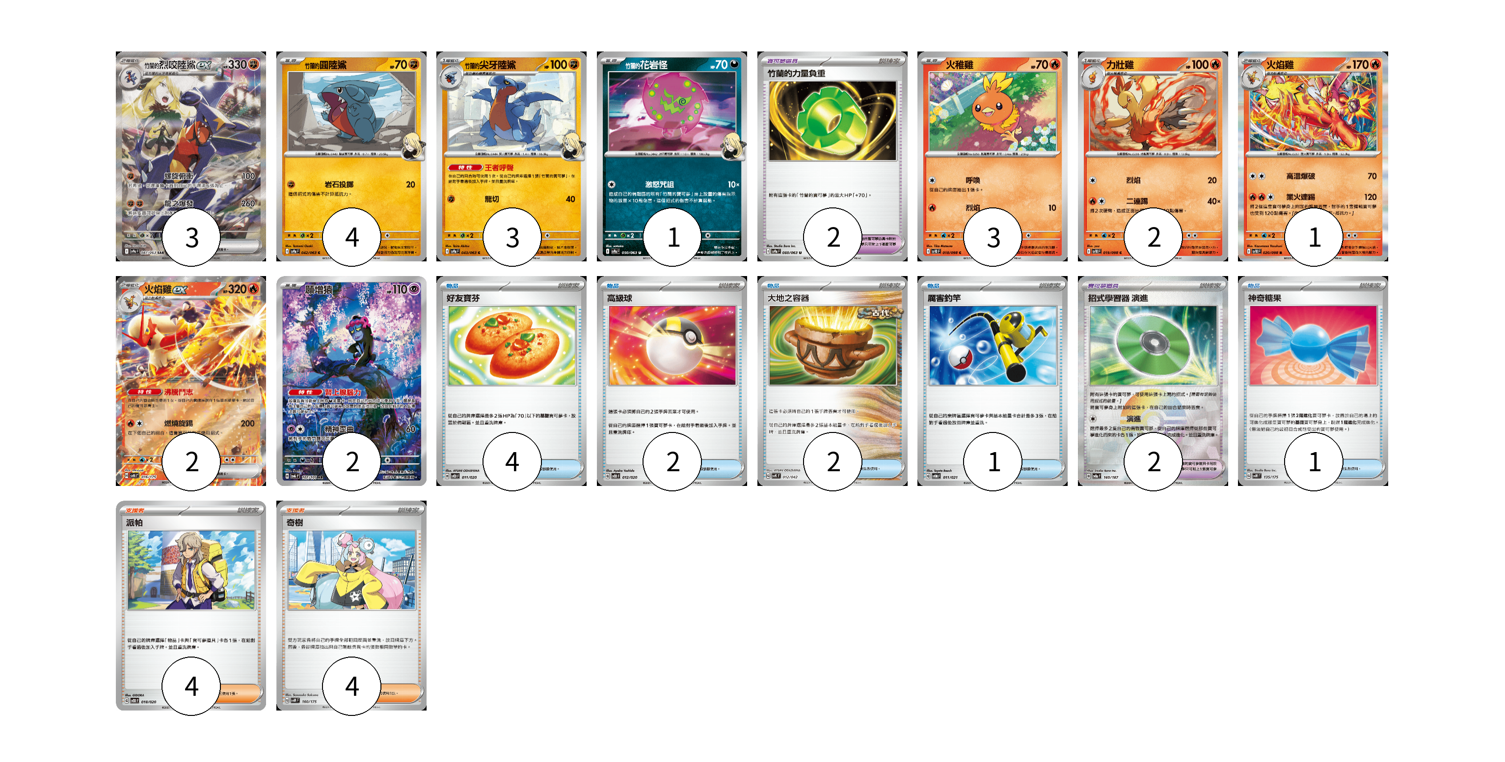 牌組構築方案 以此牌組為基礎新構築牌組 顯示卡面 顯示列表 寶可夢卡(21) 3 4 3 1 3 2 1 2 2 寶可夢道具(4) 2 2 物品卡(10) 4 2 2 1 1 支援者卡(8) 4 4 寶可夢卡(21) 卡牌名稱 張數 卡牌名稱 張數 <竹蘭的>烈咬陸鯊ex SV9a 087/063 03 <竹蘭的>圓陸鯊 SV9a 042/063 04 <竹蘭的>尖牙陸鯊 SV9a 043/063 03 <竹蘭的>花岩怪 SV9a 050/063 01 火稚雞 SV10 018/098 03 力壯雞 SV10 019/098 02 火焰雞 SV10 020/098 01 火焰雞ex SVM 016/175 02 願增猿 SV6 107/101 02 寶可夢道具(4) 卡牌名稱 張數 卡牌名稱 張數 竹蘭的力量負重 SV9a 060/063 02 招式學習器 演進 SV8a 160/187 02 物品卡(10) 卡牌名稱 張數 卡牌名稱 張數 好友寶芬 SVOD 011/020 04 高級球 SVOD 012/020 02 大地之容器 SVK 012/042 02 厲害釣竿 SVOM 011/021 01 神奇糖果 SVM 135/175 01 支援者卡(8) 卡牌名稱 張數 卡牌名稱 張數 派帕 SVOD 018/020 04 奇樹 SVM 160/175 04 以此牌組為基礎新構築牌組 牌組編碼 jdVADM-eeDSGP-voBaxg copy 列印牌組單 牌組編碼已複製 分享至SNS