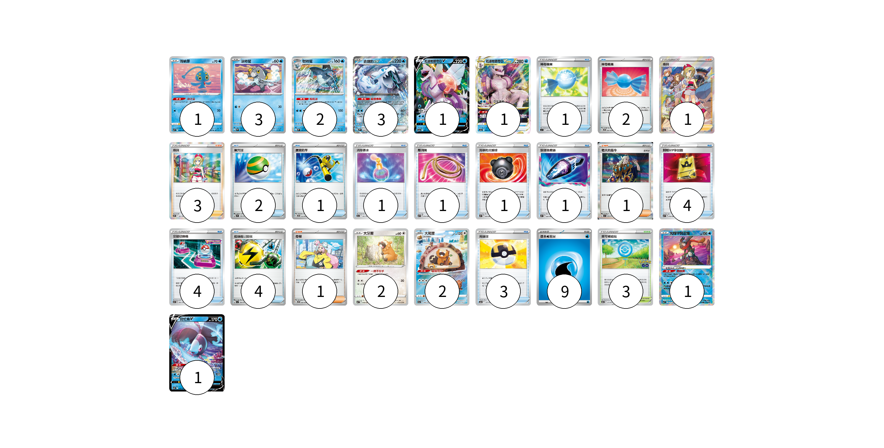 牌組構築方案 以此牌組為基礎新構築牌組 顯示卡面 顯示列表 寶可夢卡(17) 1 3 2 3 1 1 2 2 1 1 物品卡(25) 1 2 2 1 1 1 1 1 4 4 4 3 支援者卡(6) 1 3 1 1 競技場卡(3) 3 能量卡(9) 9 寶可夢卡(17) 卡牌名稱 張數 卡牌名稱 張數 瑪納霏 SVF 003/038 01 涼脊龍 SV2P 024/071 03 戟脊龍 SV2P 027/071 02 古劍豹ex SV2P 028/071 03 起源帕路奇亞V S12a 027/172 01 起源帕路奇亞VSTAR S12a 028/172 01 大牙狸 SVF 008/038 02 大尾狸 S12a 200/172 02 光輝甲賀忍蛙 SVF 004/038 01 霓虹魚V SVB 008/028 01 物品卡(25) 卡牌名稱 張數 卡牌名稱 張數 神奇糖果 SI 376/414 01 神奇糖果 SVF 020/038 02 巢穴球 SV1S 070/078 02 厲害釣竿 SVF 013/038 01 消除香水 S9a 063/067 01 離洞繩 SVF 010/038 01 洗翠的沉重球 SVF 019/038 01 放逐吸塵器 SVF 023/038 01 對戰VIP參加證 SVF 018/038 04 交錯切換機 S8 090/100 04 超級能量回收 SV1a 064/073 04 高級球 S12a 138/172 03 支援者卡(6) 卡牌名稱 張數 卡牌名稱 張數 珠貝 S12a 236/172 01 珠貝 S10P 064/067 03 老大的指令 SV1a 069/073 01 奇樹 SVF 029/038 01 競技場卡(3) 卡牌名稱 張數 卡牌名稱 張數 寶可補給站 S10b 071/071 03 能量卡(9) 卡牌名稱 張數 卡牌名稱 張數 基本【水】能量 SVF WAT 09 以此牌組為基礎新構築牌組 牌組編碼 jfUHsj-vbrkLT-jXRGQv copy 列印牌組單 牌組編碼已複製 分享至SNS