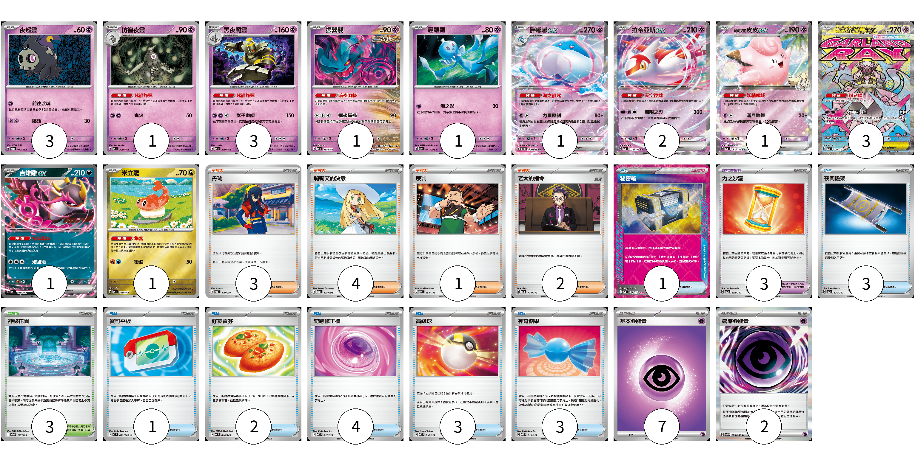 牌組構築方案 以此牌組為基礎新構築牌組 顯示卡面 顯示列表 寶可夢卡(18) 3 1 3 1 1 1 2 1 3 1 1 寶可夢道具(3) 3 物品卡(17) 1 3 1 2 4 3 3 支援者卡(10) 3 4 1 2 競技場卡(3) 3 能量卡(9) 7 2 寶可夢卡(18) 卡牌名稱 張數 卡牌名稱 張數 夜巡靈 M2a 072/193 03 彷徨夜靈 MC 309/742 01 黑夜魔靈 MC 310/742 03 振翼髮 MC 355/742 01 輕飄飄 SV11W 041/086 01 胖嘟嘟ex SV11W 042/086 01 拉帝亞斯ex M2a 075/193 02 莉莉艾的皮皮ex M2a 060/193 01 超級蒂安希ex M2a 227/193 03 吉雉雞ex MC 489/742 01 米立龍 MC 549/742 01 寶可夢道具(3) 卡牌名稱 張數 卡牌名稱 張數 力之沙漏 MC 683/742 03 物品卡(17) 卡牌名稱 張數 卡牌名稱 張數 秘密箱 SV6 092/101 01 夜間擔架 MC 670/742 03 寶可平板 M3 070/080 01 好友寶芬 MC 648/742 02 奇跡修正檔 MBD 017/022 04 高級球 MBD 014/022 03 神奇糖果 MBG 013/022 03 支援者卡(10) 卡牌名稱 張數 卡牌名稱 張數 丹瑜 SV8a 170/187 03 莉莉艾的決意 M2a 175/193 04 裁判 SVM 154/175 01 老大的指令 MC 724/742 02 競技場卡(3) 卡牌名稱 張數 卡牌名稱 張數 神秘花園 M2a 187/193 03 能量卡(9) 卡牌名稱 張數 卡牌名稱 張數 基本【超】能量 MC PSY 07 感應【超】能量 M3 079/080 02 以此牌組為基礎新構築牌組 牌組編碼 jfqgHT-IRViWc-KPHlJA copy 列印牌組單 牌組編碼已複製 分享至SNS