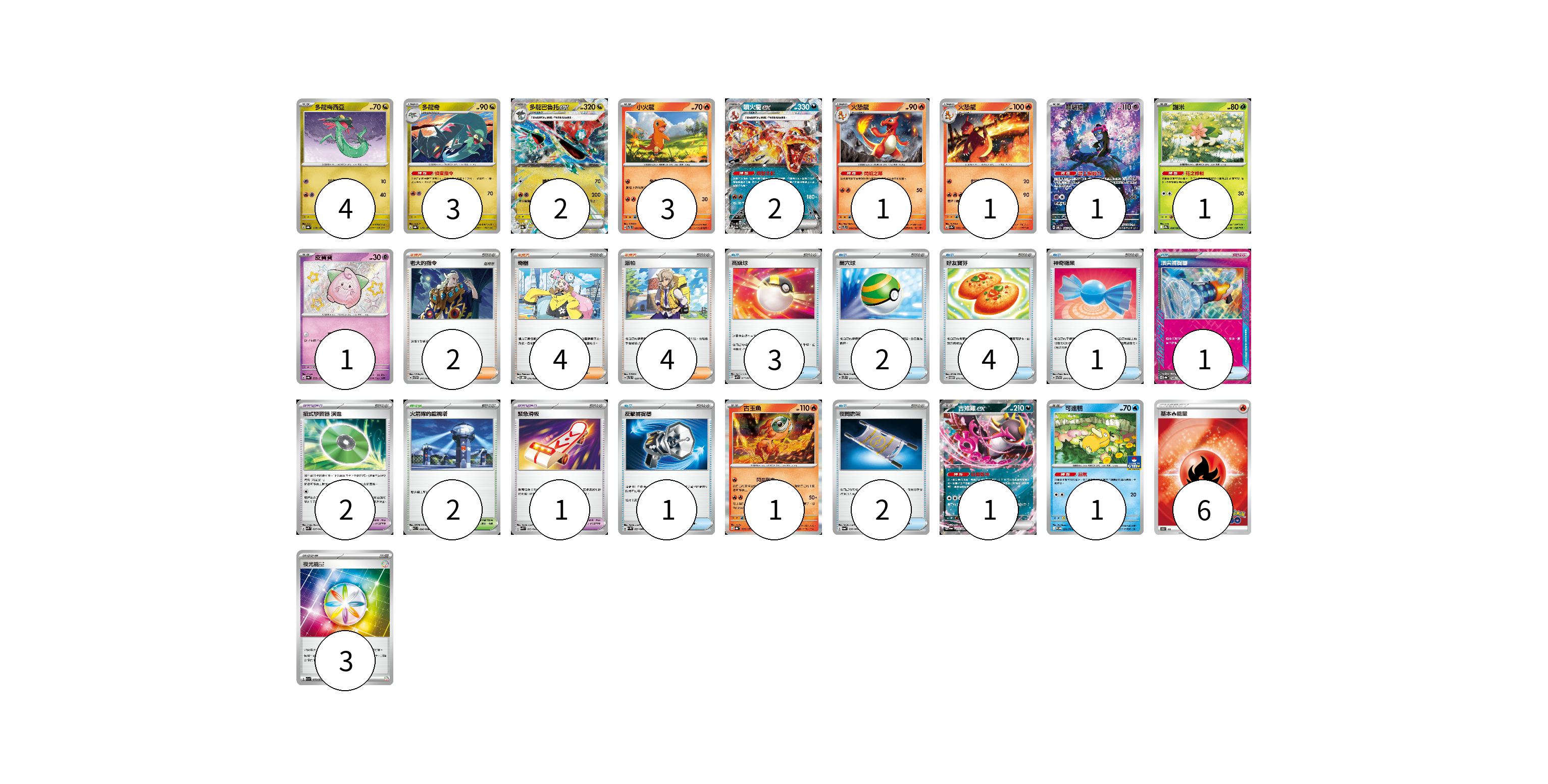 牌組構築方案 以此牌組為基礎新構築牌組 顯示卡面 顯示列表 寶可夢卡(22) 4 3 2 3 2 1 1 1 1 1 1 1 1 寶可夢道具(3) 2 1 物品卡(14) 3 2 4 1 1 1 2 支援者卡(10) 2 4 4 競技場卡(2) 2 能量卡(9) 6 3 寶可夢卡(22) 卡牌名稱 張數 卡牌名稱 張數 多龍梅西亞 SV8a 118/187 04 多龍奇 SV8a 119/187 03 多龍巴魯托ex SV8a 120/187 02 小火龍 SVTL 001/021 03 噴火龍ex SV4a 115/190 02 火恐龍 SVTL 002/021 01 火恐龍 SV2a 005/165 01 願增猿 SV6 107/101 01 謝米 SV9a 006/063 01 皮寶寶 SV4a 255/190 01 古玉魚 SV8a 025/187 01 吉雉雞ex SV6a 038/064 01 可達鴨 SV-P 220/SV-P 01 寶可夢道具(3) 卡牌名稱 張數 卡牌名稱 張數 招式學習器 演進 SVK 025/042 02 緊急滑板 SVK 023/042 01 物品卡(14) 卡牌名稱 張數 卡牌名稱 張數 高級球 SVHM 013/022 03 巢穴球 SVTS 013/022 02 好友寶芬 SVTM 011/022 04 神奇糖果 SVTG 014/019 01 頂尖捕捉器 SV8a 148/187 01 反擊捕捉器 SV4M 059/066 01 夜間擔架 SV6a 056/064 02 支援者卡(10) 卡牌名稱 張數 卡牌名稱 張數 老大的指令 SVTH 017/018 02 奇樹 SVOD 016/020 04 派帕 SVTL 020/021 04 競技場卡(2) 卡牌名稱 張數 卡牌名稱 張數 火箭隊的監視塔 SV10 096/098 02 能量卡(9) 卡牌名稱 張數 卡牌名稱 張數 基本火能量 S10b FIR 06 夜光能量 SV1a 073/073 03 以此牌組為基礎新構築牌組 牌組編碼 jgfOVF-sEJsew-JKaNeR copy 列印牌組單 牌組編碼已複製 分享至SNS