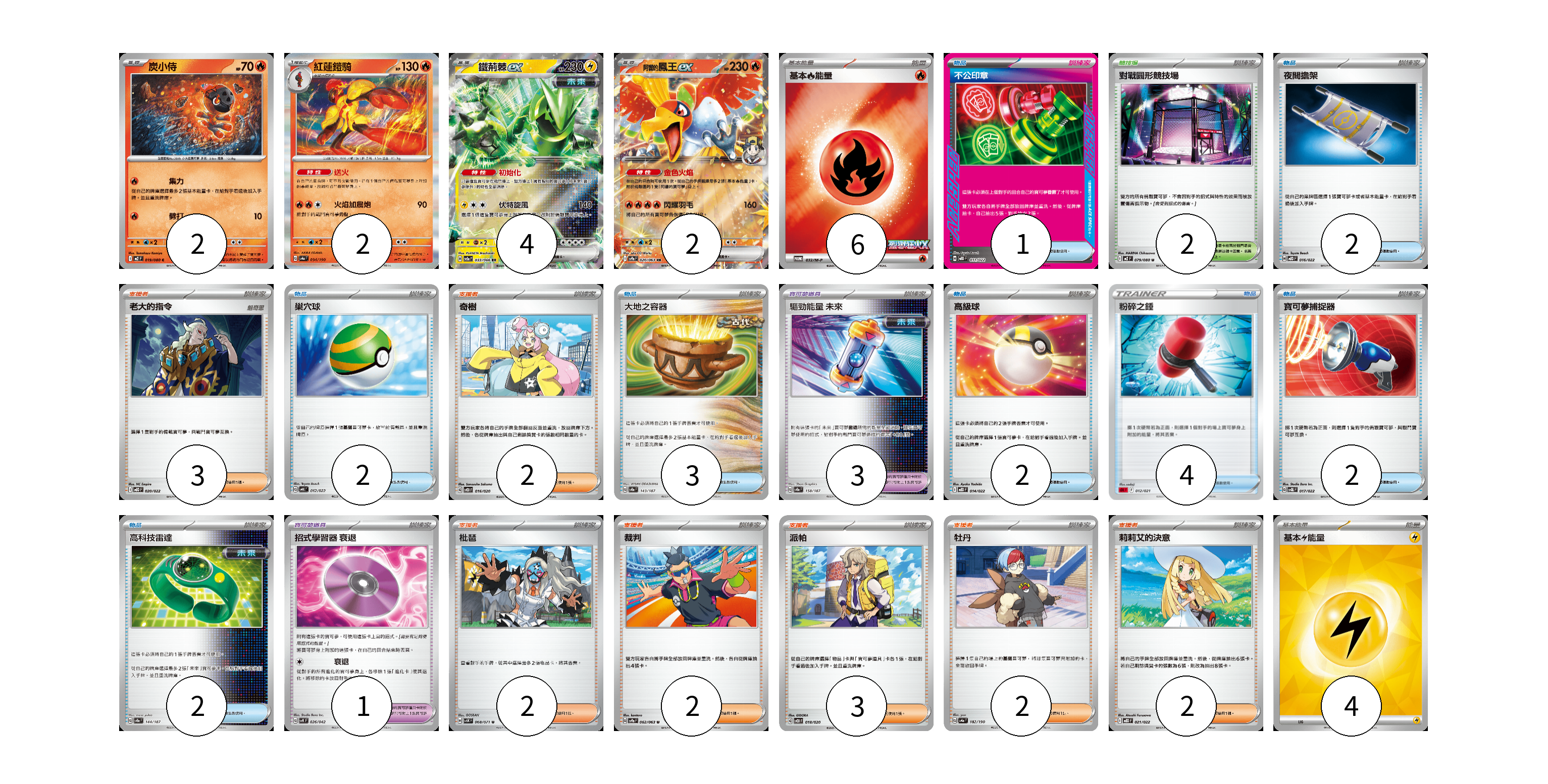 牌組構築方案 以此牌組為基礎新構築牌組 顯示卡面 顯示列表 寶可夢卡(10) 2 2 4 2 寶可夢道具(4) 3 1 物品卡(18) 1 2 2 3 2 4 2 2 支援者卡(16) 3 2 2 2 3 2 2 競技場卡(2) 2 能量卡(10) 6 4 寶可夢卡(10) 卡牌名稱 張數 卡牌名稱 張數 炭小侍 M2 019/080 02 紅蓮鎧騎 SV4a 034/190 02 鐵荊棘ex SV5a 033/066 04 <阿響的>鳳王ex SV9a 020/063 02 寶可夢道具(4) 卡牌名稱 張數 卡牌名稱 張數 驅勁能量 未來 SV8a 158/187 03 招式學習器 衰退 SVK 026/042 01 物品卡(18) 卡牌名稱 張數 卡牌名稱 張數 不公印章 MBD 011/022 01 夜間擔架 MBD 016/022 02 巢穴球 SVHK 012/022 02 大地之容器 SV8a 143/187 03 高級球 MBD 014/022 02 粉碎之錘 SDL 012/021 04 寶可夢捕捉器 SVQL 017/022 02 高科技雷達 SV8a 144/187 02 支援者卡(16) 卡牌名稱 張數 卡牌名稱 張數 老大的指令 MBD 020/022 03 奇樹 SVOD 016/020 02 枇琶 SV5K 068/071 02 裁判 SV9a 062/063 02 派帕 SVOD 018/020 03 牡丹 SV4a 182/190 02 莉莉艾的決意 MBD 021/022 02 競技場卡(2) 卡牌名稱 張數 卡牌名稱 張數 對戰圓形競技場 M2 079/080 02 能量卡(10) 卡牌名稱 張數 卡牌名稱 張數 基本【火】能量 M-P 032/M-P 06 基本【雷】能量 SVQP LIG 04 以此牌組為基礎新構築牌組 牌組編碼 jiSqBk-FGZSiL-aTStZs copy 列印牌組單 牌組編碼已複製 分享至SNS
