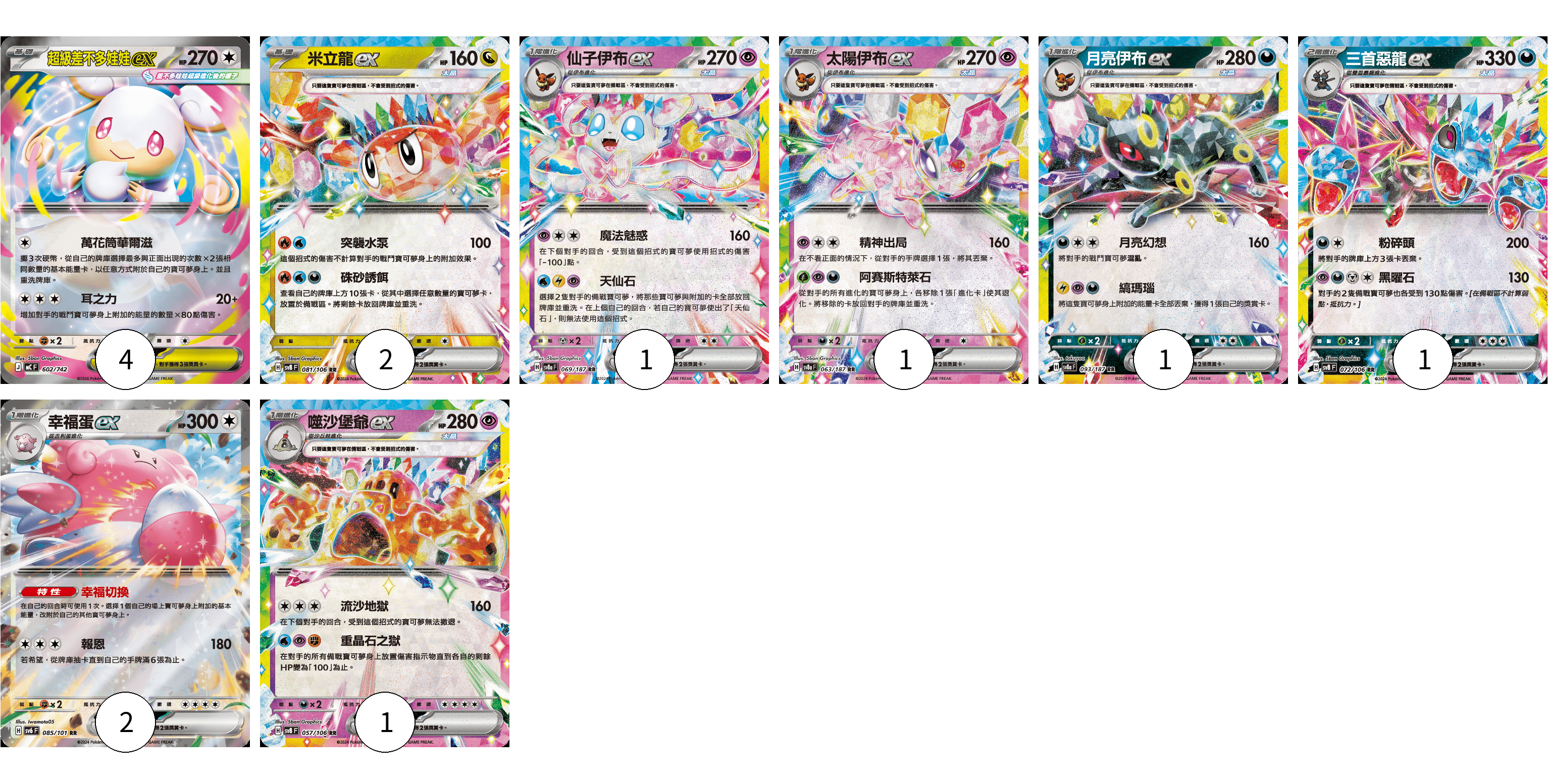 牌組構築方案 以此牌組為基礎新構築牌組 顯示卡面 顯示列表 寶可夢卡(13) 4 2 1 1 1 1 2 1 寶可夢卡(13) 卡牌名稱 張數 卡牌名稱 張數 超級差不多娃娃ex MC 602/742 04 米立龍ex SV8 081/106 02 仙子伊布ex SV8a 069/187 01 太陽伊布ex SV8a 063/187 01 月亮伊布ex SV8a 093/187 01 三首惡龍ex SV8 072/106 01 幸福蛋ex SV6 085/101 02 噬沙堡爺ex SV8 057/106 01 以此牌組為基礎新構築牌組 牌組編碼 jsVYBM-KKcIoR-effhRX copy 列印牌組單 牌組編碼已複製 分享至SNS