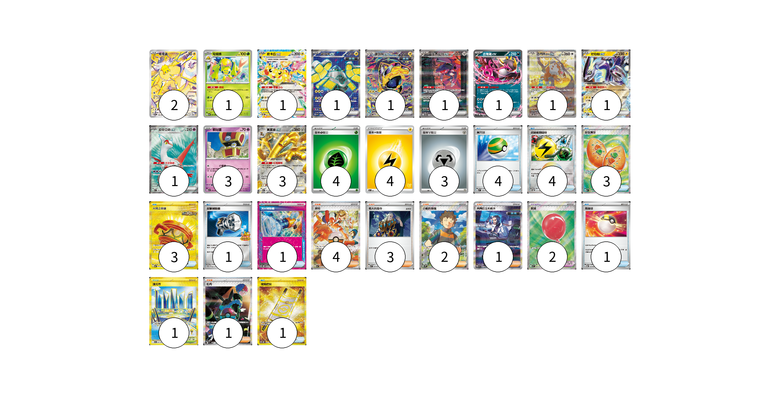 牌組構築方案 以此牌組為基礎新構築牌組 顯示卡面 顯示列表 寶可夢卡(17) 2 1 1 1 1 1 1 1 1 1 3 3 寶可夢道具(2) 2 物品卡(18) 4 4 3 3 1 1 1 1 支援者卡(11) 4 3 2 1 1 競技場卡(1) 1 能量卡(11) 4 4 3 寶可夢卡(17) 卡牌名稱 張數 卡牌名稱 張數 電電蟲 SV7 108/102 02 電蜘蛛 SV6a 002/064 01 皮卡丘ex SV8 033/106 01 鐵臂膀ex SV4M 079/066 01 鐵臂膀ex SV8a 210/187 01 蓋諾賽克特ex SV11B 172/086 01 吉雉雞ex SVOD 004/020 01 月月熊 赫月 ex SV5a 091/066 01 密勒頓ex SV4a 071/190 01 拉帝亞斯ex SV7a 078/064 01 索財靈 SV7a 024/064 03 賽富豪ex SV3a 050/062 03 寶可夢道具(2) 卡牌名稱 張數 卡牌名稱 張數 氣球 M1L 084/063 02 物品卡(18) 卡牌名稱 張數 卡牌名稱 張數 巢穴球 SVM 133/175 04 超級能量回收 SV8a 141/187 04 好友寶芬 M1S 081/063 03 大地之容器 SV6a 093/064 03 反擊捕捉器 SV-P 083/SV-P 01 頂尖捕捉器 SV5M 062/071 01 高級球 SVQL 015/022 01 夜間擔架 SV8 137/106 01 支援者卡(11) 卡牌名稱 張數 卡牌名稱 張數 派帕 SV4a 353/190 04 老大的指令 SVK 036/042 03 小剛的發掘 SV9 123/100 02 弗圖博士的劇本 SV4M 091/066 01 牡丹 SV4a 354/190 01 競技場卡(1) 卡牌名稱 張數 卡牌名稱 張數 釀光市 SV9a 092/063 01 能量卡(11) 卡牌名稱 張數 卡牌名稱 張數 基本草能量 sv-p GRA 04 基本雷能量 SH LIG 04 基本鋼能量 sv-p MET 03 以此牌組為基礎新構築牌組 牌組編碼 jsZQoq-jSYgfT-aWivRF copy 列印牌組單 牌組編碼已複製 分享至SNS