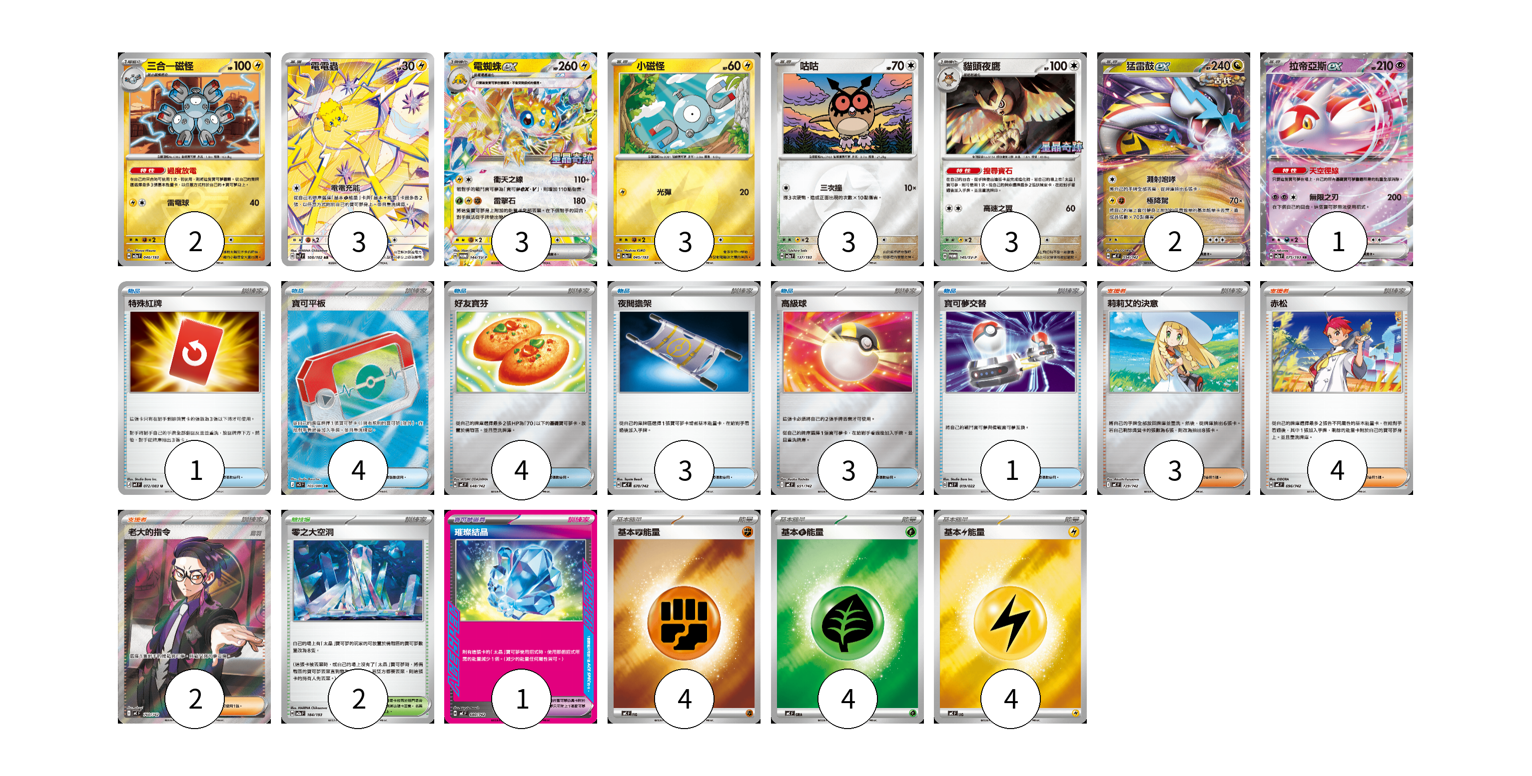 牌組構築方案 以此牌組為基礎新構築牌組 顯示卡面 顯示列表 寶可夢卡(20) 2 3 3 3 3 3 2 1 寶可夢道具(1) 1 物品卡(16) 1 4 4 3 3 1 支援者卡(9) 3 4 2 競技場卡(2) 2 能量卡(12) 4 4 4 寶可夢卡(20) 卡牌名稱 張數 卡牌名稱 張數 三合一磁怪 M2a 046/193 02 電電蟲 SV7 108/102 03 電蜘蛛ex SV-P 144/SV-P 03 小磁怪 M2a 045/193 03 咕咕 M2a 137/193 03 貓頭夜鷹 SV-P 145/SV-P 03 猛雷鼓ex MC 554/742 02 拉帝亞斯ex M2a 075/193 01 寶可夢道具(1) 卡牌名稱 張數 卡牌名稱 張數 璀璨結晶 MC 680/742 01 物品卡(16) 卡牌名稱 張數 卡牌名稱 張數 特殊紅牌 M4 072/083 01 寶可平板 M3 103/080 04 好友寶芬 MC 648/742 04 夜間擔架 MC 670/742 03 高級球 MC 651/742 03 寶可夢交替 MJ 019/022 01 支援者卡(9) 卡牌名稱 張數 卡牌名稱 張數 莉莉艾的決意 MC 729/742 03 赤松 MC 696/742 04 老大的指令(烏羽) MC 760/742 02 競技場卡(2) 卡牌名稱 張數 卡牌名稱 張數 零之大空洞 M2a 184/193 02 能量卡(12) 卡牌名稱 張數 卡牌名稱 張數 基本【鬥】能量 MC FIG 04 基本【草】能量 MC GRA 04 基本【雷】能量 MC LIG 04 以此牌組為基礎新構築牌組 牌組編碼 jtcrdy-cUDFMX-KbFzTJ copy 列印牌組單 牌組編碼已複製 分享至SNS