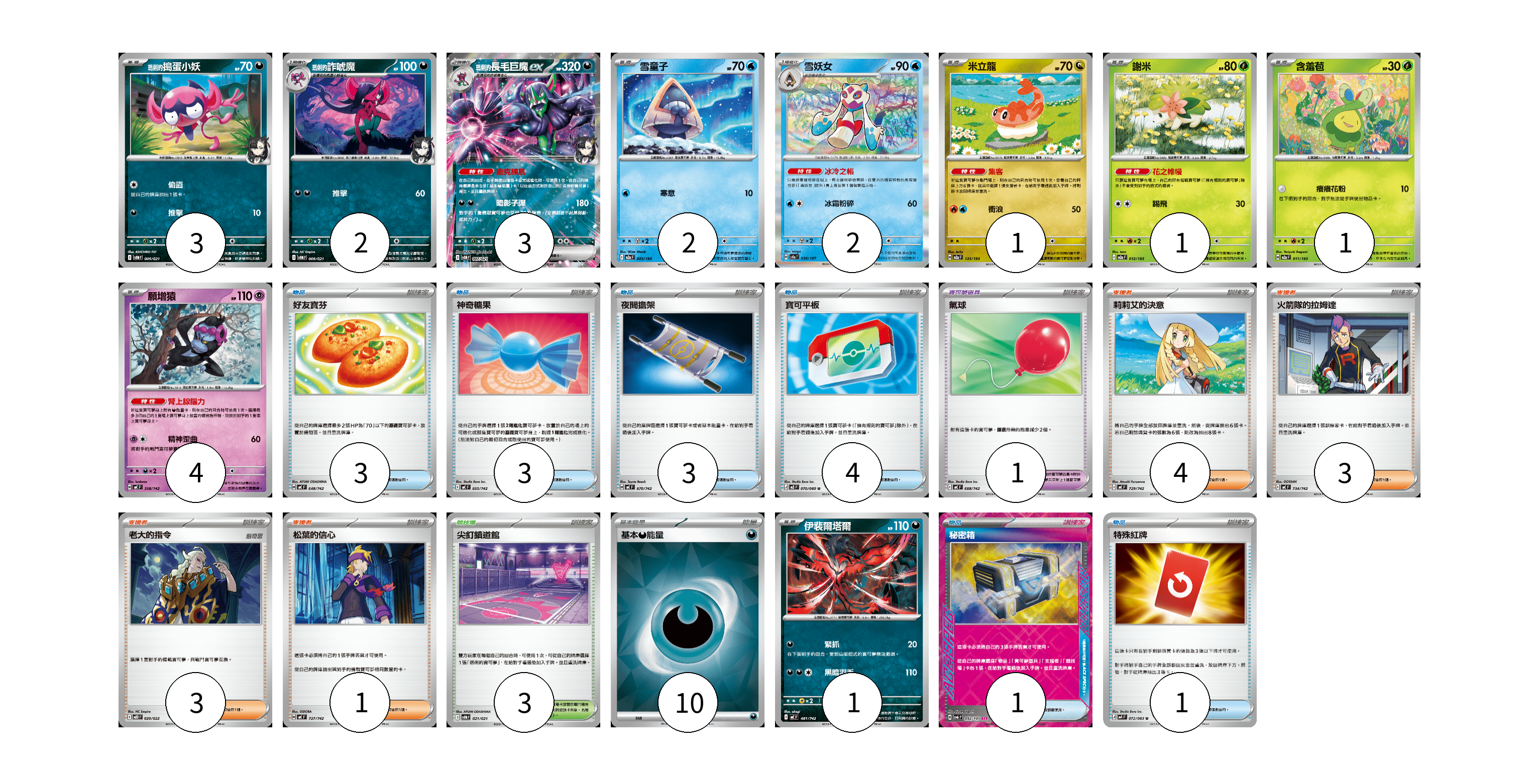 牌組構築方案 以此牌組為基礎新構築牌組 顯示卡面 顯示列表 寶可夢卡(20) 3 2 3 2 2 1 1 1 4 1 寶可夢道具(1) 1 物品卡(15) 3 3 3 4 1 1 支援者卡(11) 4 3 3 1 競技場卡(3) 3 能量卡(10) 10 寶可夢卡(20) 卡牌名稱 張數 卡牌名稱 張數 <瑪俐的>搗蛋小妖 SVOM 005/021 03 <瑪俐的>詐唬魔 SVOM 006/021 02 <瑪俐的>長毛巨魔ex SVOM 007/021 03 雪童子 M2a 035/193 02 雪妖女 SV8a 038/187 02 米立龍 M2a 135/193 01 謝米 M2a 012/193 01 含羞苞 M2a 011/193 01 願增猿 MC 358/742 04 伊裴爾塔爾 MC 481/742 01 寶可夢道具(1) 卡牌名稱 張數 卡牌名稱 張數 氣球 MC 688/742 01 物品卡(15) 卡牌名稱 張數 卡牌名稱 張數 好友寶芬 MC 648/742 03 神奇糖果 MC 655/742 03 夜間擔架 MC 670/742 03 寶可平板 M3 070/080 04 秘密箱 SV6 092/101 01 特殊紅牌 M4 072/083 01 支援者卡(11) 卡牌名稱 張數 卡牌名稱 張數 莉莉艾的決意 MC 729/742 04 火箭隊的拉姆達 MC 734/742 03 老大的指令 MBD 020/022 03 松葉的信心 MC 727/742 01 競技場卡(3) 卡牌名稱 張數 卡牌名稱 張數 尖釘鎮道館 SVOM 021/021 03 能量卡(10) 卡牌名稱 張數 卡牌名稱 張數 基本【惡】能量 SVOM DAR 10 以此牌組為基礎新構築牌組 牌組編碼 jueFNb-rMWnpT-FMRxfi copy 列印牌組單 牌組編碼已複製 分享至SNS