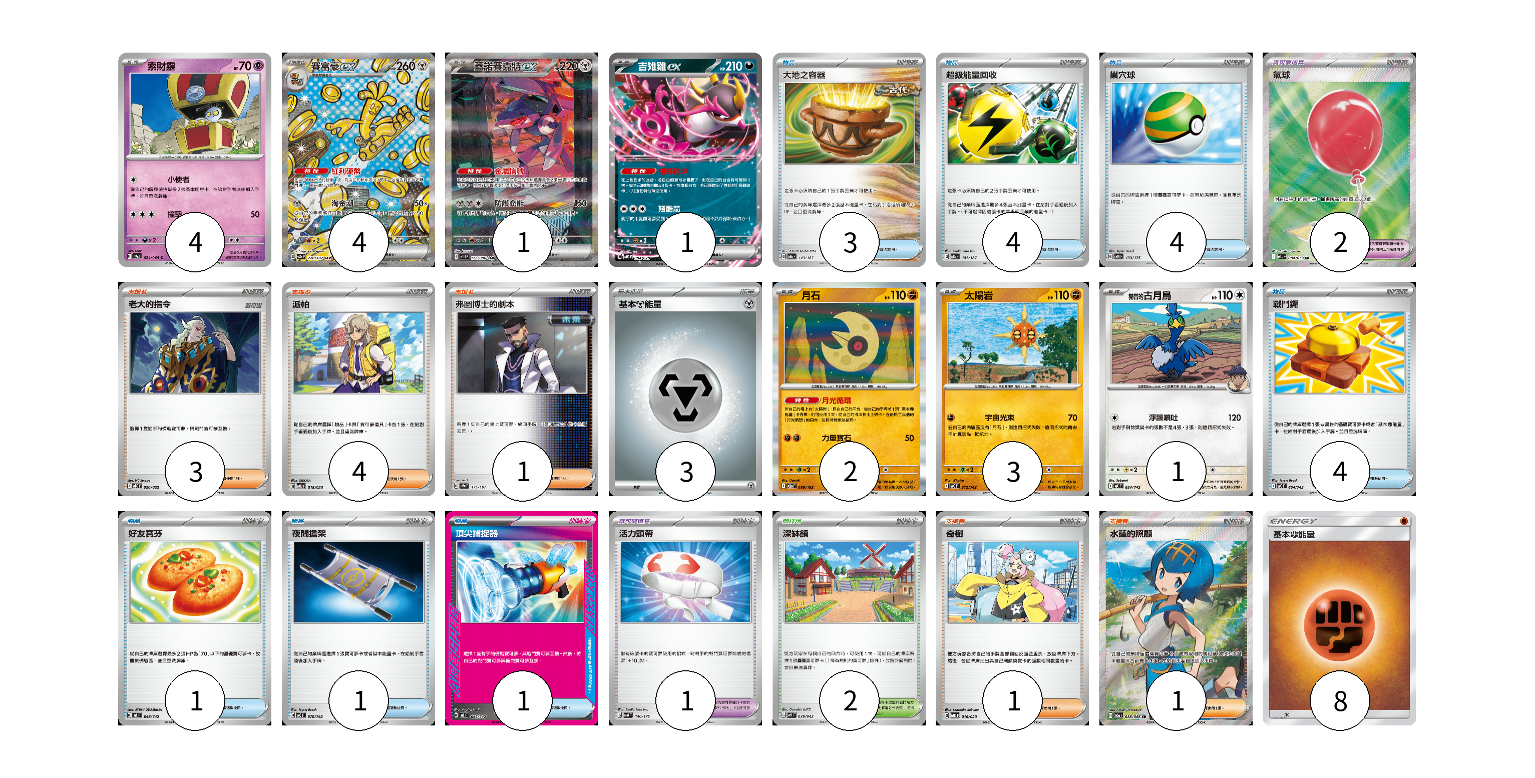 牌組構築方案 以此牌組為基礎新構築牌組 顯示卡面 顯示列表 寶可夢卡(16) 4 4 1 1 2 3 1 寶可夢道具(3) 2 1 物品卡(18) 3 4 4 4 1 1 1 支援者卡(10) 3 4 1 1 1 競技場卡(2) 2 能量卡(11) 3 8 寶可夢卡(16) 卡牌名稱 張數 卡牌名稱 張數 索財靈 SV7a 024/064 04 賽富豪ex SV8a 220/187 04 蓋諾賽克特ex SV11B 172/086 01 吉雉雞ex SVOD 004/020 01 月石 M2a 086/193 02 太陽岩 MC 372/742 03 <赫普的>古月鳥 MC 624/742 01 寶可夢道具(3) 卡牌名稱 張數 卡牌名稱 張數 氣球 M1L 084/063 02 活力頭帶 SVM 140/175 01 物品卡(18) 卡牌名稱 張數 卡牌名稱 張數 大地之容器 SV8a 143/187 03 超級能量回收 SV8a 141/187 04 巢穴球 SVM 133/175 04 戰鬥鑼 MC 654/742 04 好友寶芬 MC 648/742 01 夜間擔架 MC 670/742 01 頂尖捕捉器 MC 656/742 01 支援者卡(10) 卡牌名稱 張數 卡牌名稱 張數 老大的指令 MBD 020/022 03 派帕 SVOD 018/020 04 弗圖博士的劇本 SV8a 175/187 01 奇樹 SVOD 016/020 01 水蓮的照顧 SV5a 088/066 01 競技場卡(2) 卡牌名稱 張數 卡牌名稱 張數 深缽鎮 SVK 039/042 02 能量卡(11) 卡牌名稱 張數 卡牌名稱 張數 基本【鋼】能量 M-P MET 03 基本鬥能量 AS6D FIG 08 以此牌組為基礎新構築牌組 牌組編碼 juskdb-RWJFRX-pffDem copy 列印牌組單 牌組編碼已複製 分享至SNS
