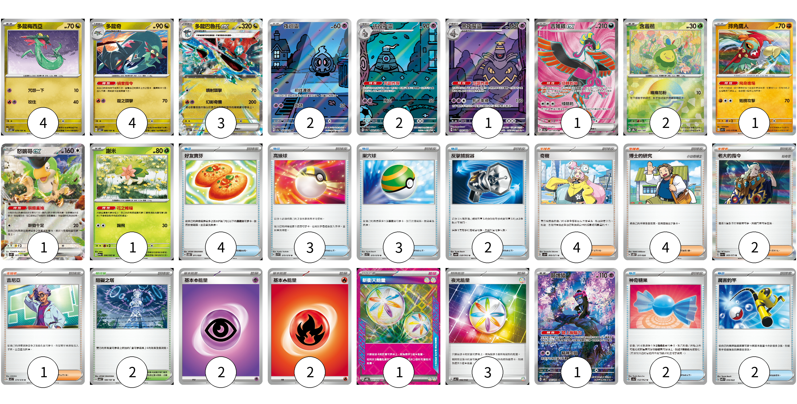 牌組構築方案 以此牌組為基礎新構築牌組 顯示卡面 顯示列表 寶可夢卡(23) 4 4 3 2 2 1 1 2 1 1 1 1 物品卡(16) 4 3 3 2 2 2 支援者卡(11) 4 4 2 1 競技場卡(2) 2 能量卡(8) 2 2 1 3 寶可夢卡(23) 卡牌名稱 張數 卡牌名稱 張數 多龍梅西亞 SV6 079/101 04 多龍奇 SV6 080/101 04 多龍巴魯托ex SV6 081/101 03 夜巡靈 SV6a 068/064 02 彷徨夜靈 SV6a 069/064 02 黑夜魔靈 SV6a 070/064 01 吉雉雞ex SV6a 081/064 01 含羞苞 SV8a 001/187 02 摔角鷹人 SV1S 045/078 01 怒鸚哥ex SV2P 065/071 01 謝米 SV9a 006/063 01 願增猿 SV6 107/101 01 物品卡(16) 卡牌名稱 張數 卡牌名稱 張數 好友寶芬 SVOD 011/020 04 高級球 SV1V 070/078 03 巢穴球 SV1S 070/078 03 反擊捕捉器 SV4M 059/066 02 神奇糖果 SV3a 053/062 02 厲害釣竿 SVTS 010/022 02 支援者卡(11) 卡牌名稱 張數 卡牌名稱 張數 奇樹 SV2D 069/071 04 博士的研究 SVOD 017/020 04 老大的指令 SV1a 069/073 02 吉尼亞 SV1S 074/078 01 競技場卡(2) 卡牌名稱 張數 卡牌名稱 張數 阻礙之塔 SV6 100/101 02 能量卡(8) 卡牌名稱 張數 卡牌名稱 張數 基本超能量 sv-p PSY 02 基本火能量 sv-p FIR 02 新衝天能量 SV5K 071/071 01 夜光能量 SVK 042/042 03 以此牌組為基礎新構築牌組 牌組編碼 jxLNEh-aHyluZ-KJqJaE copy 列印牌組單 牌組編碼已複製 分享至SNS