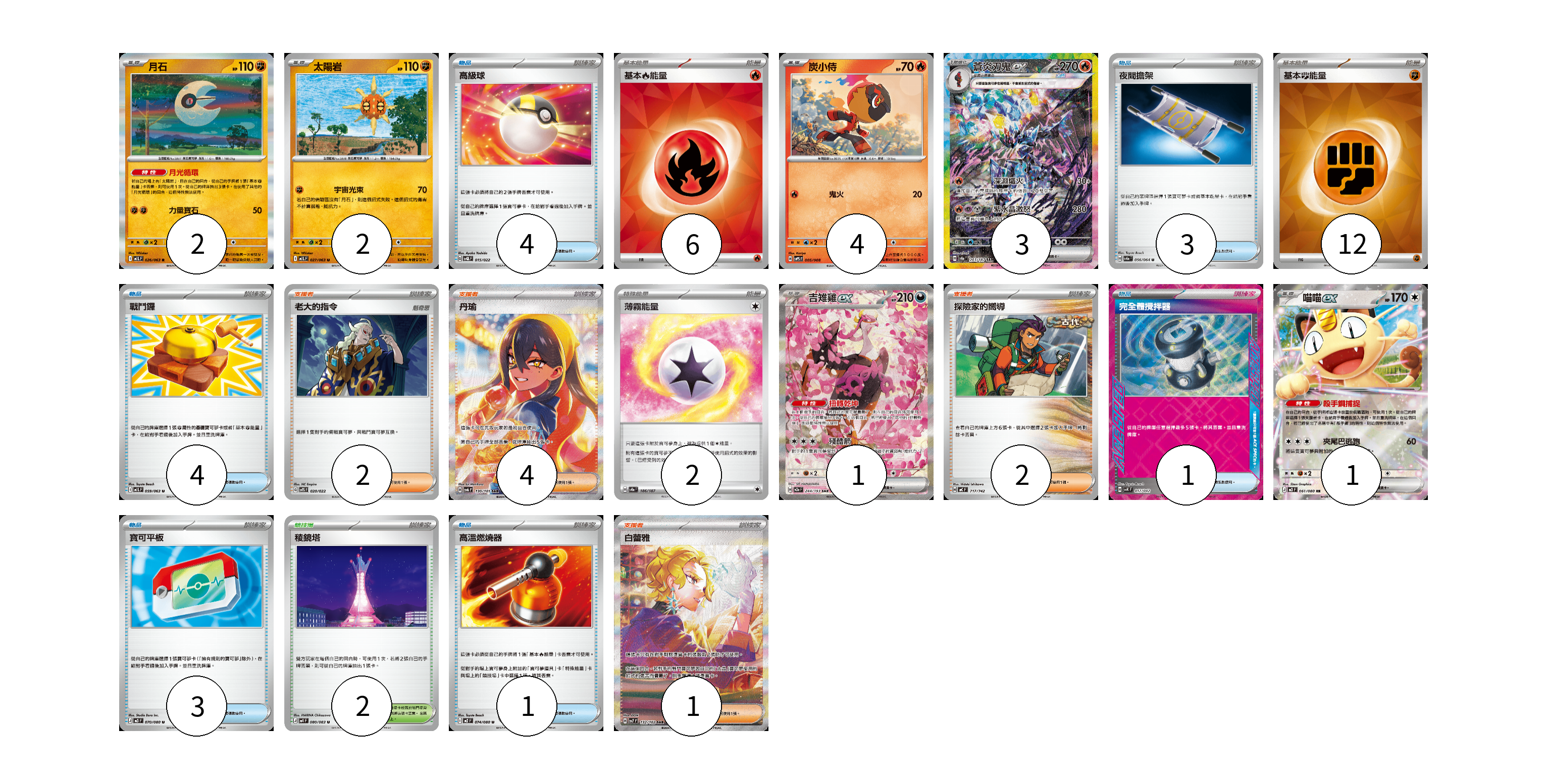 牌組構築方案 以此牌組為基礎新構築牌組 顯示卡面 顯示列表 寶可夢卡(13) 2 2 4 3 1 1 物品卡(16) 4 3 4 1 3 1 支援者卡(9) 2 4 2 1 競技場卡(2) 2 能量卡(20) 6 12 2 寶可夢卡(13) 卡牌名稱 張數 卡牌名稱 張數 月石 M1L 026/063 02 太陽岩 M1L 027/063 02 炭小侍 SVPS 005/008 04 蒼炎刃鬼ex SV8a 203/187 03 吉雉雞ex M2a 244/193 01 喵喵ex M3 061/080 01 物品卡(16) 卡牌名稱 張數 卡牌名稱 張數 高級球 SVQL 015/022 04 夜間擔架 SV6a 056/064 03 戰鬥鑼 M1L 059/063 04 完全體攪拌器 SVK 017/042 01 寶可平板 M3 070/080 03 高溫燃燒器 M2 074/080 01 支援者卡(9) 卡牌名稱 張數 卡牌名稱 張數 老大的指令 SVTS 020/022 02 丹瑜 SV6 130/101 04 探險家的嚮導 MC 717/742 02 白蕾雅 SV7 132/102 01 競技場卡(2) 卡牌名稱 張數 卡牌名稱 張數 稜鏡塔 M4 080/083 02 能量卡(20) 卡牌名稱 張數 卡牌名稱 張數 基本【火】能量 SVQL FIR 06 基本【鬥】能量 SVM FIG 12 薄霧能量 SV8a 186/187 02 以此牌組為基礎新構築牌組 牌組編碼 jyhYMG-kkzjJR-mFqupu copy 列印牌組單 牌組編碼已複製 分享至SNS