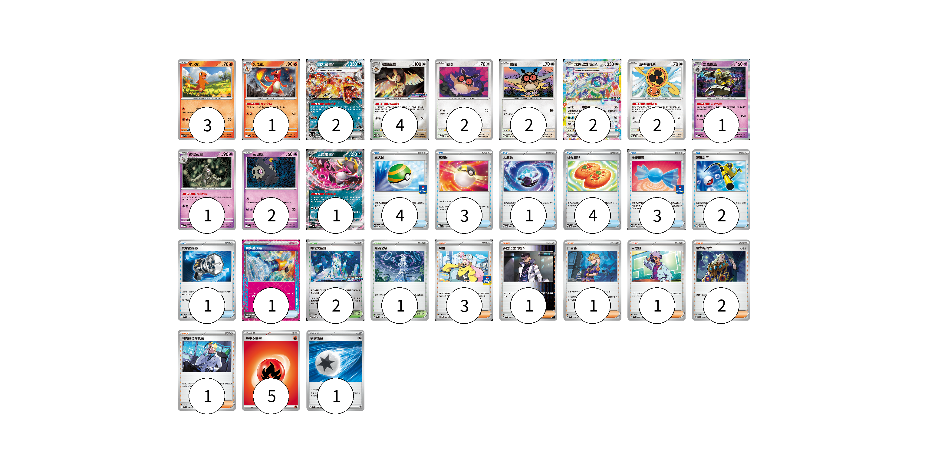 牌組構築方案 以此牌組為基礎新構築牌組 顯示卡面 顯示列表 寶可夢卡(25) 3 1 2 4 2 2 2 2 1 1 2 1 2 物品卡(17) 4 3 1 4 3 1 1 支援者卡(9) 3 1 1 1 2 1 競技場卡(3) 2 1 能量卡(6) 5 1 寶可夢卡(25) 卡牌名稱 張數 卡牌名稱 張數 小火龍 SVTL 001/021 03 火恐龍 SV4a 026/190 01 噴火龍ex SV4a 115/190 02 貓頭夜鷹 SV-P 145/SV-P 04 咕咕 SV5K 054/071 02 咕咕 SV7 076/102 02 太樂巴戈斯ex SV-P 148/SV-P 02 旋轉洛托姆 SV8a 131/187 02 黑夜魔靈 SV6a 020/064 01 彷徨夜靈 SV6a 019/064 01 夜巡靈 SV6a 018/064 02 吉雉雞ex SV6a 038/064 01 厲害釣竿 SVEL 010/020 02 物品卡(17) 卡牌名稱 張數 卡牌名稱 張數 巢穴球 SV-P 091/SV-P 04 高級球 SV1V 070/078 03 太晶珠 SV8a 145/187 01 好友寶芬 SV5K 063/071 04 神奇糖果 SV-P 104/SV-P 03 反擊捕捉器 SV8a 139/187 01 頂尖捕捉器 SV8a 148/187 01 支援者卡(9) 卡牌名稱 張數 卡牌名稱 張數 奇樹 SV-P 106/SV-P 03 弗圖博士的劇本 SV4M 065/066 01 白蕾雅 SV8a 176/187 01 吉尼亞 SV1S 074/078 01 老大的指令 SVEL 019/020 02 阿克羅瑪的執著 SV8a 164/187 01 競技場卡(3) 卡牌名稱 張數 卡牌名稱 張數 零之大空洞 SV-P 151/SV-P 02 阻礙之塔 SV8a 181/187 01 能量卡(6) 卡牌名稱 張數 卡牌名稱 張數 基本【火】能量 SVEL FIR 05 噴射能量 SV8a 185/187 01 以此牌組為基礎新構築牌組 牌組編碼 jyvdIM-tKrccx-qjoXbT copy 列印牌組單 牌組編碼已複製 分享至SNS