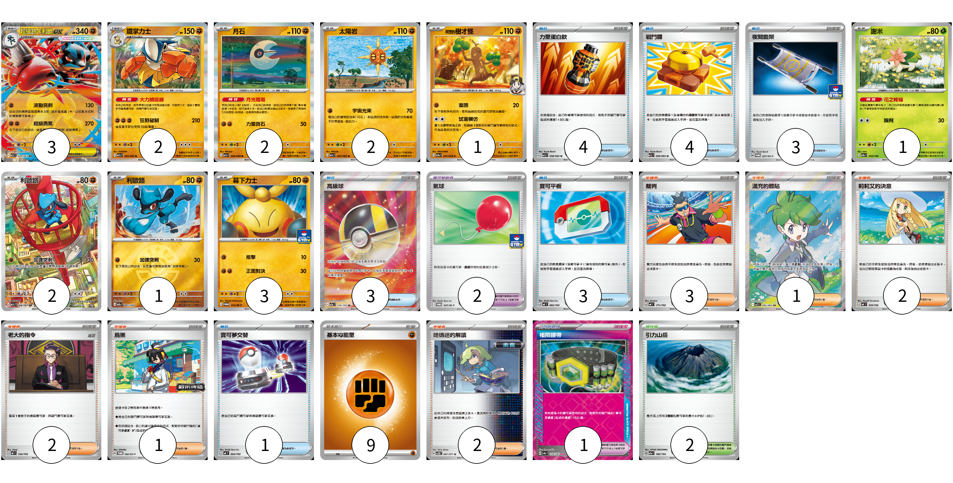 牌組構築方案 以此牌組為基礎新構築牌組 顯示卡面 顯示列表 寶可夢卡(17) 3 2 2 2 1 1 2 1 3 寶可夢道具(3) 2 1 物品卡(18) 4 4 3 3 3 1 支援者卡(11) 3 1 2 2 1 2 競技場卡(2) 2 能量卡(9) 9 寶可夢卡(17) 卡牌名稱 張數 卡牌名稱 張數 超級路卡利歐ex M1L 029/063 03 鐵掌力士 M1L 025/063 02 月石 M1L 026/063 02 太陽岩 M1L 027/063 02 <阿響的>樹才怪 SV9a 041/063 01 謝米 M2a 012/193 01 利歐路 M1L 068/063 02 利歐路 M2a 091/193 01 幕下力士 M-P 015/M-P 03 寶可夢道具(3) 卡牌名稱 張數 卡牌名稱 張數 氣球 M-P 047/M-P 02 極限腰帶 SV8a 159/187 01 物品卡(18) 卡牌名稱 張數 卡牌名稱 張數 力量蛋白飲 M1L 058/063 04 戰鬥鑼 M1L 059/063 04 夜間擔架 SV-P 227/SV-P 03 高級球 M2a 216/193 03 寶可平板 MC 662/742 03 寶可夢交替 MC 663/742 01 支援者卡(11) 卡牌名稱 張數 卡牌名稱 張數 裁判 MC 711/742 03 滿充的體貼 M1S 085/063 01 莉莉艾的決意 MC 729/742 02 老大的指令 MC 724/742 02 烏栗 SV-P 142/SV-P 01 暗碼迷的解讀 SV5M 067/071 02 競技場卡(2) 卡牌名稱 張數 卡牌名稱 張數 引力山岳 M2a 183/193 02 能量卡(9) 卡牌名稱 張數 卡牌名稱 張數 基本【鬥】能量 M-P FIG 09 以此牌組為基礎新構築牌組 牌組編碼 jzLoTS-vwJEAW-eyBajs copy 列印牌組單 牌組編碼已複製 分享至SNS
