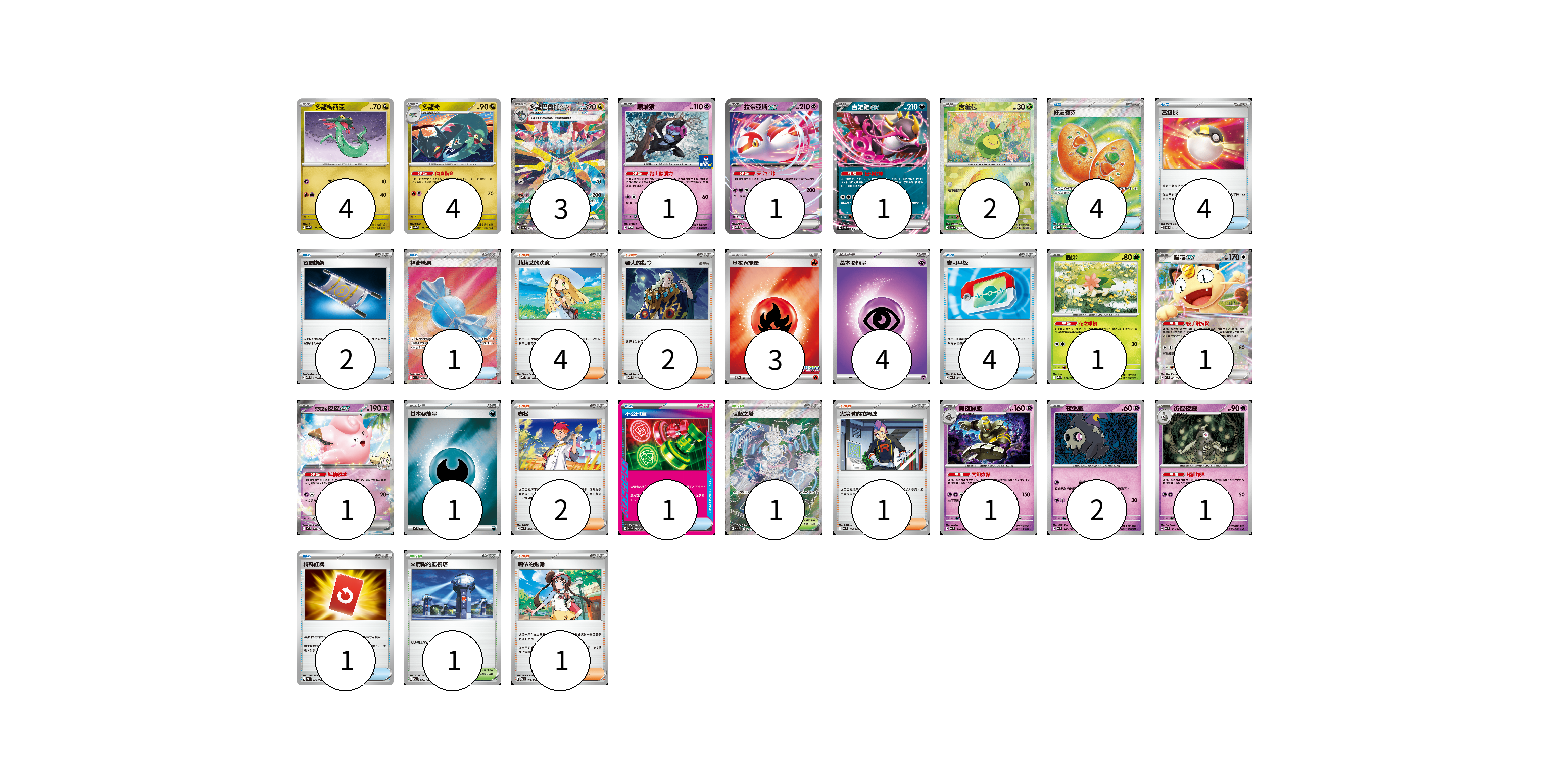 牌組構築方案 以此牌組為基礎新構築牌組 顯示卡面 顯示列表 寶可夢卡(23) 4 4 3 1 1 1 2 1 1 1 1 2 1 物品卡(17) 4 4 2 1 4 1 1 支援者卡(10) 4 2 2 1 1 競技場卡(2) 1 1 能量卡(8) 3 4 1 寶可夢卡(23) 卡牌名稱 張數 卡牌名稱 張數 多龍梅西亞 SV8a 118/187 04 多龍奇 SV8a 119/187 04 多龍巴魯托ex SV8a 221/187 03 願增猿 M-P 014/M-P 01 拉帝亞斯ex MBD 003/022 01 吉雉雞ex SVOD 004/020 01 含羞苞 SV8a 001/187 02 謝米 M2a 012/193 01 喵喵ex M3 061/080 01 莉莉艾的皮皮ex MC 287/742 01 黑夜魔靈 MC 310/742 01 夜巡靈 MC 308/742 02 彷徨夜靈 MC 309/742 01 物品卡(17) 卡牌名稱 張數 卡牌名稱 張數 好友寶芬 M1S 081/063 04 高級球 SVOD 012/020 04 夜間擔架 MBD 016/022 02 神奇糖果 M1S 082/063 01 寶可平板 MC 662/742 04 不公印章 MBD 011/022 01 特殊紅牌 M4 072/083 01 支援者卡(10) 卡牌名稱 張數 卡牌名稱 張數 莉莉艾的決意 MBD 021/022 04 老大的指令 MBD 020/022 02 赤松 MC 696/742 02 火箭隊的拉姆達 MC 734/742 01 鳴依的勉勵 M3 075/080 01 競技場卡(2) 卡牌名稱 張數 卡牌名稱 張數 阻礙之塔 M2a 222/193 01 火箭隊的監視塔 M2a 189/193 01 能量卡(8) 卡牌名稱 張數 卡牌名稱 張數 基本【火】能量 M-P 032/M-P 03 基本【超】能量 MBD PSY 04 基本【惡】能量 MC DAR 01 以此牌組為基礎新構築牌組 牌組編碼 kAMcqR-jLEAzU-UUPort copy 列印牌組單 牌組編碼已複製 分享至SNS