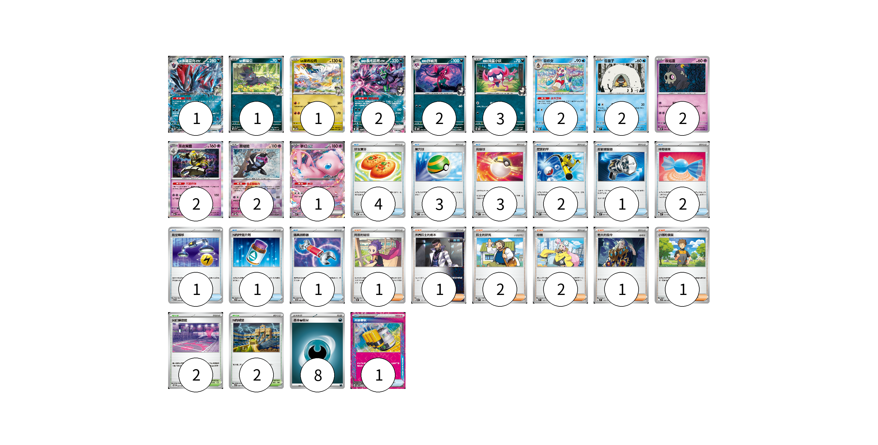 牌組構築方案 以此牌組為基礎新構築牌組 顯示卡面 顯示列表 寶可夢卡(21) 1 1 1 2 2 3 2 2 2 2 2 1 物品卡(19) 4 3 3 2 1 2 1 1 1 1 支援者卡(8) 1 1 2 2 1 1 競技場卡(4) 2 2 能量卡(8) 8 寶可夢卡(21) 卡牌名稱 張數 卡牌名稱 張數 N的索羅亞克ex SV9 061/100 01 N的索羅亞 SV9 060/100 01 N的萊希拉姆 SV9 074/100 01 <瑪俐的>長毛巨魔ex SVOM 007/021 02 <瑪俐的>詐唬魔 SVOM 006/021 02 <瑪俐的>搗蛋小妖 SVOM 005/021 03 雪妖女 SV8a 038/187 02 雪童子 SVM 034/175 02 夜巡靈 SV8a 064/187 02 黑夜魔靈 SV8a 066/187 02 願增猿 SV8a 075/187 02 夢幻ex SVK 001/042 01 物品卡(19) 卡牌名稱 張數 卡牌名稱 張數 好友寶芬 SV8a 147/187 04 巢穴球 SVM 133/175 03 高級球 SVM 134/175 03 厲害釣竿 SVK 011/042 02 反擊捕捉器 SVK 009/042 01 神奇糖果 SVK 019/042 02 能量轉移 SVTR 010/021 01 N的PP提升劑 SV9 089/100 01 道具拆除器 SV11W 080/086 01 高級香氛 SV5a 055/066 01 支援者卡(8) 卡牌名稱 張數 卡牌名稱 張數 阿杏的秘招 SV8a 166/187 01 弗圖博士的劇本 SV8a 175/187 01 博士的研究 SVM 164/175 02 奇樹 SVM 160/175 02 老大的指令 SVM 172/175 01 小剛的發掘 SV9 096/100 01 競技場卡(4) 卡牌名稱 張數 卡牌名稱 張數 尖釘鎮道館 SVOM 021/021 02 N的城堡 SV9 097/100 02 能量卡(8) 卡牌名稱 張數 卡牌名稱 張數 基本【惡】能量 SVF DAR 08 以此牌組為基礎新構築牌組 牌組編碼 kAShGm-fMAODk-kMytET copy 列印牌組單 牌組編碼已複製 分享至SNS
