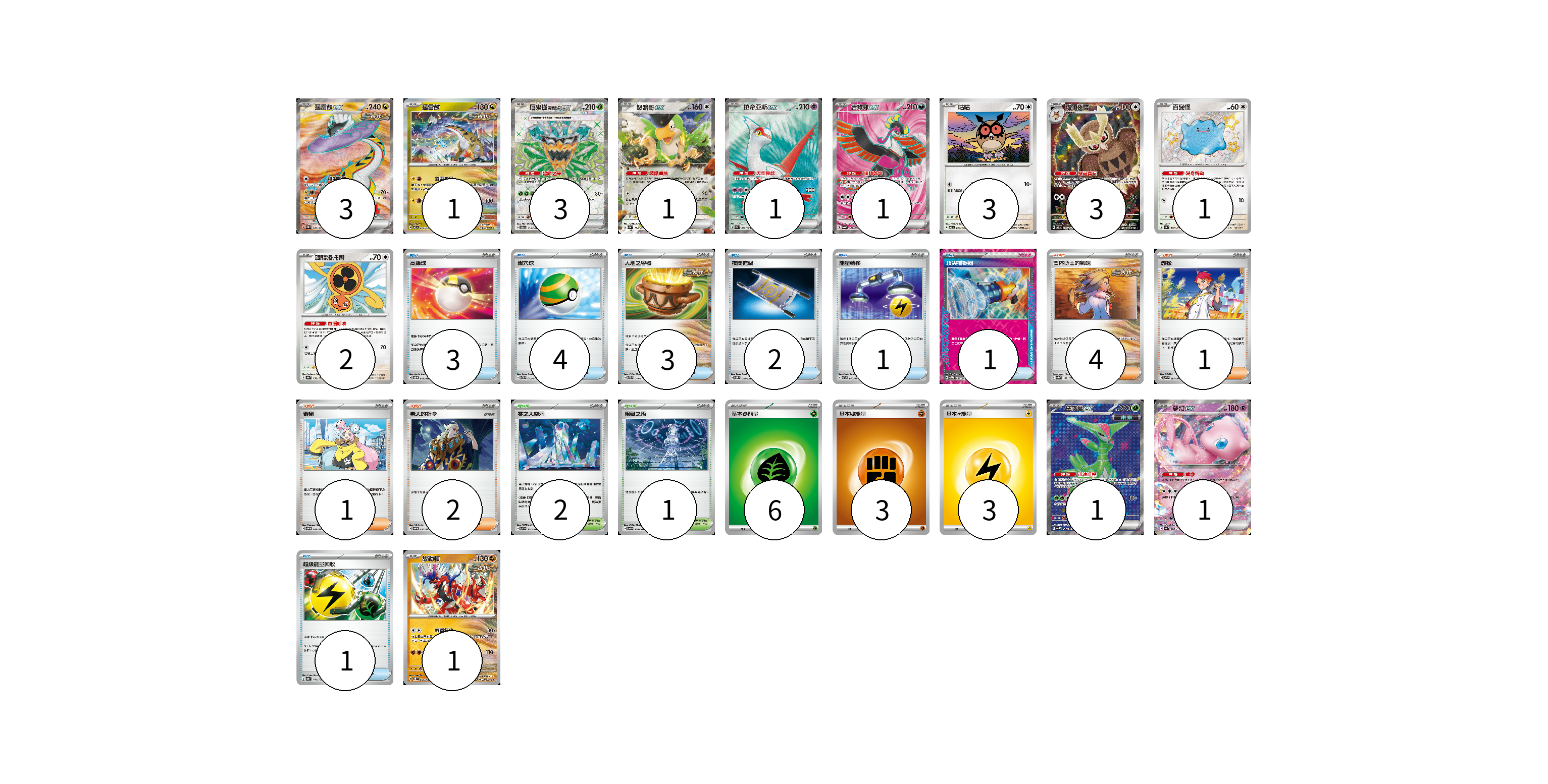 牌組構築方案 以此牌組為基礎新構築牌組 顯示卡面 顯示列表 寶可夢卡(22) 3 1 3 1 1 1 3 3 1 2 1 1 1 物品卡(15) 3 4 3 2 1 1 1 支援者卡(8) 4 1 1 2 競技場卡(3) 2 1 能量卡(12) 6 3 3 寶可夢卡(22) 卡牌名稱 張數 卡牌名稱 張數 猛雷鼓ex SV5K 089/071 03 猛雷鼓 SV7 075/102 01 厄鬼椪 碧草面具ex SV6 114/101 03 怒鸚哥ex SV4a 154/190 01 拉帝亞斯ex SV7a 078/064 01 吉雉雞ex SV6a 081/064 01 咕咕 SV7 076/102 03 貓頭夜鷹 SV7 114/102 03 百變怪 SV4a 309/190 01 旋轉洛托姆 SV8a 131/187 02 鐵斑葉ex SV5M 084/071 01 夢幻ex SV4a 076/190 01 故勒頓 SV8 069/106 01 物品卡(15) 卡牌名稱 張數 卡牌名稱 張數 高級球 SVOD 012/020 03 巢穴球 SVTG 012/019 04 大地之容器 SVTG 010/019 03 夜間擔架 SVOM 016/021 02 能量轉移 SVTR 010/021 01 頂尖捕捉器 SV5M 062/071 01 超級能量回收 SV8a 141/187 01 支援者卡(8) 卡牌名稱 張數 卡牌名稱 張數 奧琳博士的氣魄 SV8a 167/187 04 赤松 SV7 097/102 01 奇樹 SVOM 018/021 01 老大的指令 SVOM 020/021 02 競技場卡(3) 卡牌名稱 張數 卡牌名稱 張數 零之大空洞 SV7 102/102 02 阻礙之塔 SV6 100/101 01 能量卡(12) 卡牌名稱 張數 卡牌名稱 張數 基本草能量 sv-p GRA 06 基本鬥能量 sv-p FIG 03 基本雷能量 sv-p LIG 03 以此牌組為基礎新構築牌組 牌組編碼 kCHJCn-ogEVtD-SVEVXh copy 列印牌組單 牌組編碼已複製 分享至SNS