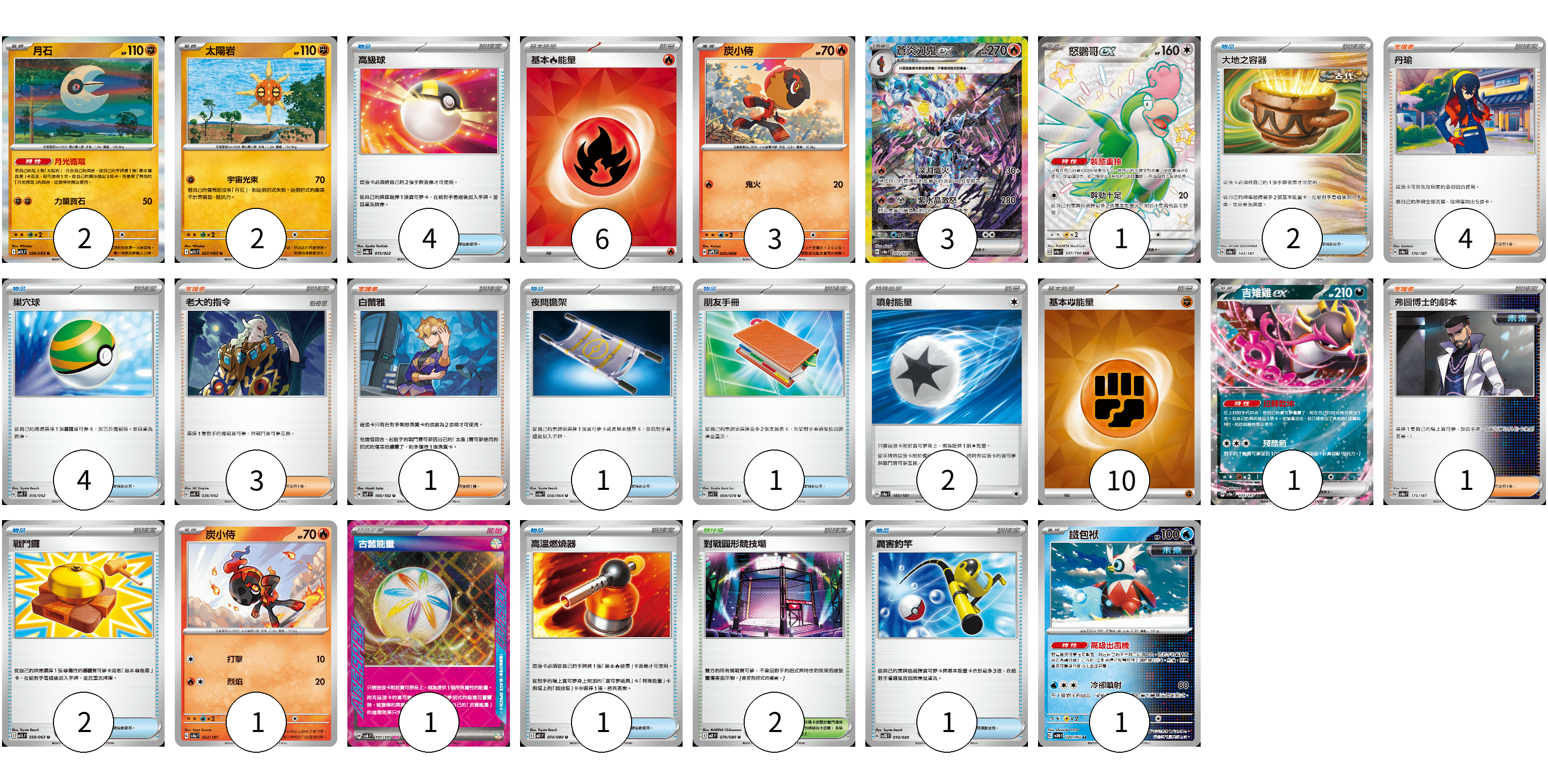 牌組構築方案 以此牌組為基礎新構築牌組 顯示卡面 顯示列表 寶可夢卡(14) 2 2 3 3 1 1 1 1 物品卡(16) 4 2 4 1 1 2 1 1 支援者卡(9) 4 3 1 1 競技場卡(2) 2 能量卡(19) 6 2 10 1 寶可夢卡(14) 卡牌名稱 張數 卡牌名稱 張數 月石 M1L 026/063 02 太陽岩 M1L 027/063 02 炭小侍 SVPS 005/008 03 蒼炎刃鬼ex SV8a 203/187 03 怒鸚哥ex SV4a 337/190 01 吉雉雞ex SV8a 104/187 01 炭小侍 SV8a 023/187 01 鐵包袱 SV4M 020/066 01 物品卡(16) 卡牌名稱 張數 卡牌名稱 張數 高級球 SVQL 015/022 04 大地之容器 SV8a 143/187 02 巢穴球 SVK 016/042 04 夜間擔架 SV6a 056/064 01 朋友手冊 SV1S 069/078 01 戰鬥鑼 M1L 059/063 02 高溫燃燒器 M2 074/080 01 厲害釣竿 SVOD 010/020 01 支援者卡(9) 卡牌名稱 張數 卡牌名稱 張數 丹瑜 SV8a 170/187 04 老大的指令 SVK 036/042 03 白蕾雅 SV7 100/102 01 弗圖博士的劇本 SV8a 175/187 01 競技場卡(2) 卡牌名稱 張數 卡牌名稱 張數 對戰圓形競技場 M2 079/080 02 能量卡(19) 卡牌名稱 張數 卡牌名稱 張數 基本【火】能量 SVQL FIR 06 噴射能量 SV8a 185/187 02 基本【鬥】能量 SVM FIG 10 古舊能量 SV6 101/101 01 以此牌組為基礎新構築牌組 牌組編碼 kCLkVt-mmGjjO-fXJpoA copy 列印牌組單 牌組編碼已複製 分享至SNS