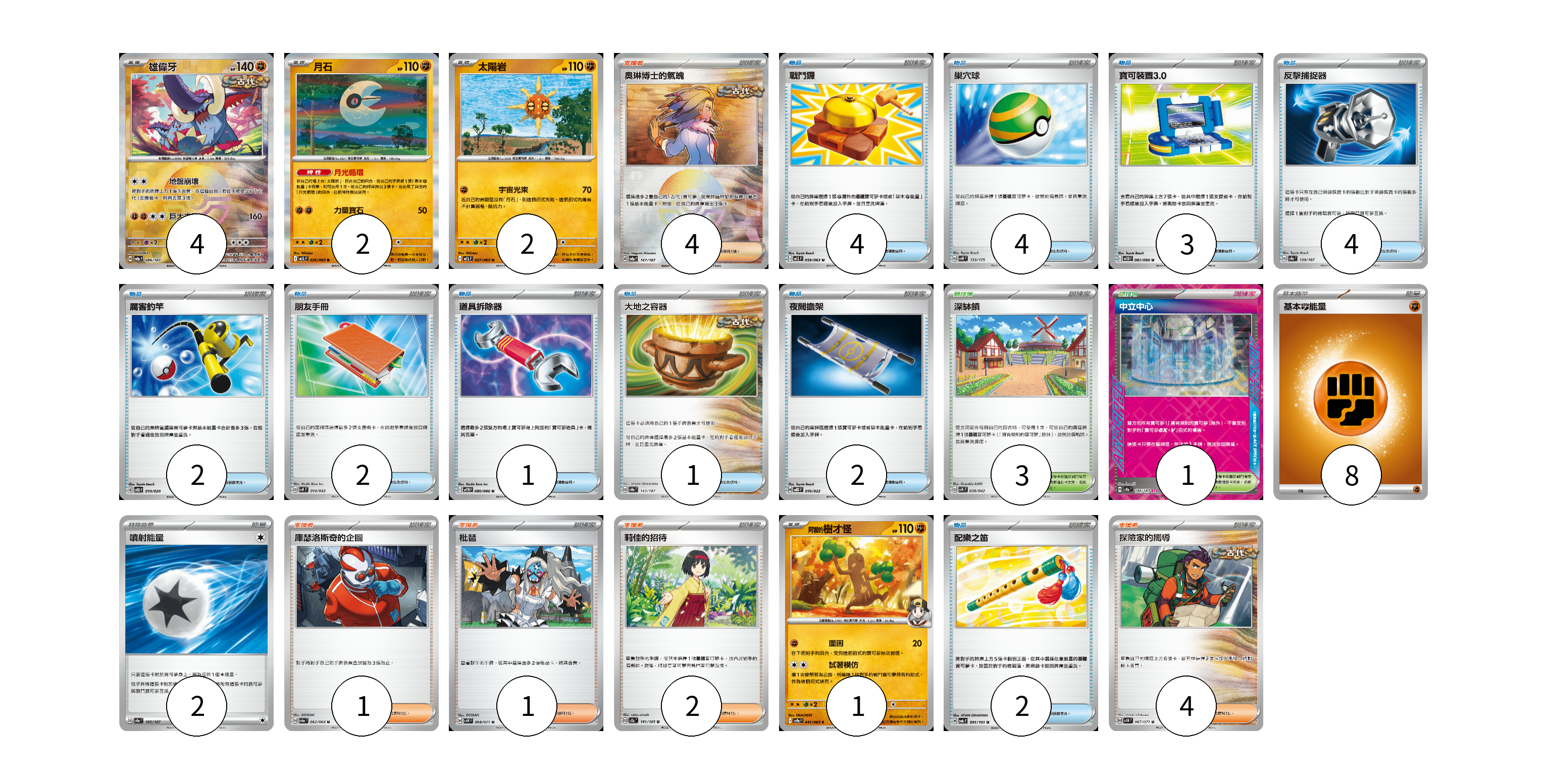 牌組構築方案 以此牌組為基礎新構築牌組 顯示卡面 顯示列表 寶可夢卡(9) 4 2 2 1 物品卡(25) 4 4 3 4 2 2 1 1 2 2 支援者卡(12) 4 1 1 2 4 競技場卡(4) 3 1 能量卡(10) 8 2 寶可夢卡(9) 卡牌名稱 張數 卡牌名稱 張數 雄偉牙 SV8a 086/187 04 月石 M1L 026/063 02 太陽岩 M1L 027/063 02 <阿響的>樹才怪 SV9a 041/063 01 物品卡(25) 卡牌名稱 張數 卡牌名稱 張數 戰鬥鑼 M1L 059/063 04 巢穴球 SVM 133/175 04 寶可裝置3.0 SV11B 081/086 03 反擊捕捉器 SV8a 139/187 04 厲害釣竿 SVOD 010/020 02 朋友手冊 SVK 014/042 02 道具拆除器 SV11W 080/086 01 大地之容器 SV8a 143/187 01 夜間擔架 MBD 016/022 02 配樂之笛 SV6 091/101 02 支援者卡(12) 卡牌名稱 張數 卡牌名稱 張數 奧琳博士的氣魄 SV8a 167/187 04 庫瑟洛斯奇的企圖 SV6a 062/064 01 枇琶 SV5K 068/071 01 莉佳的招待 SV2a 161/165 02 探險家的嚮導 SV5K 067/071 04 競技場卡(4) 卡牌名稱 張數 卡牌名稱 張數 深缽鎮 SVK 039/042 03 中立中心 SV8a 184/187 01 能量卡(10) 卡牌名稱 張數 卡牌名稱 張數 基本【鬥】能量 M-P FIG 08 噴射能量 SV8a 185/187 02 以此牌組為基礎新構築牌組 牌組編碼 kDfMrl-EcVXUU-rreQlN copy 列印牌組單 牌組編碼已複製 分享至SNS
