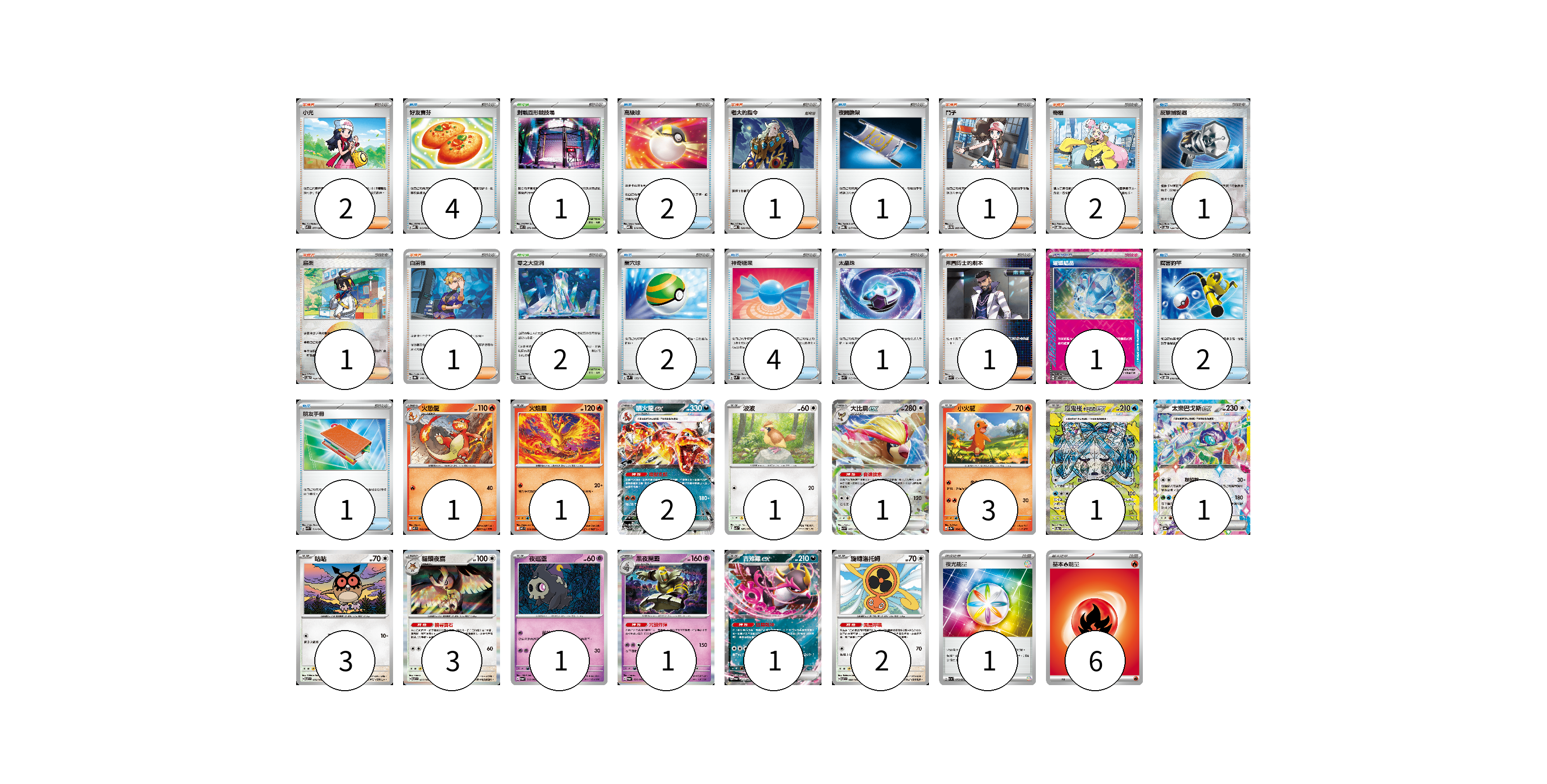 牌組構築方案 以此牌組為基礎新構築牌組 顯示卡面 顯示列表 寶可夢卡(22) 1 1 2 1 1 3 1 1 3 3 1 1 1 2 寶可夢道具(1) 1 物品卡(18) 4 2 1 1 2 4 1 2 1 支援者卡(9) 2 1 1 2 1 1 1 競技場卡(3) 1 2 能量卡(7) 1 6 寶可夢卡(22) 卡牌名稱 張數 卡牌名稱 張數 火恐龍 M2 012/080 01 火焰鳥 M2 014/080 01 噴火龍ex SV3 066/108 02 波波 SV3 087/108 01 大比鳥ex SV3 089/108 01 小火龍 SV2a 004/165 03 厄鬼椪 水井面具ex SV8a 208/187 01 太樂巴戈斯ex SV8a 136/187 01 咕咕 SV7 076/102 03 貓頭夜鷹 SV7 077/102 03 夜巡靈 SV6a 018/064 01 黑夜魔靈 SV6a 020/064 01 吉雉雞ex SV6a 038/064 01 旋轉洛托姆 SV7 080/102 02 寶可夢道具(1) 卡牌名稱 張數 卡牌名稱 張數 璀璨結晶 SV7 094/102 01 物品卡(18) 卡牌名稱 張數 卡牌名稱 張數 好友寶芬 MBD 013/022 04 高級球 MBD 014/022 02 夜間擔架 MBG 017/022 01 反擊捕捉器 SV8a 139/187 01 巢穴球 SVM 133/175 02 神奇糖果 SVM 135/175 04 太晶珠 SVK 013/042 01 厲害釣竿 SVOD 010/020 02 朋友手冊 SVK 014/042 01 支援者卡(9) 卡牌名稱 張數 卡牌名稱 張數 小光 M2 077/080 02 老大的指令 MBD 020/022 01 鬥子 SV11W 085/086 01 奇樹 SVOD 016/020 02 烏栗 SV8a 169/187 01 白蕾雅 SV8a 176/187 01 弗圖博士的劇本 SVK 034/042 01 競技場卡(3) 卡牌名稱 張數 卡牌名稱 張數 對戰圓形競技場 M2 079/080 01 零之大空洞 SV8a 182/187 02 能量卡(7) 卡牌名稱 張數 卡牌名稱 張數 夜光能量 SV1a 073/073 01 基本火能量 sv-p FIR 06 以此牌組為基礎新構築牌組 牌組編碼 kEofPp-mRKpWI-BREUzt copy 列印牌組單 牌組編碼已複製 分享至SNS