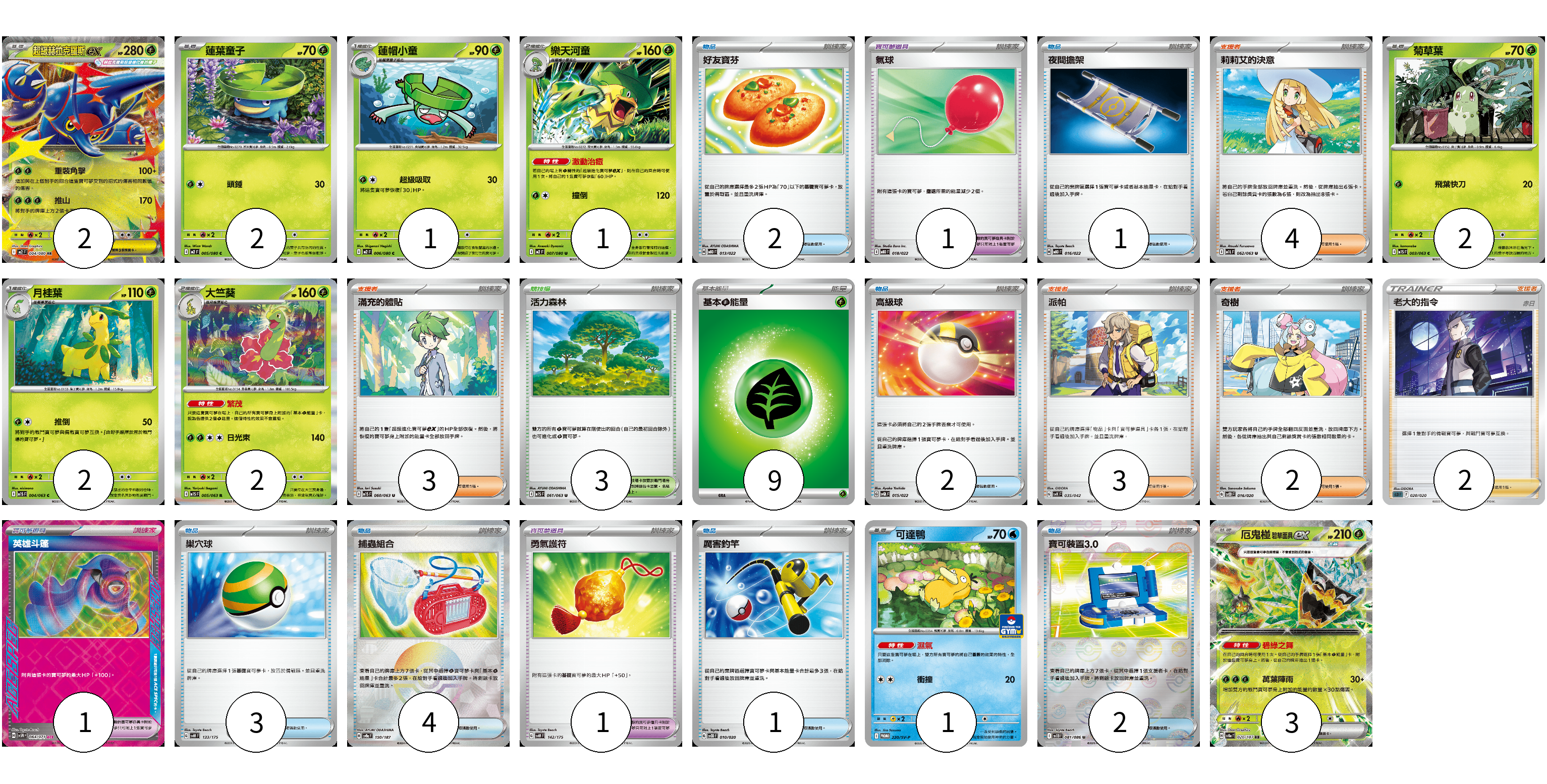 牌組構築方案 以此牌組為基礎新構築牌組 顯示卡面 顯示列表 寶可夢卡(16) 2 2 1 1 2 2 2 1 3 寶可夢道具(3) 1 1 1 物品卡(15) 2 1 2 3 4 1 2 支援者卡(14) 4 3 3 2 2 競技場卡(3) 3 能量卡(9) 9 寶可夢卡(16) 卡牌名稱 張數 卡牌名稱 張數 超級赫拉克羅斯ex M2 004/080 02 蓮葉童子 M2 005/080 02 蓮帽小童 M2 006/080 01 樂天河童 M2 007/080 01 菊草葉 M1S 003/063 02 月桂葉 M1S 004/063 02 大竺葵 M1S 005/063 02 可達鴨 SV-P 220/SV-P 01 厄鬼椪 碧草面具ex SV8a 020/187 03 寶可夢道具(3) 卡牌名稱 張數 卡牌名稱 張數 氣球 MBD 018/022 01 英雄斗篷 SV5M 064/071 01 勇氣護符 SVM 142/175 01 物品卡(15) 卡牌名稱 張數 卡牌名稱 張數 好友寶芬 MBD 013/022 02 夜間擔架 MBD 016/022 01 高級球 SVQL 015/022 02 巢穴球 SVM 133/175 03 捕蟲組合 SV8a 150/187 04 厲害釣竿 SVOD 010/020 01 寶可裝置3.0 SV11B 081/086 02 支援者卡(14) 卡牌名稱 張數 卡牌名稱 張數 莉莉艾的決意 M1L 062/063 04 滿充的體貼 M1S 060/063 03 派帕 SVK 035/042 03 奇樹 SVOD 016/020 02 老大的指令(赤日) SLD 020/020 02 競技場卡(3) 卡牌名稱 張數 卡牌名稱 張數 活力森林 M1S 061/063 03 能量卡(9) 卡牌名稱 張數 卡牌名稱 張數 基本【草】能量 M-P GRA 09 以此牌組為基礎新構築牌組 牌組編碼 kFLDaa-vKANLk-BKPEsW copy 列印牌組單 牌組編碼已複製 分享至SNS