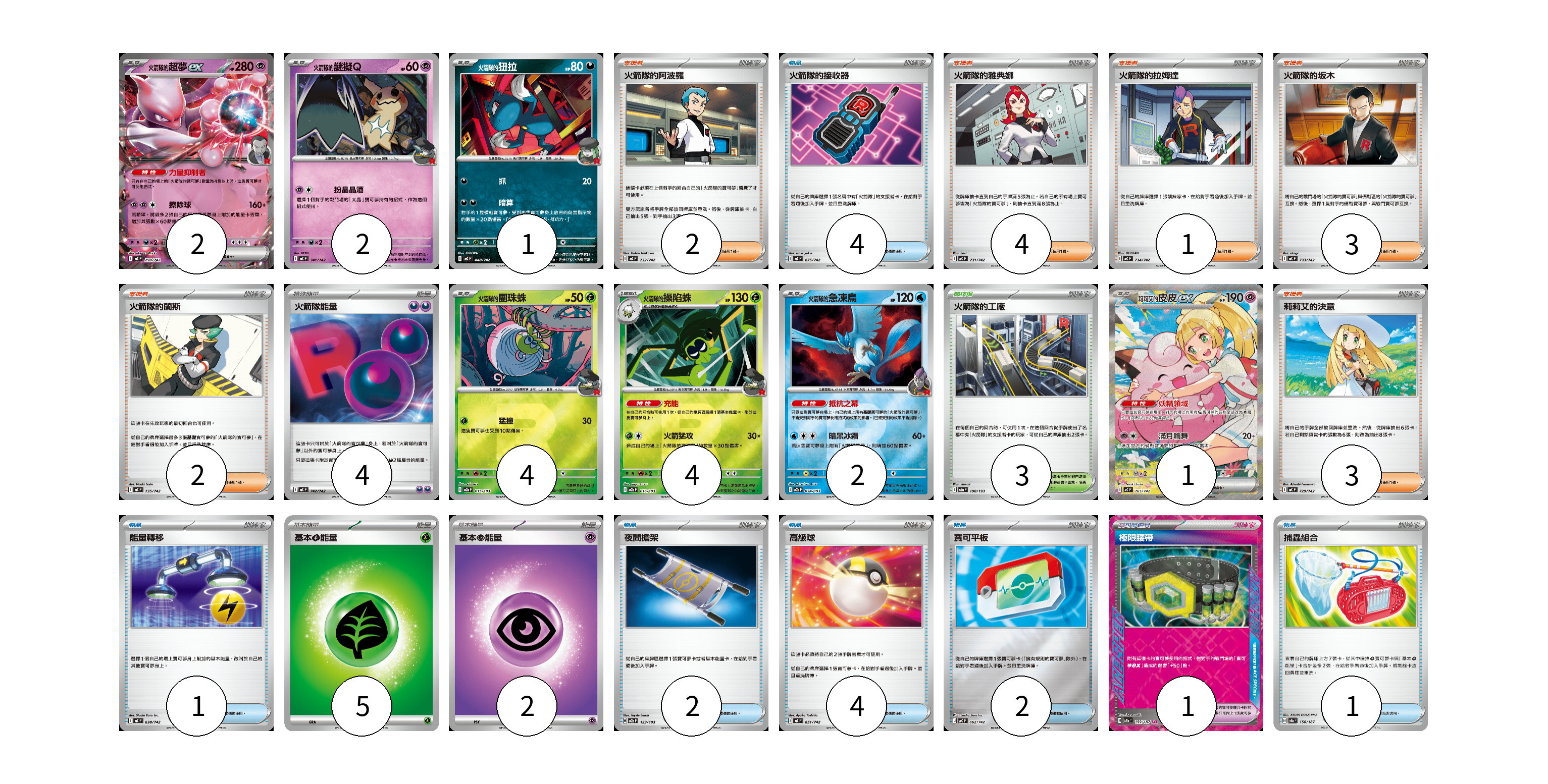 牌組構築方案 以此牌組為基礎新構築牌組 顯示卡面 顯示列表 寶可夢卡(16) 2 2 1 4 4 2 1 寶可夢道具(1) 1 物品卡(14) 4 1 2 4 2 1 支援者卡(15) 2 4 1 3 2 3 競技場卡(3) 3 能量卡(11) 4 5 2 寶可夢卡(16) 卡牌名稱 張數 卡牌名稱 張數 <火箭隊的>超夢ex MC 290/742 02 <火箭隊的>謎擬Q MC 341/742 02 <火箭隊的>狃拉 MC 448/742 01 <火箭隊的>團珠蛛 M2a 015/193 04 <火箭隊的>操陷蛛 M2a 016/193 04 <火箭隊的>急凍鳥 M2a 034/193 02 莉莉艾的皮皮ex MC 765/742 01 寶可夢道具(1) 卡牌名稱 張數 卡牌名稱 張數 極限腰帶 SV8a 159/187 01 物品卡(14) 卡牌名稱 張數 卡牌名稱 張數 火箭隊的接收器 MC 675/742 04 能量轉移 MC 638/742 01 夜間擔架 M2a 159/193 02 高級球 MC 651/742 04 寶可平板 MC 662/742 02 捕蟲組合 SV8a 150/187 01 支援者卡(15) 卡牌名稱 張數 卡牌名稱 張數 火箭隊的阿波羅 MC 732/742 02 火箭隊的雅典娜 MC 731/742 04 火箭隊的拉姆達 MC 734/742 01 火箭隊的坂木 MC 733/742 03 火箭隊的蘭斯 MC 735/742 02 莉莉艾的決意 MC 729/742 03 競技場卡(3) 卡牌名稱 張數 卡牌名稱 張數 火箭隊的工廠 M2a 190/193 03 能量卡(11) 卡牌名稱 張數 卡牌名稱 張數 火箭隊能量 MC 742/742 04 基本【草】能量 M-P GRA 05 基本【超】能量 MBD PSY 02 以此牌組為基礎新構築牌組 牌組編碼 kHvMxk-FzaIvE-QcirnP copy 列印牌組單 牌組編碼已複製 分享至SNS