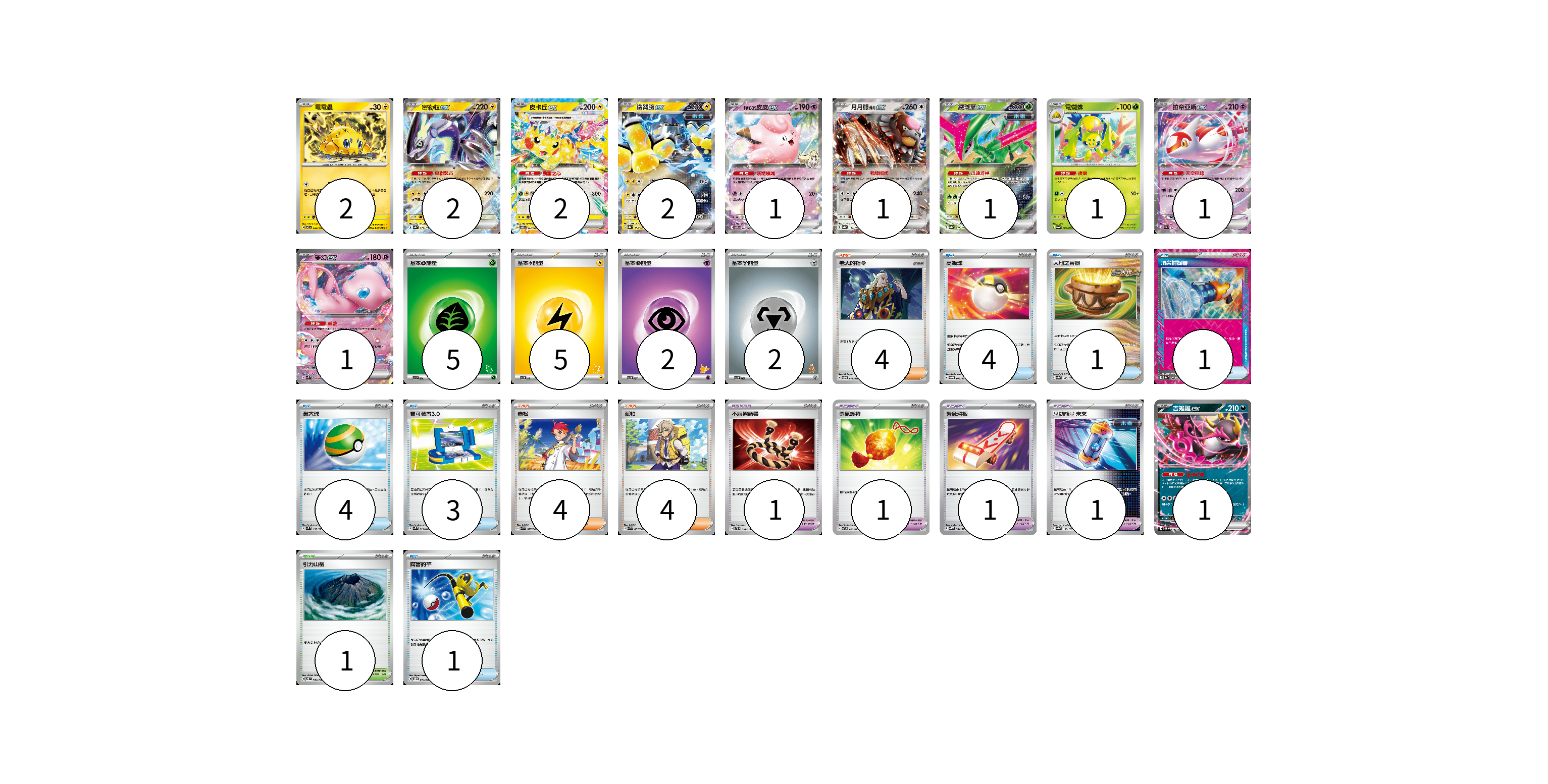 牌組構築方案 以此牌組為基礎新構築牌組 顯示卡面 顯示列表 寶可夢卡(15) 2 2 2 2 1 1 1 1 1 1 1 寶可夢道具(4) 1 1 1 1 物品卡(14) 4 1 1 4 3 1 支援者卡(12) 4 4 4 競技場卡(1) 1 能量卡(14) 5 5 2 2 寶可夢卡(15) 卡牌名稱 張數 卡牌名稱 張數 電電蟲 SV7 032/102 02 密勒頓ex SV4a 071/190 02 皮卡丘ex SV8 033/106 02 鐵臂膀ex SV8a 054/187 02 莉莉艾的皮皮ex SV9 033/100 01 月月熊 赫月ex SV8a 134/187 01 鐵斑葉ex SV8a 016/187 01 電蜘蛛 SV6a 002/064 01 拉帝亞斯ex SV7a 019/064 01 夢幻ex SVK 001/042 01 吉雉雞ex SVOM 009/021 01 寶可夢道具(4) 卡牌名稱 張數 卡牌名稱 張數 不服輸頭帶 SVTL 016/021 01 勇氣護符 SVTR 015/021 01 緊急滑板 SV5K 064/071 01 驅勁能量 未來 SV8a 158/187 01 物品卡(14) 卡牌名稱 張數 卡牌名稱 張數 高級球 SVOM 013/021 04 大地之容器 SV8a 143/187 01 頂尖捕捉器 SV8a 148/187 01 巢穴球 SVM 133/175 04 寶可裝置3.0 SVK 021/042 03 厲害釣竿 SVOD 010/020 01 支援者卡(12) 卡牌名稱 張數 卡牌名稱 張數 老大的指令 SVOD 019/020 04 赤松 SVK 027/042 04 派帕 SVK 035/042 04 競技場卡(1) 卡牌名稱 張數 卡牌名稱 張數 引力山岳 SV8 106/106 01 能量卡(14) 卡牌名稱 張數 卡牌名稱 張數 基本【草】能量 SVI GRA 05 基本【雷】能量 SVI LIG 05 基本【超】能量 SVI PSY 02 基本【鋼】能量 SVI MET 02 以此牌組為基礎新構築牌組 牌組編碼 kIZRPe-bMeqXP-EzxTzf copy 列印牌組單 牌組編碼已複製 分享至SNS