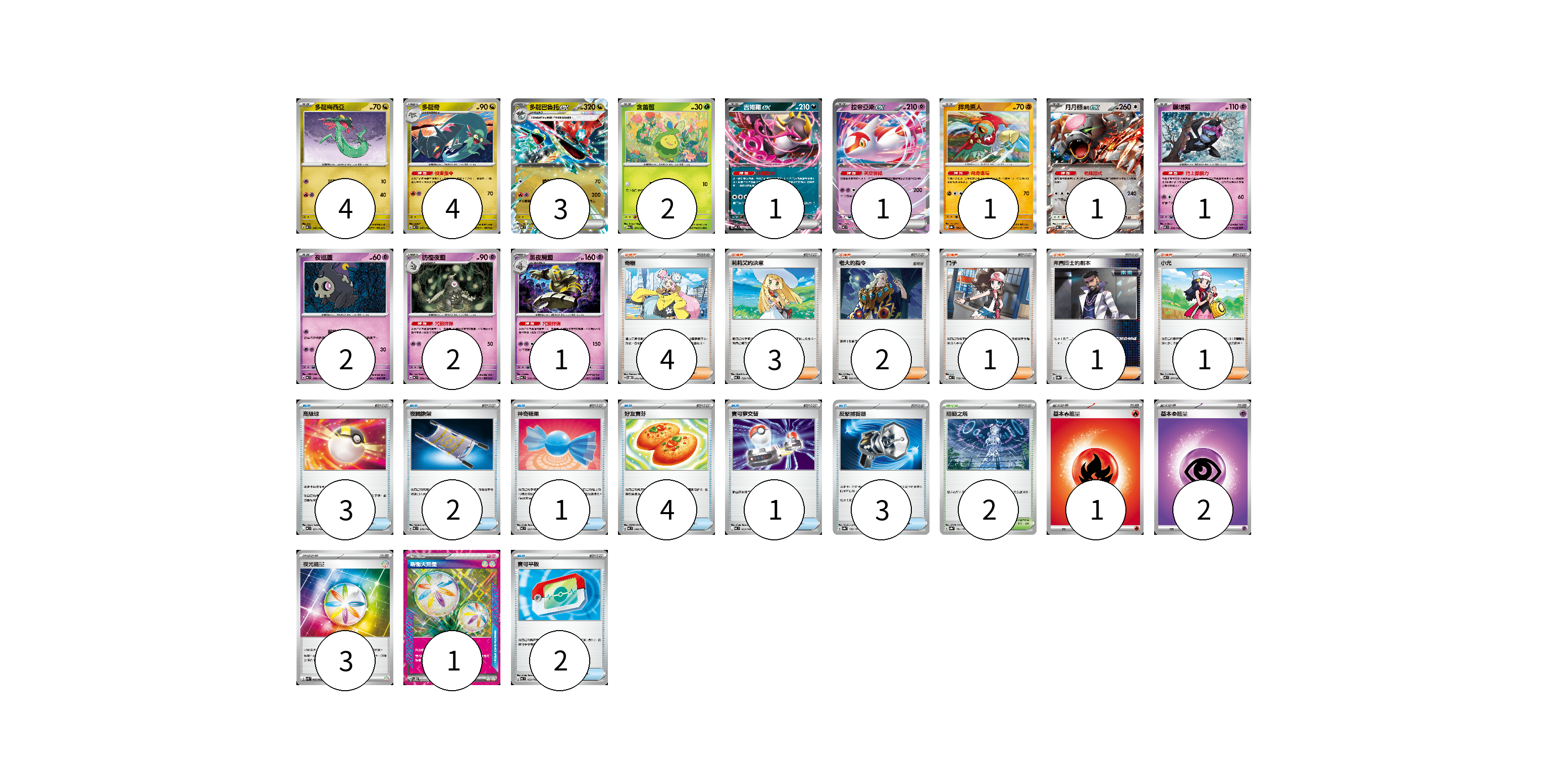 牌組構築方案 以此牌組為基礎新構築牌組 顯示卡面 顯示列表 寶可夢卡(23) 4 4 3 2 1 1 1 1 1 2 2 1 物品卡(16) 3 2 1 4 1 3 2 支援者卡(12) 4 3 2 1 1 1 競技場卡(2) 2 能量卡(7) 1 2 3 1 寶可夢卡(23) 卡牌名稱 張數 卡牌名稱 張數 多龍梅西亞 MC 546/742 04 多龍奇 MC 547/742 04 多龍巴魯托ex MC 548/742 03 含羞苞 M2a 011/193 02 吉雉雞ex MC 489/742 01 拉帝亞斯ex MC 312/742 01 摔角鷹人 SV8a 084/187 01 月月熊 赫月 ex MC 625/742 01 願增猿 MC 358/742 01 夜巡靈 MC 308/742 02 彷徨夜靈 MC 309/742 02 黑夜魔靈 MC 310/742 01 物品卡(16) 卡牌名稱 張數 卡牌名稱 張數 高級球 MC 651/742 03 夜間擔架 MC 670/742 02 神奇糖果 MC 655/742 01 好友寶芬 MC 648/742 04 寶可夢交替 MC 663/742 01 反擊捕捉器 SV8a 139/187 03 寶可平板 MC 662/742 02 支援者卡(12) 卡牌名稱 張數 卡牌名稱 張數 奇樹 SVOD 016/020 04 莉莉艾的決意 MC 729/742 03 老大的指令 MBD 020/022 02 鬥子 MC 718/742 01 弗圖博士的劇本 SV8a 175/187 01 小光 M2 077/080 01 競技場卡(2) 卡牌名稱 張數 卡牌名稱 張數 阻礙之塔 SV8a 181/187 02 能量卡(7) 卡牌名稱 張數 卡牌名稱 張數 基本【火】能量 MC FIR 01 基本【超】能量 MC PSY 02 夜光能量 SVK 042/042 03 新衝天能量 SV5K 071/071 01 以此牌組為基礎新構築牌組 牌組編碼 kIlhxC-jYSjdX-eJRQCC copy 列印牌組單 牌組編碼已複製 分享至SNS