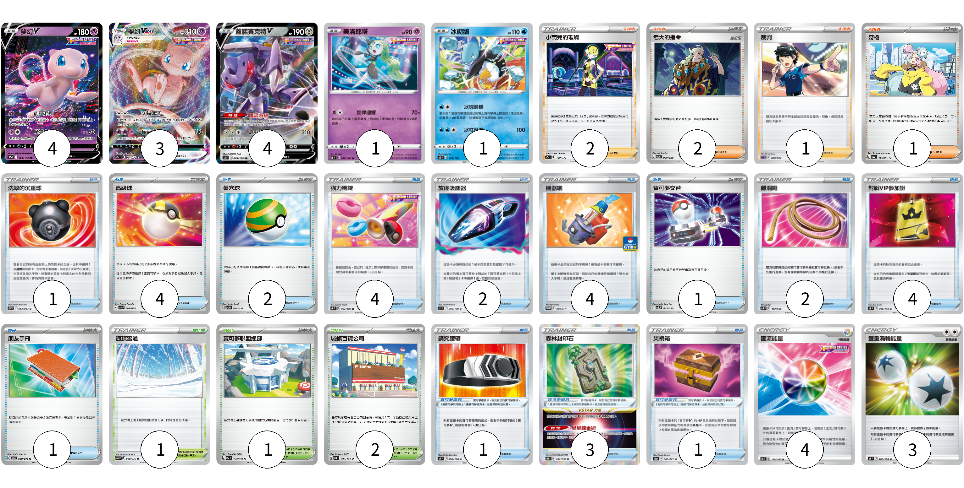 牌組構築方案 以此牌組為基礎新構築牌組 顯示卡面 顯示列表 寶可夢卡(13) 4 3 4 1 1 寶可夢道具(5) 1 3 1 物品卡(25) 1 4 2 4 2 4 1 2 4 1 支援者卡(6) 2 2 1 1 競技場卡(4) 1 1 2 能量卡(7) 4 3 寶可夢卡(13) 卡牌名稱 張數 卡牌名稱 張數 夢幻V S12a 053/172 04 夢幻VMAX S12a 054/172 03 蓋諾賽克特V S8 069/100 04 美洛耶塔 S8 048/100 01 冰砌鵝 S8b 041/184 01 寶可夢道具(5) 卡牌名稱 張數 卡牌名稱 張數 講究腰帶 S9 090/100 01 森林封印石 S12 092/098 03 災禍箱 S10a 066/071 01 物品卡(25) 卡牌名稱 張數 卡牌名稱 張數 洗翠的沉重球 S10P 062/067 01 高級球 SVB 002/028 04 巢穴球 SVAW 014/023 02 強力糖錠 S8 092/100 04 放逐吸塵器 S11 093/100 02 機器鶘 S-P 099/S-P 04 寶可夢交替 SVEL 015/020 01 離洞繩 SCB 117/156 02 對戰VIP參加證 S8 091/100 04 朋友手冊 SV1S 069/078 01 支援者卡(6) 卡牌名稱 張數 卡牌名稱 張數 小菊兒的璀璨 S12a 150/172 02 老大的指令 SVEM 020/020 02 裁判 SDM 020/022 01 奇樹 SV2D 069/071 01 競技場卡(4) 卡牌名稱 張數 卡牌名稱 張數 通頂雪道 S6H 069/070 01 寶可夢聯盟總部 SV3 108/108 01 城鎮百貨公司 SV3 107/108 02 能量卡(7) 卡牌名稱 張數 卡牌名稱 張數 匯流能量 S8 100/100 04 雙重渦輪能量 S9 100/100 03 以此牌組為基礎新構築牌組 牌組編碼 kJnoTF-rpwDuC-sOlKtg copy 列印牌組單 牌組編碼已複製 分享至SNS