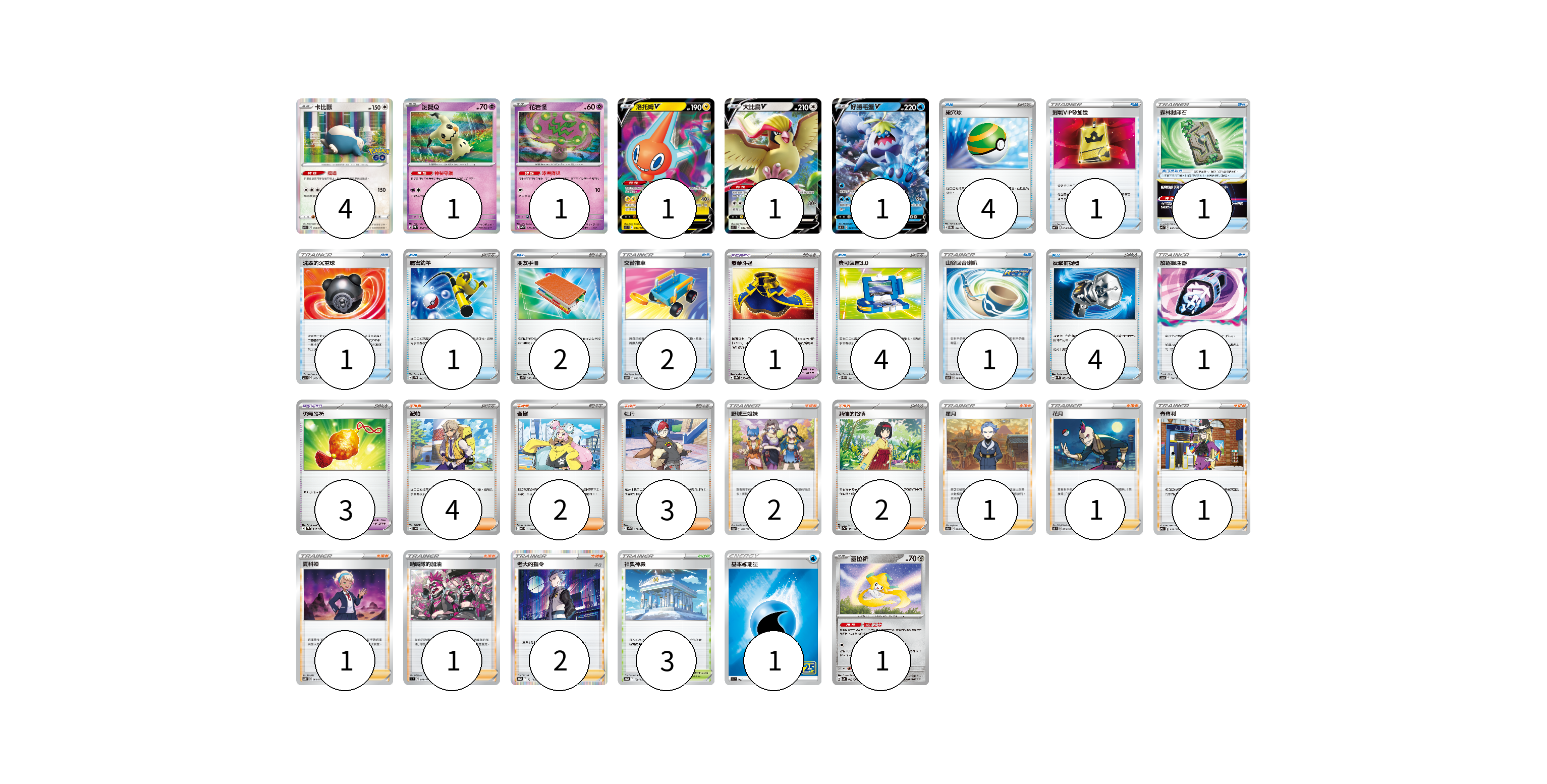 牌組構築方案 以此牌組為基礎新構築牌組 顯示卡面 顯示列表 寶可夢卡(10) 4 1 1 1 1 1 1 寶可夢道具(4) 1 3 物品卡(22) 4 1 1 1 1 2 2 4 1 4 1 支援者卡(20) 4 2 3 2 2 1 1 1 1 1 2 競技場卡(3) 3 能量卡(1) 1 寶可夢卡(10) 卡牌名稱 張數 卡牌名稱 張數 卡比獸 S10b 056/071 04 謎擬Q SV2P 034/071 01 花岩怪 SV2D 028/071 01 洛托姆V S11 037/100 01 大比鳥V S11 082/100 01 好勝毛蟹V S8 026/100 01 基拉祈 SV3a 042/062 01 寶可夢道具(4) 卡牌名稱 張數 卡牌名稱 張數 豪華斗篷 SV3a 055/062 01 勇氣護符 SV2D 067/071 03 物品卡(22) 卡牌名稱 張數 卡牌名稱 張數 巢穴球 SVEM 012/020 04 對戰VIP參加證 SVF 018/038 01 森林封印石 SVF 024/038 01 洗翠的沉重球 S12a 140/172 01 厲害釣竿 SVF 013/038 01 朋友手冊 SV1S 069/078 02 交替推車 S10D 060/067 02 寶可裝置3.0 SVEL 014/020 04 山谷回音喇叭 S5a 064/070 01 反擊捕捉器 SV4M 059/066 04 放逐吸塵器 S12a 144/172 01 支援者卡(20) 卡牌名稱 張數 卡牌名稱 張數 派帕 SVD 137/139 04 奇樹 SVEL 016/020 02 牡丹 SV1S 077/078 03 野賊三姐妹 S10a 070/071 02 莉佳的招待 SV2a 161/165 02 星月 S9a 064/067 01 花月 S8 095/100 01 賽寶利 SVF 027/038 01 夏科婭 S6K 066/070 01 呐喊隊的加油 SI 388/414 01 老大的指令(赤日) S12a 161/172 02 競技場卡(3) 卡牌名稱 張數 卡牌名稱 張數 神奧神殿 S12a 169/172 03 能量卡(1) 卡牌名稱 張數 卡牌名稱 張數 基本水能量 S8a WAT 01 以此牌組為基礎新構築牌組 牌組編碼 kLkfqO-NHCOJh-pxDbum copy 列印牌組單 牌組編碼已複製 分享至SNS