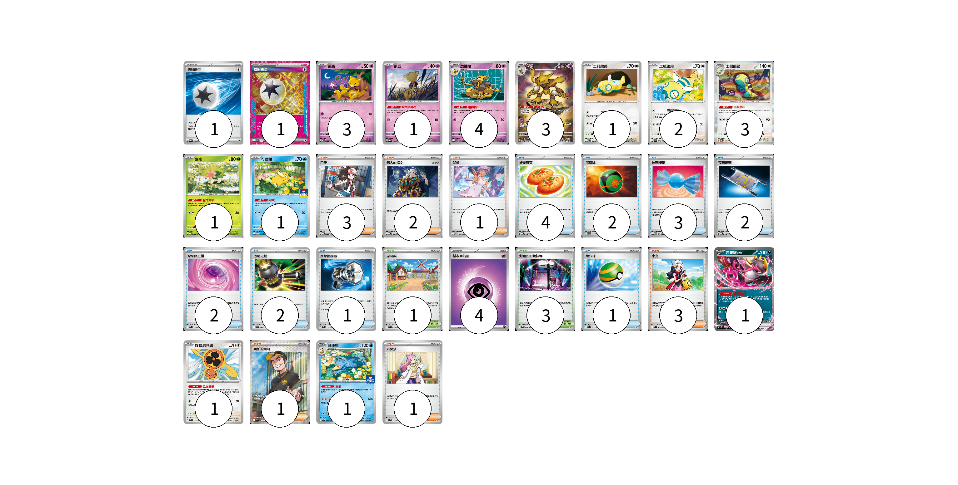 牌組構築方案 以此牌組為基礎新構築牌組 顯示卡面 顯示列表 寶可夢卡(22) 3 1 4 3 1 2 3 1 1 1 1 1 物品卡(17) 4 2 3 2 2 2 1 1 支援者卡(11) 3 2 1 3 1 1 競技場卡(4) 1 3 能量卡(6) 1 1 4 寶可夢卡(22) 卡牌名稱 張數 卡牌名稱 張數 凱西 M1S 036/063 03 凱西 SV8a 057/187 01 勇基拉 M1S 037/063 04 胡地 M1S 071/063 03 土龍弟弟 SV9 078/100 01 土龍弟弟 SVM 095/175 02 土龍節節 SV8a 130/187 03 謝米 SV9a 006/063 01 可達鴨 SV-P 220/SV-P 01 吉雉雞ex SVOD 004/020 01 旋轉洛托姆 SV8a 131/187 01 哥達鴨 SV-P 221/SV-P 01 物品卡(17) 卡牌名稱 張數 卡牌名稱 張數 好友寶芬 MBD 013/022 04 黑暗球 SV7a 054/064 02 神奇糖果 MBG 013/022 03 夜間擔架 MBD 016/022 02 奇跡修正檔 MBD 017/022 02 改造之錘 SV8a 138/187 02 反擊捕捉器 SV8a 139/187 01 巢穴球 SVM 133/175 01 支援者卡(11) 卡牌名稱 張數 卡牌名稱 張數 鬥子 SV11W 085/086 03 老大的指令 MBD 020/022 02 莉普 SVTS 021/022 01 小光 M2 077/080 03 可怕的哥哥 SV9 122/100 01 米莫莎 SV1V 077/078 01 競技場卡(4) 卡牌名稱 張數 卡牌名稱 張數 深缽鎮 SVK 039/042 01 對戰圓形競技場 M2 079/080 03 能量卡(6) 卡牌名稱 張數 卡牌名稱 張數 噴射能量 SV8a 185/187 01 富裕能量 SV7a 064/064 01 基本【超】能量 MBD PSY 04 以此牌組為基礎新構築牌組 牌組編碼 kNkVwc-HPzAjb-JMPGIB copy 列印牌組單 牌組編碼已複製 分享至SNS