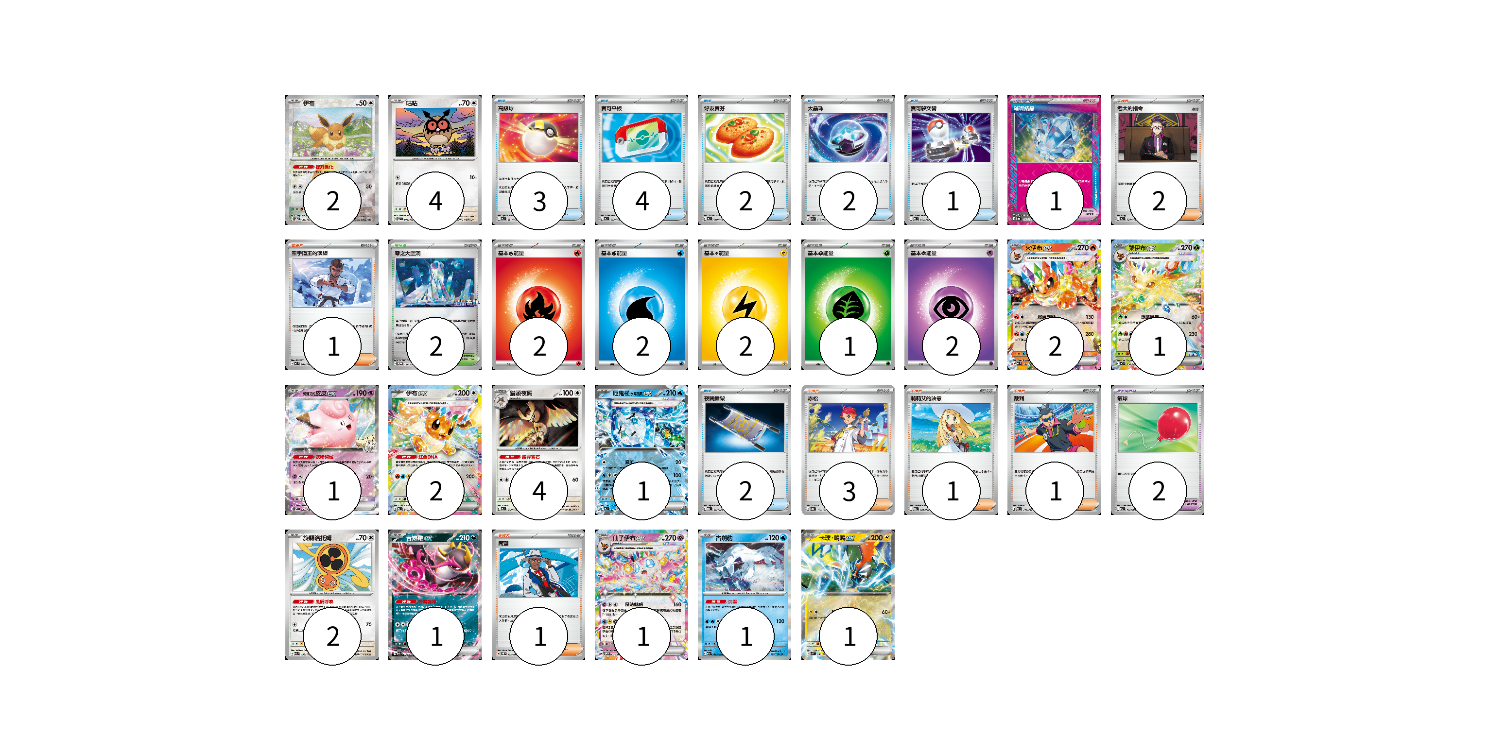 牌組構築方案 以此牌組為基礎新構築牌組 顯示卡面 顯示列表 寶可夢卡(23) 2 4 2 1 1 2 4 1 2 1 1 1 1 寶可夢道具(3) 1 2 物品卡(14) 3 4 2 2 1 2 支援者卡(9) 2 1 3 1 1 1 競技場卡(2) 2 能量卡(9) 2 2 2 1 2 寶可夢卡(23) 卡牌名稱 張數 卡牌名稱 張數 伊布 SV8a 125/187 02 咕咕 SV7 076/102 04 火伊布ex MC 094/742 02 葉伊布ex MC 038/742 01 莉莉艾的皮皮ex SV9 033/100 01 伊布ex MC 566/742 02 貓頭夜鷹 MC 573/742 04 厄鬼椪 水井面具ex MC 224/742 01 旋轉洛托姆 M2a 139/193 02 吉雉雞ex M2a 114/193 01 仙子伊布ex SVPN 005/008 01 古劍豹 M2a 043/193 01 卡璞・鳴鳴ex SVM 046/175 01 寶可夢道具(3) 卡牌名稱 張數 卡牌名稱 張數 璀璨結晶 SV8a 152/187 01 氣球 M2a 165/193 02 物品卡(14) 卡牌名稱 張數 卡牌名稱 張數 高級球 MC 651/742 03 寶可平板 MC 662/742 04 好友寶芬 MC 648/742 02 太晶珠 SVK 013/042 02 寶可夢交替 MC 663/742 01 夜間擔架 MBG 017/022 02 支援者卡(9) 卡牌名稱 張數 卡牌名稱 張數 老大的指令 MC 724/742 02 空手道王的演練 MC 704/742 01 赤松 SV8a 163/187 03 莉莉艾的決意 MBD 021/022 01 裁判 MC 711/742 01 席藍 SV8 102/106 01 競技場卡(2) 卡牌名稱 張數 卡牌名稱 張數 零之大空洞 SV-P 151/SV-P 02 能量卡(9) 卡牌名稱 張數 卡牌名稱 張數 基本【火】能量 MC FIR 02 基本【水】能量 MC WAT 02 基本【雷】能量 MC LIG 02 基本【草】能量 MC GRA 01 基本【超】能量 MC PSY 02 以此牌組為基礎新構築牌組 牌組編碼 kNpgBy-fqdWit-tRmoNK copy 列印牌組單 牌組編碼已複製 分享至SNS