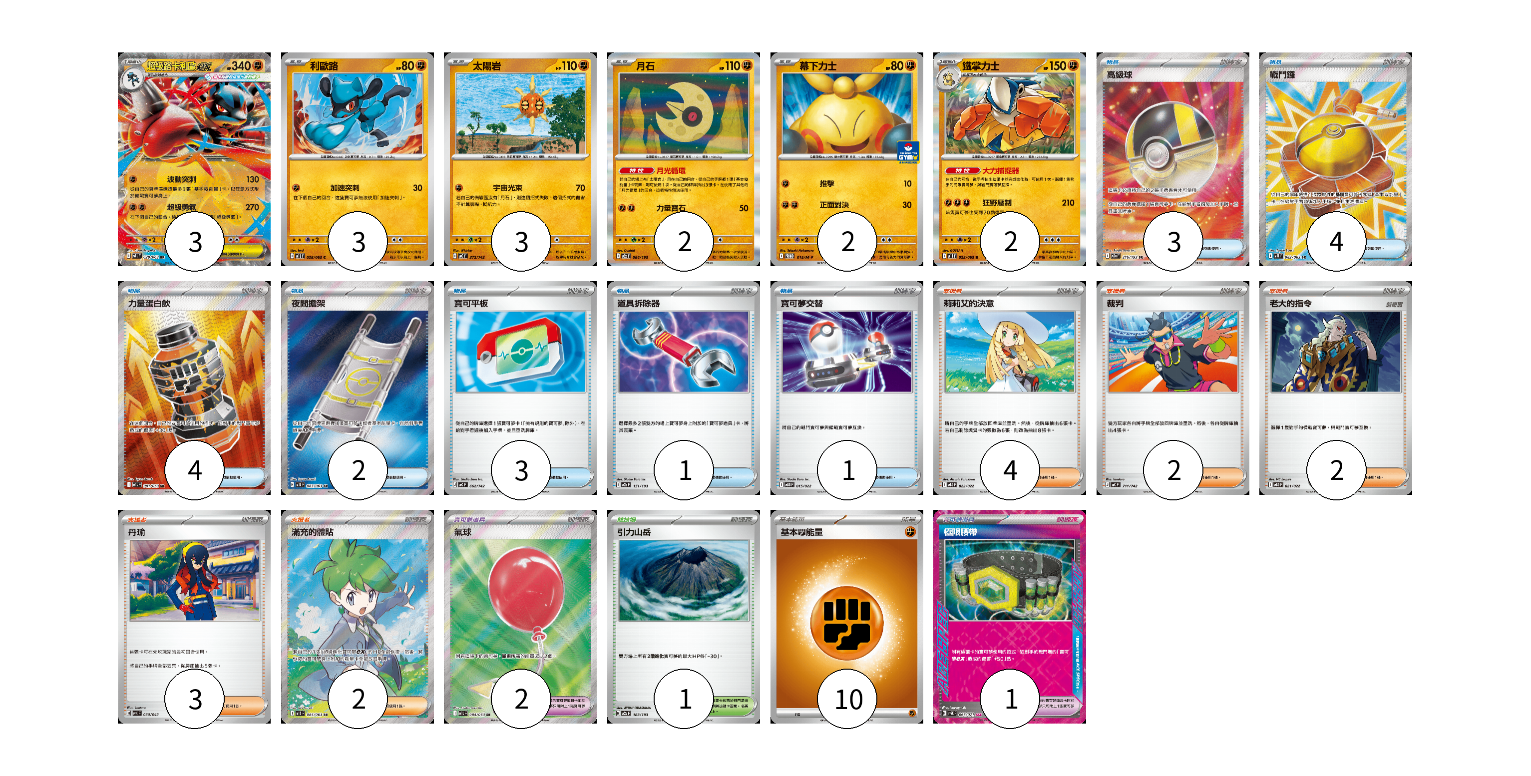 牌組構築方案 以此牌組為基礎新構築牌組 顯示卡面 顯示列表 寶可夢卡(15) 3 3 3 2 2 2 寶可夢道具(3) 2 1 物品卡(18) 3 4 4 2 3 1 1 支援者卡(13) 4 2 2 3 2 競技場卡(1) 1 能量卡(10) 10 寶可夢卡(15) 卡牌名稱 張數 卡牌名稱 張數 超級路卡利歐ex M1L 029/063 03 利歐路 M1L 028/063 03 太陽岩 MC 372/742 03 月石 M2a 086/193 02 幕下力士 M-P 015/M-P 02 鐵掌力士 M1L 025/063 02 寶可夢道具(3) 卡牌名稱 張數 卡牌名稱 張數 氣球 M1L 084/063 02 極限腰帶 SV5K 066/071 01 物品卡(18) 卡牌名稱 張數 卡牌名稱 張數 高級球 M2a 216/193 03 戰鬥鑼 M1L 082/063 04 力量蛋白飲 M1L 081/063 04 夜間擔架 M1L 083/063 02 寶可平板 MC 662/742 03 道具拆除器 M2a 151/193 01 寶可夢交替 MBG 015/022 01 支援者卡(13) 卡牌名稱 張數 卡牌名稱 張數 莉莉艾的決意 MBG 022/022 04 裁判 MC 711/742 02 老大的指令 MBG 021/022 02 丹瑜 SVK 030/042 03 滿充的體貼 M1S 085/063 02 競技場卡(1) 卡牌名稱 張數 卡牌名稱 張數 引力山岳 M2a 183/193 01 能量卡(10) 卡牌名稱 張數 卡牌名稱 張數 基本【鬥】能量 MC FIG 10 以此牌組為基礎新構築牌組 牌組編碼 kPdzTC-kKITUz-nPmrNY copy 列印牌組單 牌組編碼已複製 分享至SNS