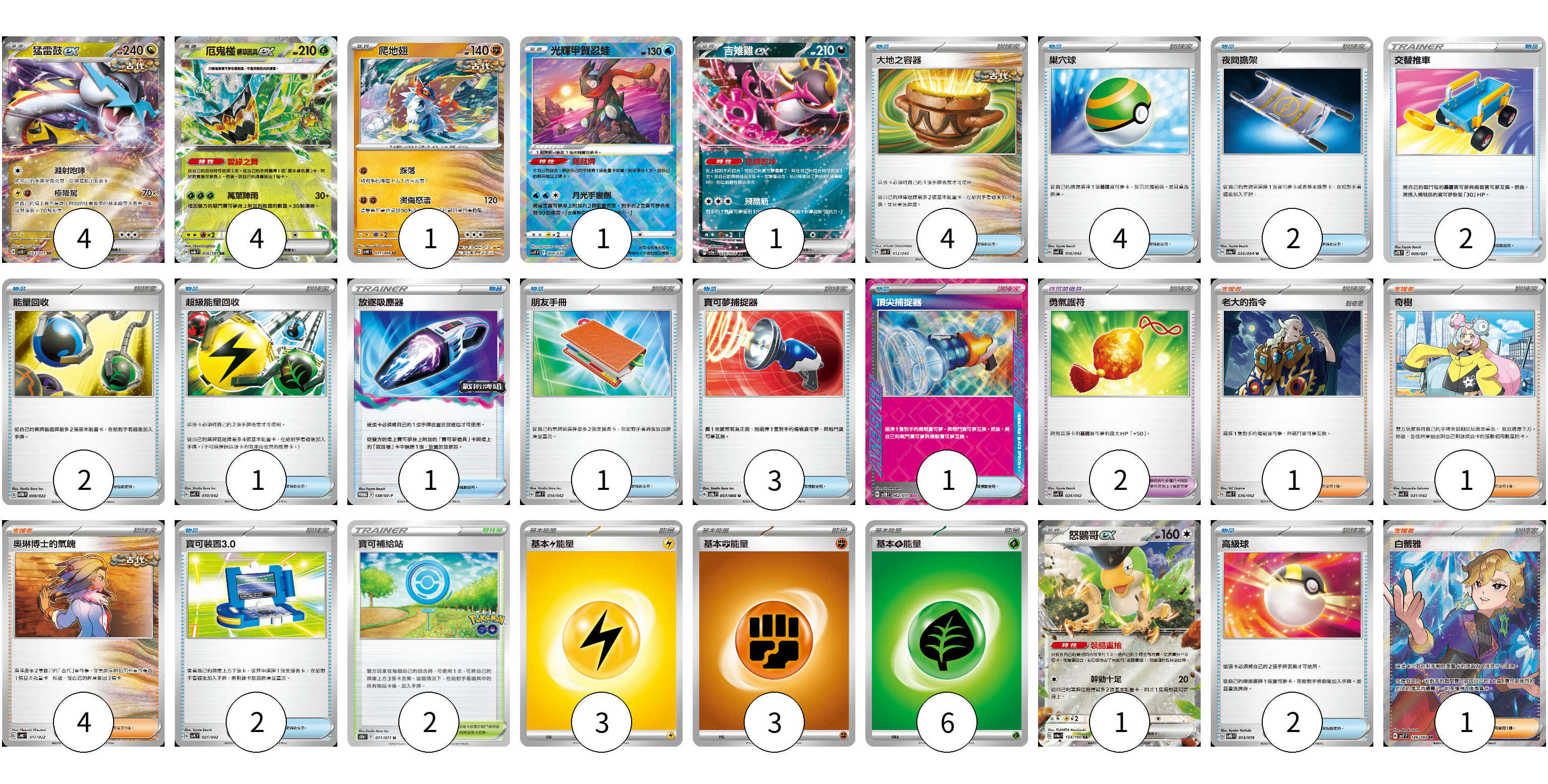 牌組構築方案 以此牌組為基礎新構築牌組 顯示卡面 顯示列表 寶可夢卡(12) 4 4 1 1 1 1 寶可夢道具(2) 2 物品卡(25) 4 4 2 2 2 1 1 1 3 1 2 2 支援者卡(7) 1 1 4 1 競技場卡(2) 2 能量卡(12) 3 3 6 寶可夢卡(12) 卡牌名稱 張數 卡牌名稱 張數 猛雷鼓ex SV5K 053/071 04 厄鬼椪 碧草面具ex SV6 016/101 04 爬地翅 SV4K 041/066 01 光輝甲賀忍蛙 SVF 004/038 01 吉雉雞ex SV6a 038/064 01 怒鸚哥ex SV4a 154/190 01 寶可夢道具(2) 卡牌名稱 張數 卡牌名稱 張數 勇氣護符 SVK 024/042 02 物品卡(25) 卡牌名稱 張數 卡牌名稱 張數 大地之容器 SVK 012/042 04 巢穴球 SVK 016/042 04 夜間擔架 SV6a 056/064 02 交替推車 SVTR 009/021 02 能量回收 SVTM 009/022 02 超級能量回收 SVK 010/042 01 放逐吸塵器 SV-P 139/SV-P 01 朋友手冊 SVK 014/042 01 寶可夢捕捉器 SV5a 057/066 03 頂尖捕捉器 SV5M 062/071 01 寶可裝置3.0 SVK 021/042 02 高級球 SVTG 013/019 02 支援者卡(7) 卡牌名稱 張數 卡牌名稱 張數 老大的指令 SVK 036/042 01 奇樹 SVK 031/042 01 奧琳博士的氣魄 SVHK 017/022 04 白蕾雅 SV7 126/102 01 競技場卡(2) 卡牌名稱 張數 卡牌名稱 張數 寶可補給站 S10b 071/071 02 能量卡(12) 卡牌名稱 張數 卡牌名稱 張數 基本雷能量 sv-p LIG 03 基本鬥能量 sv-p FIG 03 基本草能量 sv-p GRA 06 以此牌組為基礎新構築牌組 牌組編碼 kQXKfg-KHJUDG-DroHkB copy 列印牌組單 牌組編碼已複製 分享至SNS