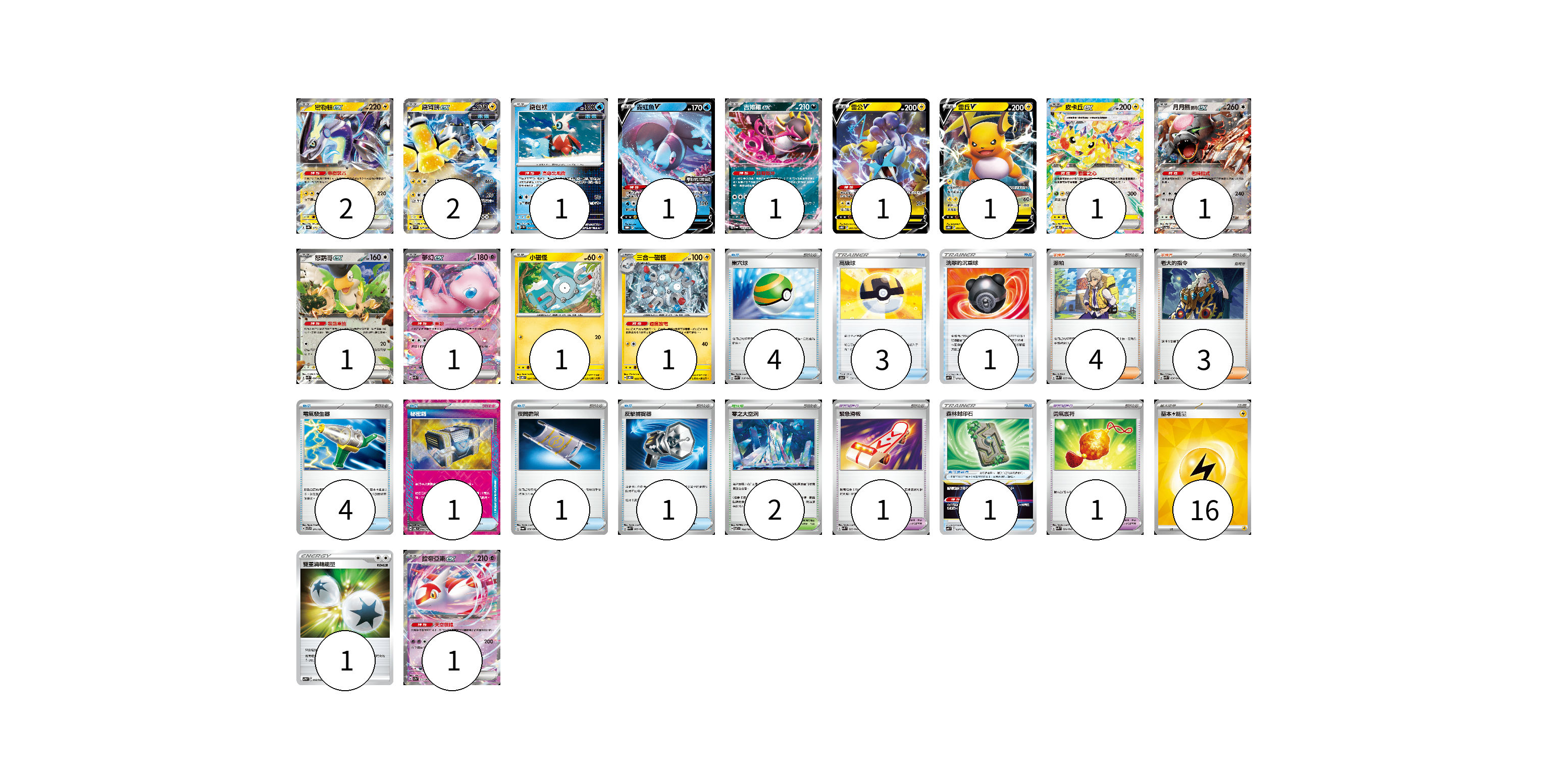 牌組構築方案 以此牌組為基礎新構築牌組 顯示卡面 顯示列表 寶可夢卡(16) 2 2 1 1 1 1 1 1 1 1 1 1 1 1 寶可夢道具(2) 1 1 物品卡(16) 4 3 1 4 1 1 1 1 支援者卡(7) 4 3 競技場卡(2) 2 能量卡(17) 16 1 寶可夢卡(16) 卡牌名稱 張數 卡牌名稱 張數 密勒頓ex SV4a 071/190 02 鐵臂膀ex SV4M 027/066 02 鐵包袱 SV4M 020/066 01 霓虹魚V SV-P 134/SV-P 01 吉雉雞ex SV6a 038/064 01 雷公V SVTR 005/021 01 雷丘V SVTR 003/021 01 皮卡丘ex SV8 033/106 01 月月熊 赫月 ex SV5a 052/066 01 怒鸚哥ex SVK 006/042 01 夢幻ex SVK 001/042 01 小磁怪 SV8 034/106 01 三合一磁怪 SV8 035/106 01 拉帝亞斯ex SV7a 019/064 01 寶可夢道具(2) 卡牌名稱 張數 卡牌名稱 張數 緊急滑板 SVK 023/042 01 勇氣護符 SVK 024/042 01 物品卡(16) 卡牌名稱 張數 卡牌名稱 張數 巢穴球 SVK 016/042 04 高級球 S12a 138/172 03 洗翠的沉重球 SVF 019/038 01 電氣發生器 SVTR 011/021 04 秘密箱 SV6 092/101 01 夜間擔架 SV6a 056/064 01 反擊捕捉器 SVK 009/042 01 森林封印石 SVF 024/038 01 支援者卡(7) 卡牌名稱 張數 卡牌名稱 張數 派帕 SVK 035/042 04 老大的指令 SVK 036/042 03 競技場卡(2) 卡牌名稱 張數 卡牌名稱 張數 零之大空洞 SV7 102/102 02 能量卡(17) 卡牌名稱 張數 卡牌名稱 張數 基本【雷】能量 SVK LIG 16 雙重渦輪能量 SVTM 022/022 01 以此牌組為基礎新構築牌組 牌組編碼 kQdEEc-hcKGtB-HihUrA copy 列印牌組單 牌組編碼已複製 分享至SNS