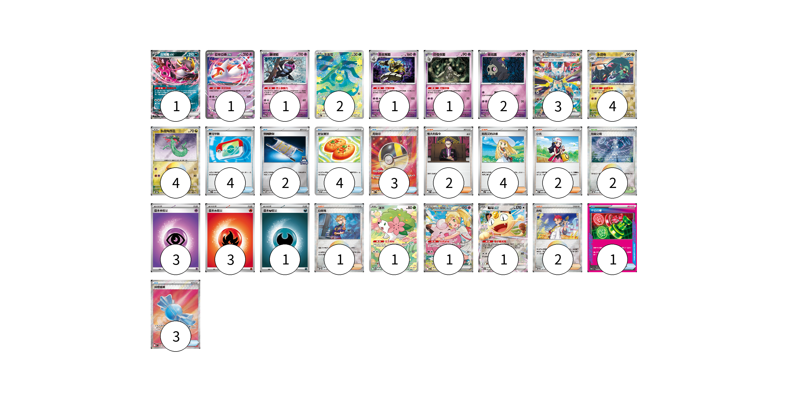 牌組構築方案 以此牌組為基礎新構築牌組 顯示卡面 顯示列表 寶可夢卡(23) 1 1 1 2 1 1 2 3 4 4 1 1 1 物品卡(17) 4 2 4 3 1 3 支援者卡(11) 2 4 2 1 2 競技場卡(2) 2 能量卡(7) 3 3 1 寶可夢卡(23) 卡牌名稱 張數 卡牌名稱 張數 吉雉雞ex M2a 114/193 01 拉帝亞斯ex MC 312/742 01 願增猿 M2a 081/193 01 含羞苞 M2a 196/193 02 黑夜魔靈 M2a 074/193 01 彷徨夜靈 M2a 073/193 01 夜巡靈 M2a 072/193 02 多龍巴魯托ex SV8a 221/187 03 多龍奇 SV8a 119/187 04 多龍梅西亞 SV8a 118/187 04 謝米 SV9a 066/063 01 莉莉艾的皮皮ex MC 765/742 01 喵喵ex M3 061/080 01 物品卡(17) 卡牌名稱 張數 卡牌名稱 張數 寶可平板 MC 662/742 04 夜間擔架 SV-P 204/SV-P 02 好友寶芬 SVTS 012/022 04 高級球 M2a 216/193 03 不公印章 MC 633/742 01 神奇糖果 M1S 082/063 03 支援者卡(11) 卡牌名稱 張數 卡牌名稱 張數 老大的指令 MC 724/742 02 莉莉艾的決意 M2a 175/193 04 小光 M2 077/080 02 白蕾雅 SV8a 176/187 01 赤松 SV8a 163/187 02 競技場卡(2) 卡牌名稱 張數 卡牌名稱 張數 阻礙之塔 SV8a 181/187 02 能量卡(7) 卡牌名稱 張數 卡牌名稱 張數 基本【超】能量 MC PSY 03 基本【火】能量 MC FIR 03 基本【惡】能量 MC DAR 01 以此牌組為基礎新構築牌組 牌組編碼 kSPPbU-zfAknJ-NPWIBY copy 列印牌組單 牌組編碼已複製 分享至SNS