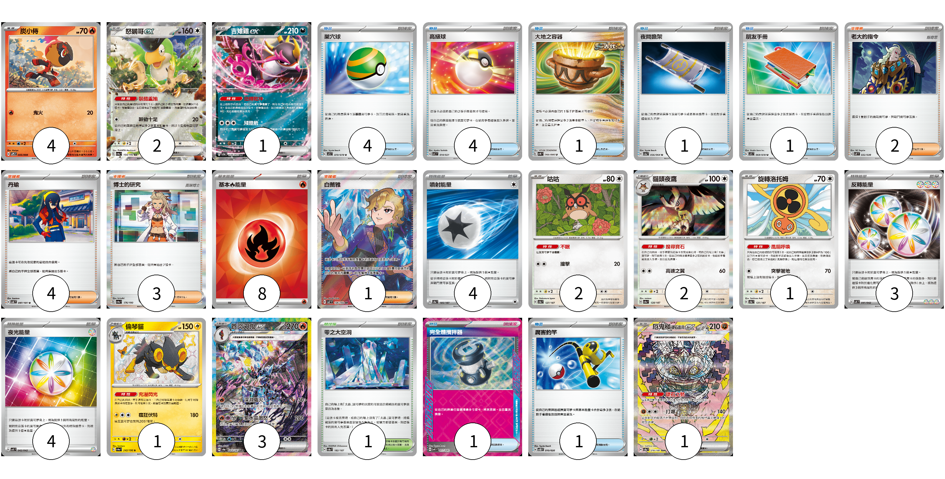 牌組構築方案 以此牌組為基礎新構築牌組 顯示卡面 顯示列表 寶可夢卡(17) 4 2 1 2 2 1 1 3 1 物品卡(13) 4 4 1 1 1 1 1 支援者卡(10) 2 4 3 1 競技場卡(1) 1 能量卡(19) 8 4 3 4 寶可夢卡(17) 卡牌名稱 張數 卡牌名稱 張數 炭小侍 SVPS 005/008 04 怒鸚哥ex SV4a 154/190 02 吉雉雞ex SV6a 038/064 01 咕咕 SV8a 127/187 02 貓頭夜鷹 SV8a 128/187 02 旋轉洛托姆 SV8a 131/187 01 倫琴貓 SV4a 242/190 01 蒼炎刃鬼ex SV8a 203/187 03 厄鬼椪 礎石面具ex SV8a 216/187 01 物品卡(13) 卡牌名稱 張數 卡牌名稱 張數 巢穴球 SV1S 070/078 04 高級球 SVC 014/021 04 大地之容器 SV4K 060/066 01 夜間擔架 SV6a 056/064 01 朋友手冊 SV1S 069/078 01 完全體攪拌器 SVK 017/042 01 厲害釣竿 SVOD 010/020 01 支援者卡(10) 卡牌名稱 張數 卡牌名稱 張數 老大的指令 SVF 032/038 02 丹瑜 SV6 097/101 04 博士的研究 SV4a 176/190 03 白蕾雅 SV7 126/102 01 競技場卡(1) 卡牌名稱 張數 卡牌名稱 張數 零之大空洞 SV8a 182/187 01 能量卡(19) 卡牌名稱 張數 卡牌名稱 張數 基本【火】能量 SVK FIR 08 噴射能量 SV8a 185/187 04 反轉能量 SVK 041/042 03 夜光能量 SVK 042/042 04 以此牌組為基礎新構築牌組 牌組編碼 kTIAeQ-yPkYOl-isvLTY copy 列印牌組單 牌組編碼已複製 分享至SNS