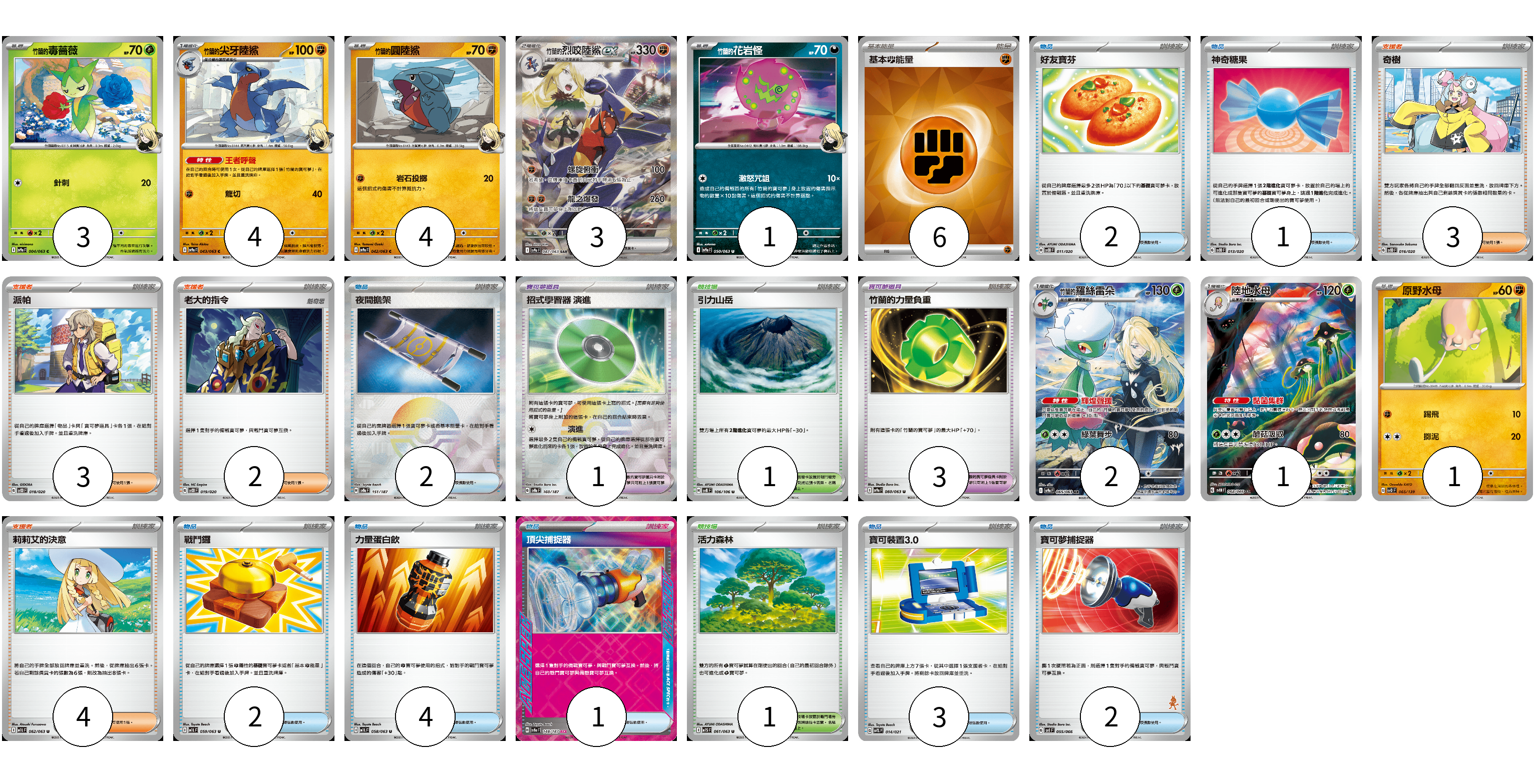 牌組構築方案 以此牌組為基礎新構築牌組 顯示卡面 顯示列表 寶可夢卡(19) 3 4 4 3 1 2 1 1 寶可夢道具(4) 1 3 物品卡(17) 2 1 2 2 4 1 3 2 支援者卡(12) 3 3 2 4 競技場卡(2) 1 1 能量卡(6) 6 寶可夢卡(19) 卡牌名稱 張數 卡牌名稱 張數 <竹蘭的>毒薔薇 SV9a 004/063 03 <竹蘭的>尖牙陸鯊 SV9a 043/063 04 <竹蘭的>圓陸鯊 SV9a 042/063 04 <竹蘭的>烈咬陸鯊ex SV9a 087/063 03 <竹蘭的>花岩怪 SV9a 050/063 01 <竹蘭的>羅絲雷朵 SV9a 065/063 02 陸地水母 SV4M 068/066 01 原野水母 SVD 065/139 01 寶可夢道具(4) 卡牌名稱 張數 卡牌名稱 張數 招式學習器 演進 SV8a 160/187 01 竹蘭的力量負重 SV9a 060/063 03 物品卡(17) 卡牌名稱 張數 卡牌名稱 張數 好友寶芬 SVOD 011/020 02 神奇糖果 SVOD 013/020 01 夜間擔架 SV8a 151/187 02 戰鬥鑼 M1L 059/063 02 力量蛋白飲 M1L 058/063 04 頂尖捕捉器 SV8a 148/187 01 寶可裝置3.0 SVTL 014/021 03 寶可夢捕捉器 SVI 055/066 02 支援者卡(12) 卡牌名稱 張數 卡牌名稱 張數 奇樹 SVOD 016/020 03 派帕 SVOD 018/020 03 老大的指令 SVOD 019/020 02 莉莉艾的決意 M1L 062/063 04 競技場卡(2) 卡牌名稱 張數 卡牌名稱 張數 引力山岳 SV8 106/106 01 活力森林 M1S 061/063 01 能量卡(6) 卡牌名稱 張數 卡牌名稱 張數 基本【鬥】能量 SVM FIG 06 以此牌組為基礎新構築牌組 牌組編碼 kUHQCp-EpoOEq-IuEnbB copy 列印牌組單 牌組編碼已複製 分享至SNS