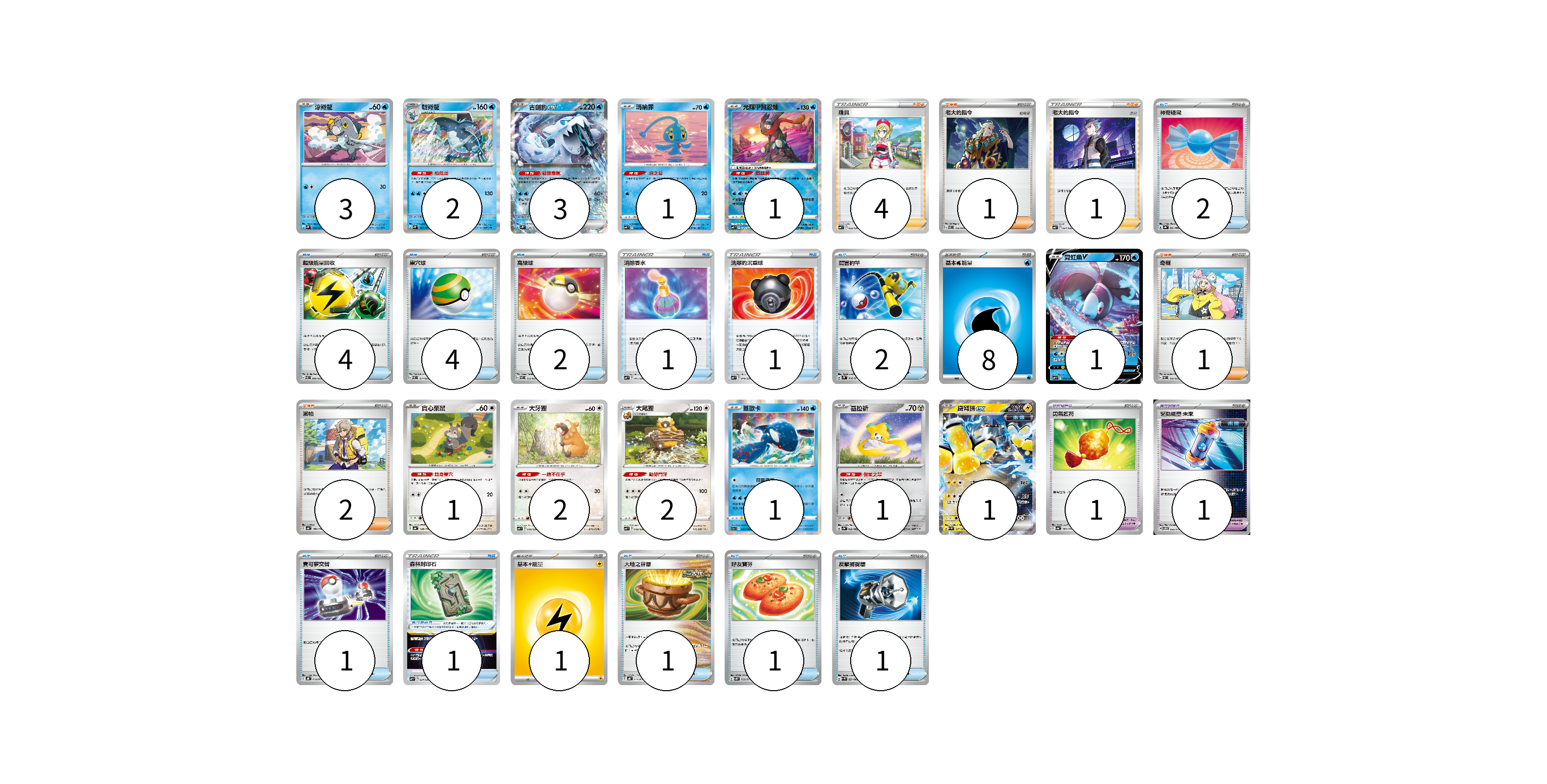 牌組構築方案 以此牌組為基礎新構築牌組 顯示卡面 顯示列表 寶可夢卡(19) 3 2 3 1 1 1 1 2 2 1 1 1 寶可夢道具(2) 1 1 物品卡(21) 2 4 4 2 1 1 2 1 1 1 1 1 支援者卡(9) 4 1 1 1 2 能量卡(9) 8 1 寶可夢卡(19) 卡牌名稱 張數 卡牌名稱 張數 涼脊龍 SV2P 024/071 03 戟脊龍 SV2P 027/071 02 古劍豹ex SV2P 028/071 03 瑪納霏 SVF 003/038 01 光輝甲賀忍蛙 SVF 004/038 01 霓虹魚V SVF 002/038 01 貪心栗鼠 SV4a 148/190 01 大牙狸 SVF 008/038 02 大尾狸 SVF 009/038 02 蓋歐卡 S11a 030/068 01 基拉祈 SV3a 042/062 01 鐵臂膀ex SV4M 027/066 01 寶可夢道具(2) 卡牌名稱 張數 卡牌名稱 張數 勇氣護符 SV4a 169/190 01 驅勁能量 未來 SV5M 065/071 01 物品卡(21) 卡牌名稱 張數 卡牌名稱 張數 神奇糖果 SV3a 053/062 02 超級能量回收 SVEL 009/020 04 巢穴球 SVEL 011/020 04 高級球 SVEL 012/020 02 消除香水 SVF 011/038 01 洗翠的沉重球 SVF 019/038 01 厲害釣竿 SV2P 066/071 02 寶可夢交替 SVHK 014/022 01 森林封印石 SVF 024/038 01 大地之容器 SVHK 011/022 01 好友寶芬 SV5K 063/071 01 反擊捕捉器 SV4M 059/066 01 支援者卡(9) 卡牌名稱 張數 卡牌名稱 張數 珠貝 SVF 025/038 04 老大的指令 SVEL 019/020 01 老大的指令(赤日) SVB 024/028 01 奇樹 SVEL 016/020 01 派帕 SV4a 180/190 02 能量卡(9) 卡牌名稱 張數 卡牌名稱 張數 基本【水】能量 SVF WAT 08 基本【雷】能量 SVHM LIG 01 以此牌組為基礎新構築牌組 牌組編碼 kVWOWJ-alSxrd-zToaGF copy 列印牌組單 牌組編碼已複製 分享至SNS