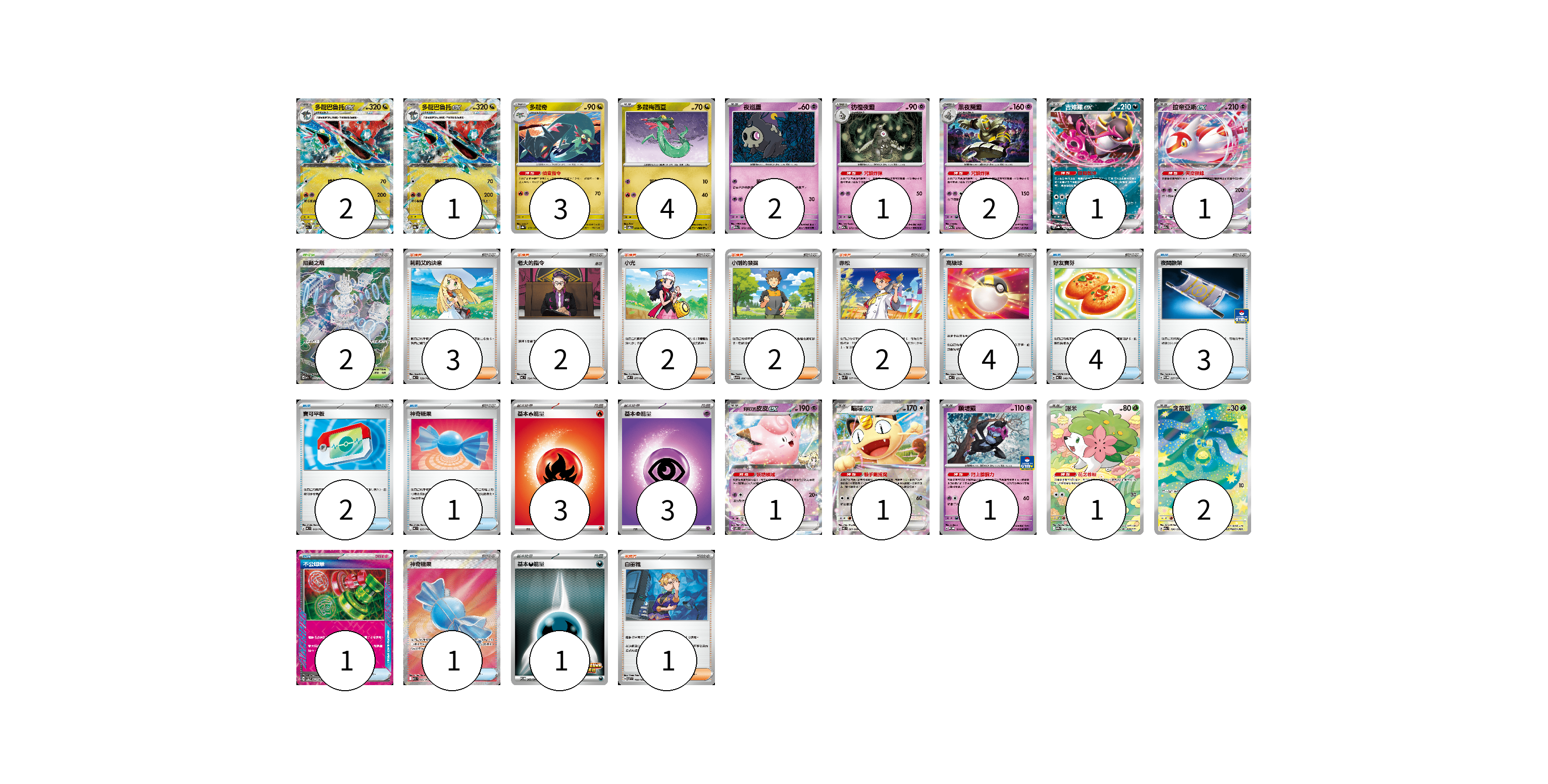 牌組構築方案 以此牌組為基礎新構築牌組 顯示卡面 顯示列表 寶可夢卡(23) 2 1 3 4 2 1 2 1 1 1 1 1 1 2 物品卡(16) 4 4 3 2 1 1 1 支援者卡(12) 3 2 2 2 2 1 競技場卡(2) 2 能量卡(7) 3 3 1 寶可夢卡(23) 卡牌名稱 張數 卡牌名稱 張數 多龍巴魯托ex M2a 134/193 02 多龍巴魯托ex SV8a 120/187 01 多龍奇 SV8a 119/187 03 多龍梅西亞 SV6 079/101 04 夜巡靈 M2a 072/193 02 彷徨夜靈 M2a 073/193 01 黑夜魔靈 M2a 074/193 02 吉雉雞ex SV8a 104/187 01 拉帝亞斯ex M2a 075/193 01 莉莉艾的皮皮ex SV9 033/100 01 喵喵ex M3 061/080 01 願增猿 M-P 014/M-P 01 謝米 SV9a 066/063 01 含羞苞 M2a 196/193 02 物品卡(16) 卡牌名稱 張數 卡牌名稱 張數 高級球 MC 651/742 04 好友寶芬 MC 648/742 04 夜間擔架 SV-P 227/SV-P 03 寶可平板 MC 662/742 02 神奇糖果 MC 655/742 01 不公印章 SV5a 053/066 01 神奇糖果 M1S 082/063 01 支援者卡(12) 卡牌名稱 張數 卡牌名稱 張數 莉莉艾的決意 MC 729/742 03 老大的指令 MC 724/742 02 小光 M2 077/080 02 小剛的發掘 SV9 096/100 02 赤松 SVK 027/042 02 白蕾雅 SV7 100/102 01 競技場卡(2) 卡牌名稱 張數 卡牌名稱 張數 阻礙之塔 M2a 222/193 02 能量卡(7) 卡牌名稱 張數 卡牌名稱 張數 基本【火】能量 MC FIR 03 基本【超】能量 MC PSY 03 基本【惡】能量 SV-P 263/SV-P 01 以此牌組為基礎新構築牌組 牌組編碼 kWEgix-GdSGvv-yuruhH copy 列印牌組單 牌組編碼已複製 分享至SNS